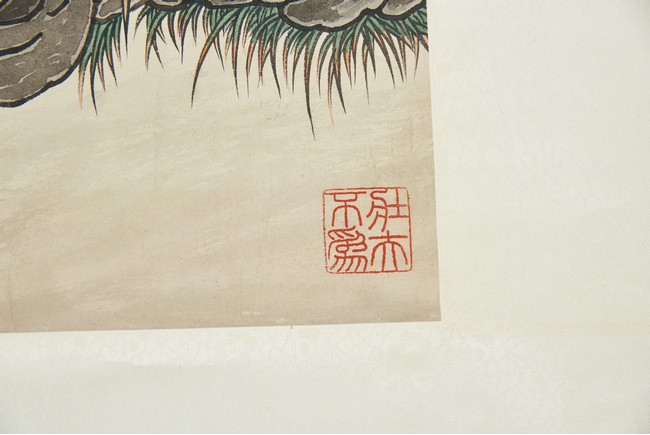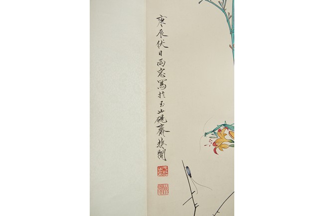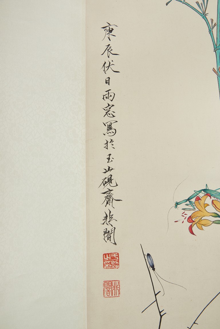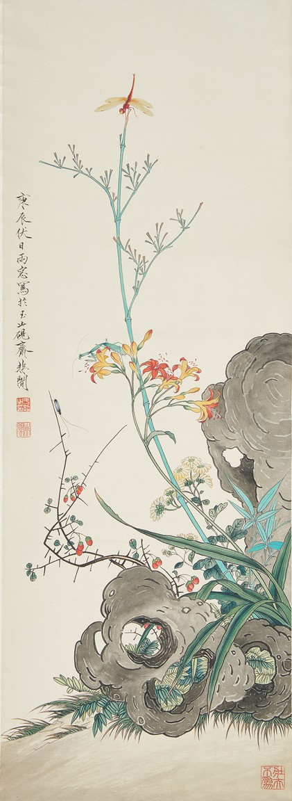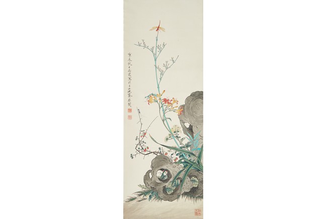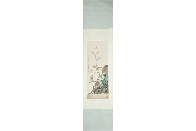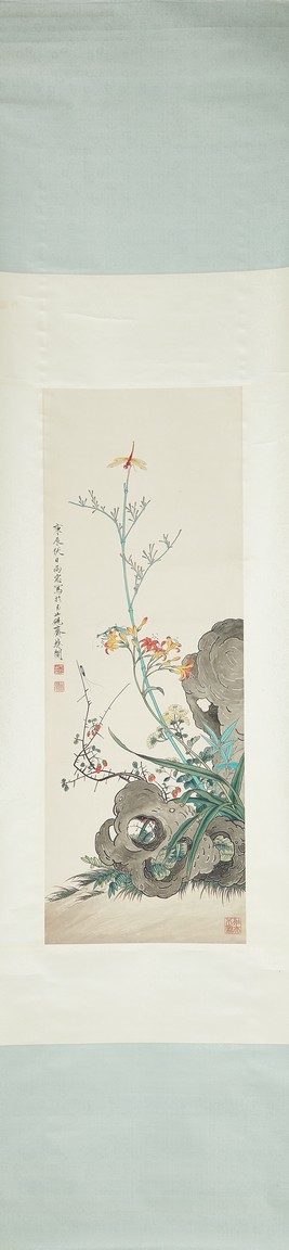 Ink and color on paper. Dragonfly and flowers. Hanging scroll. Inscribed and signed Feian with three seals of the artist.
