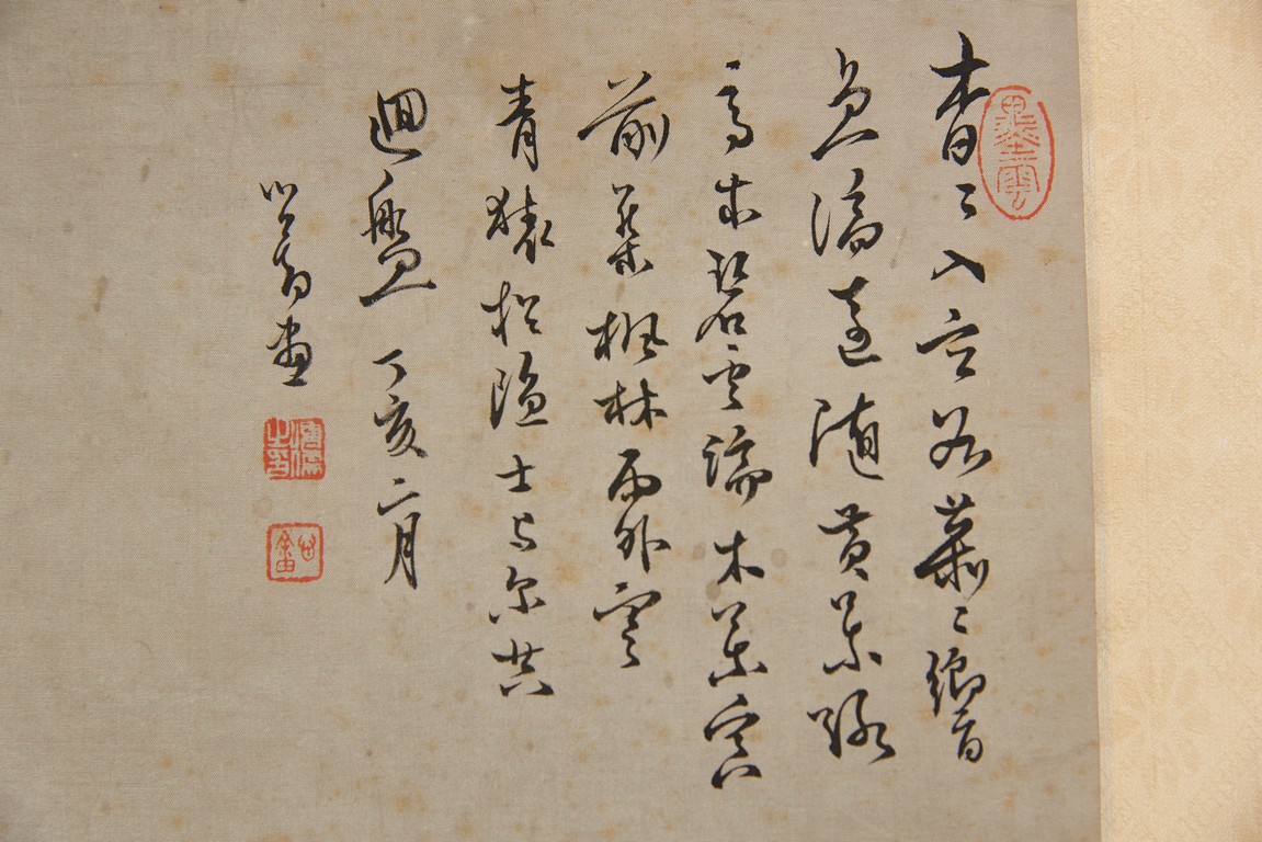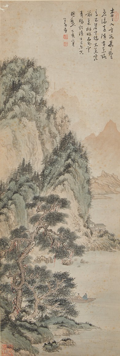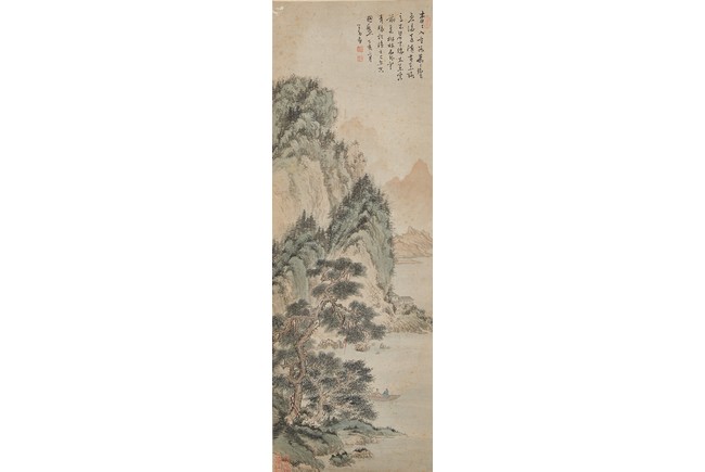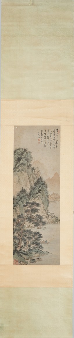 Ink and color on silk. Landscape. Hanging scroll. Inscribed and signed with four seals of the artist.