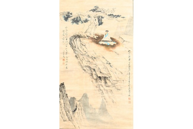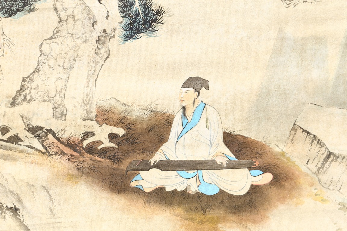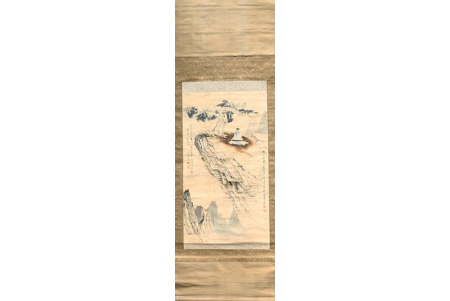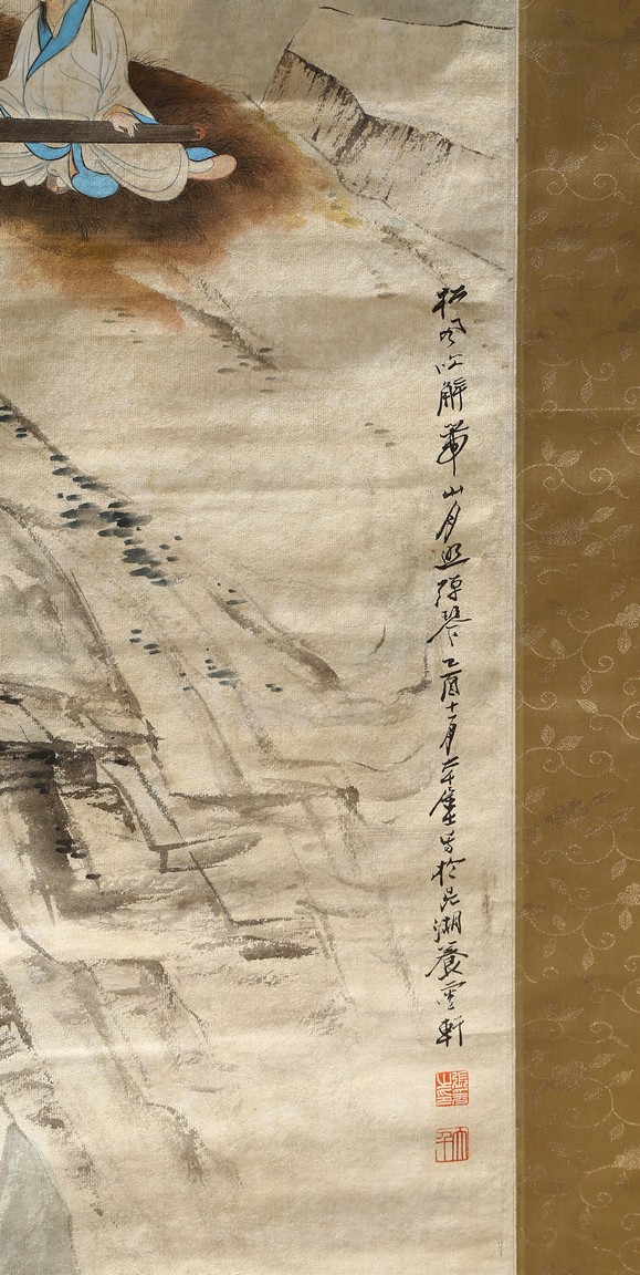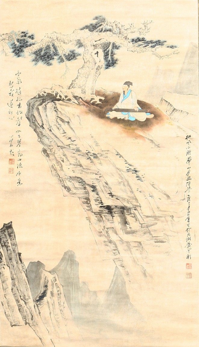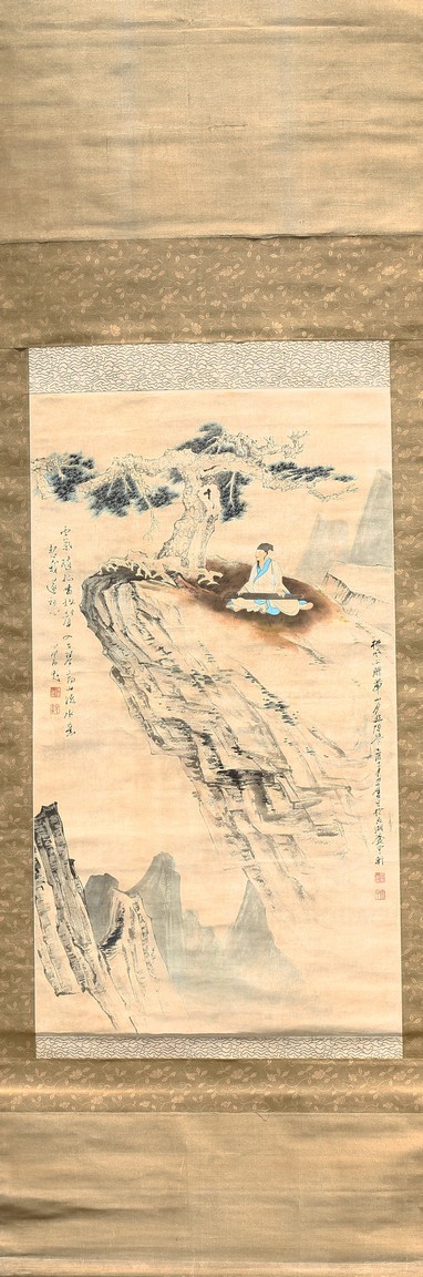 Ink and color on paper. Literati figure. Hanging Scroll. Paint inscribed and signed with four seals of the artist.