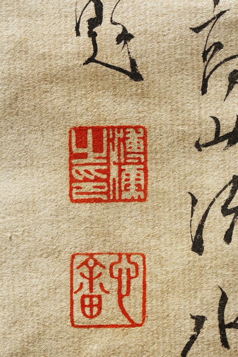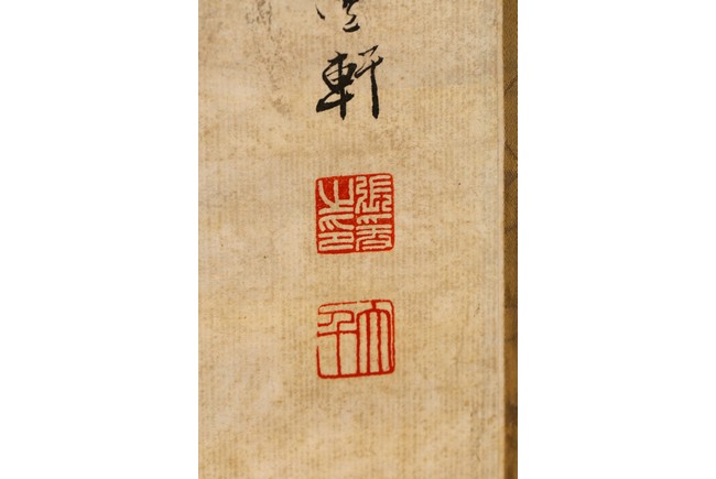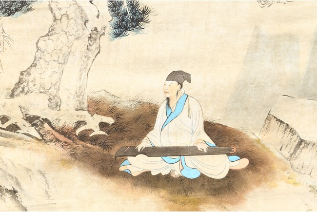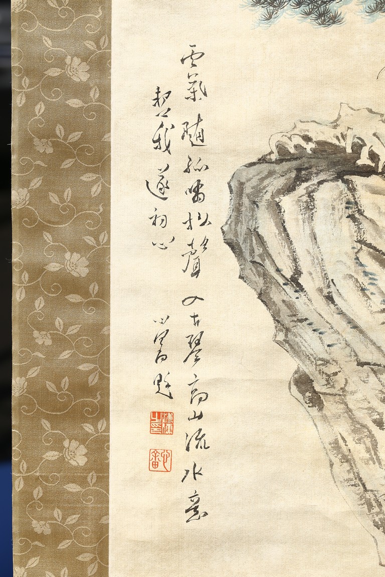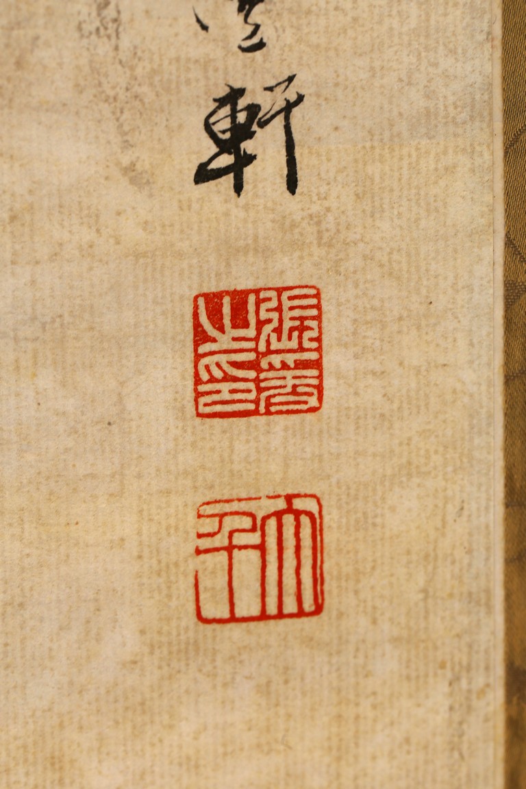 Ink and color on paper. Literati figure. Hanging Scroll. Paint inscribed and signed with four seals of the artist.