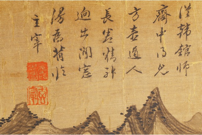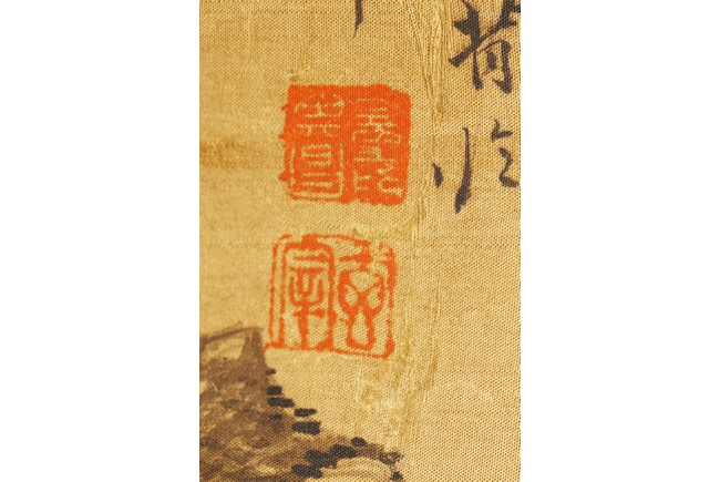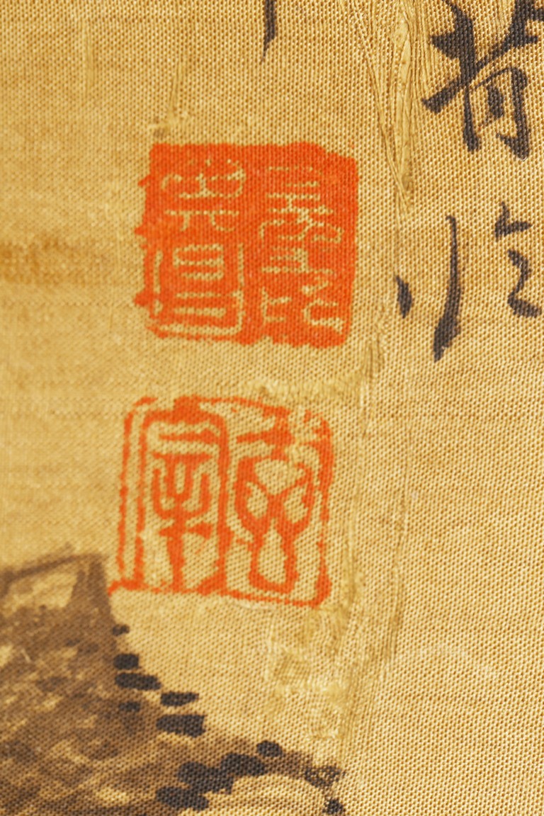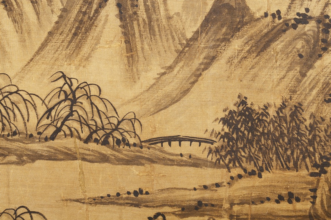 Ink on silk. Landscape. Handscroll. Inscribed and signed with six seals of the artist.