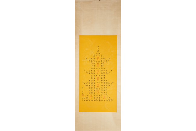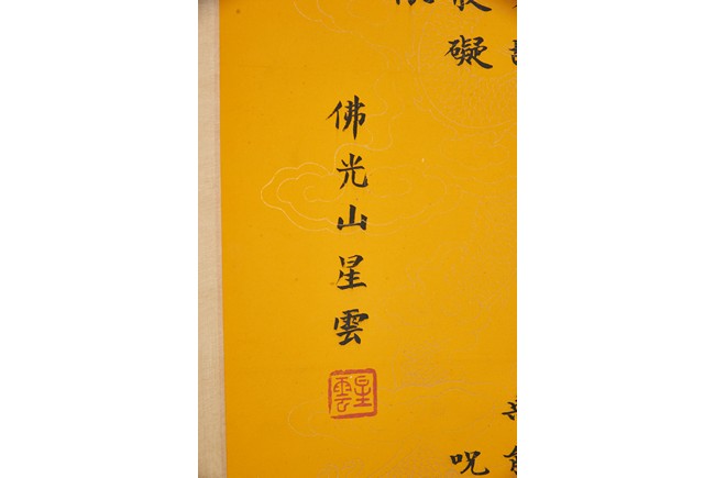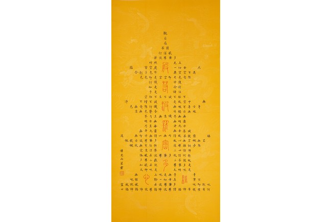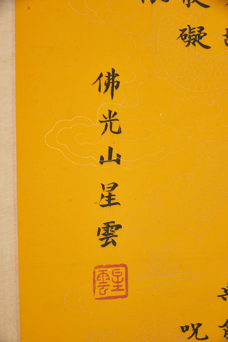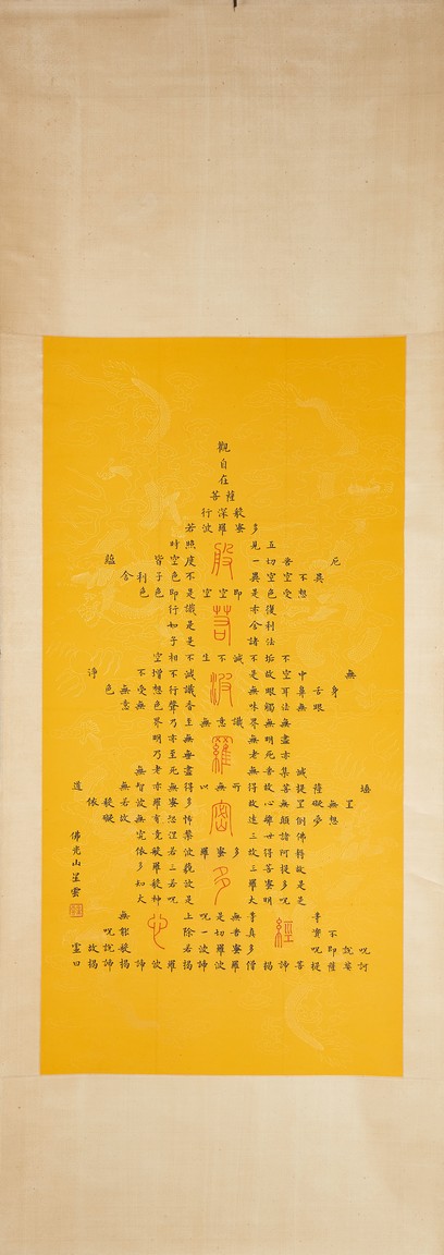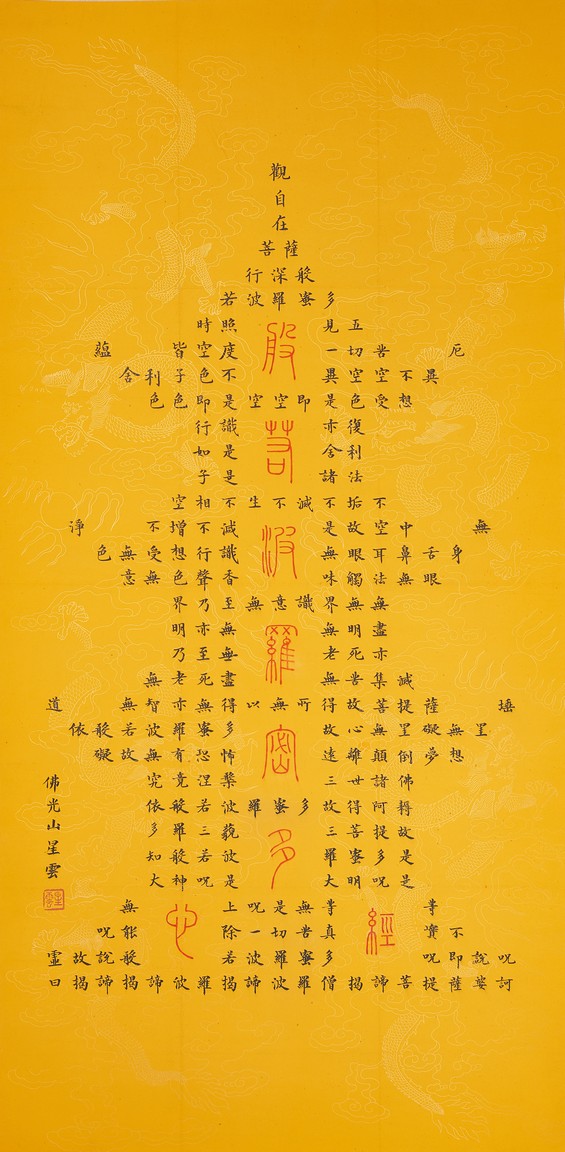 Ink on paper. Calligraphy of Heart Sutra. Hanging scroll. Inscribed and signed Xingyun with seal of the artist.