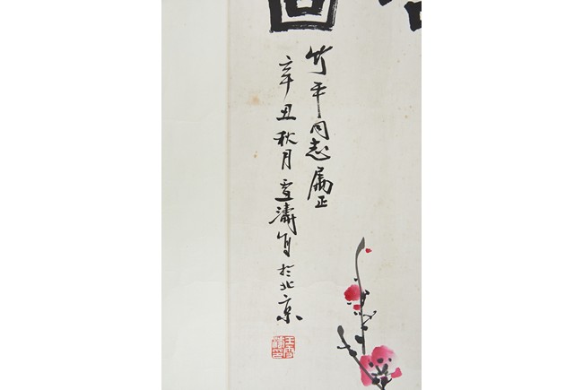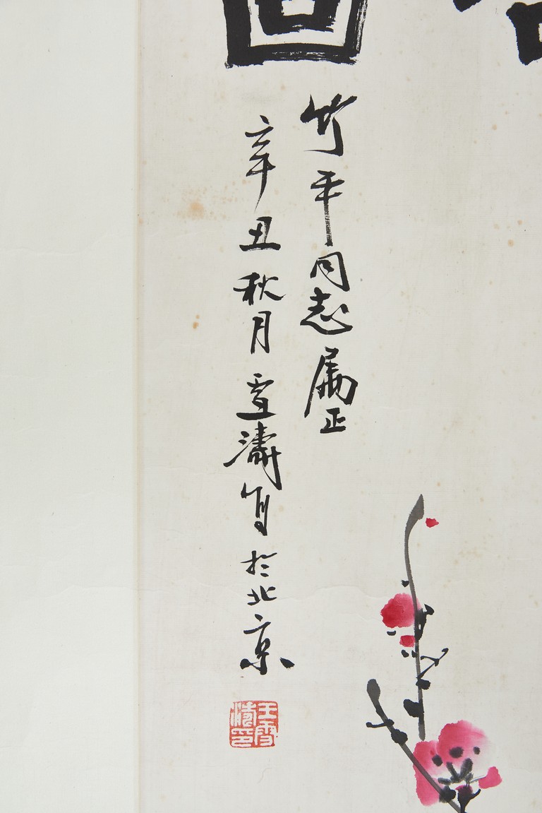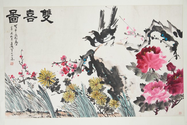 Ink and color on paper. Birds and flowers. Mounted on paper. Inscribed and signed Wang Xuetao with two seals of the artist.