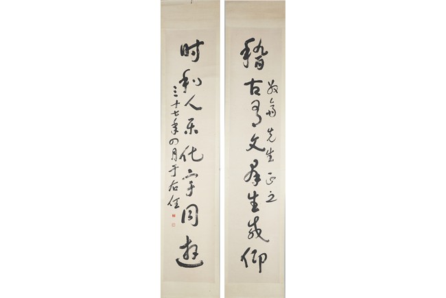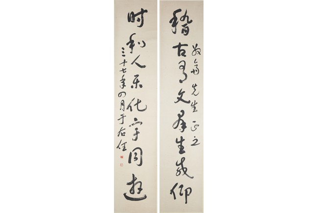 Ink on paper. The couplet calligraphy. Hanging scroll. Inscribed and signed Yu Youren with two seals of the artist.