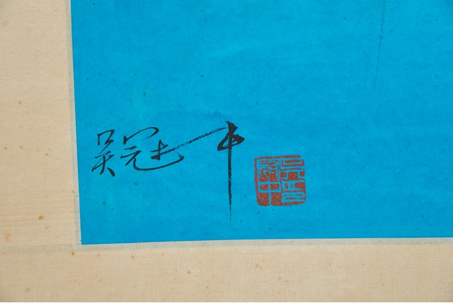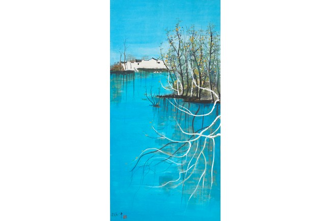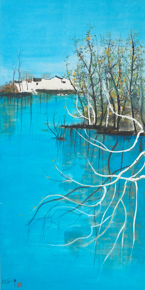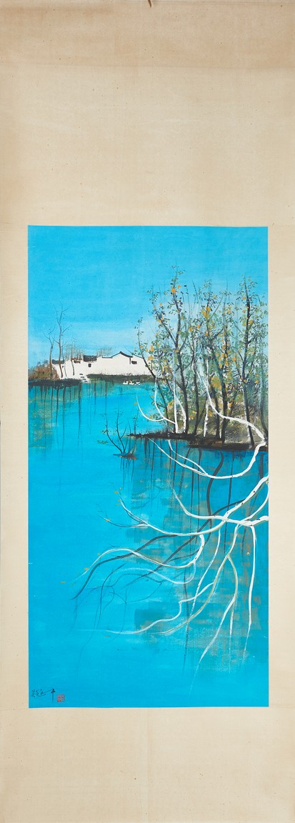 Ink and color on paper. Riverscape. Hanging scroll. Inscribed and signed Wu Guanzhong with seal of the artist.