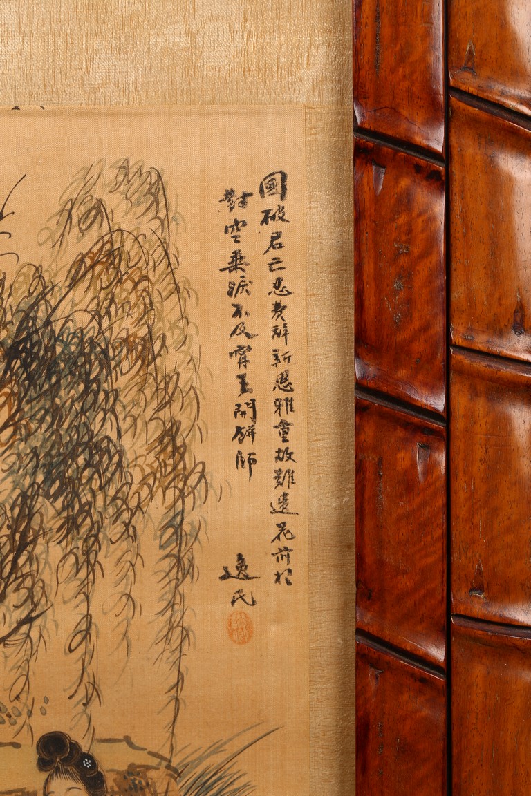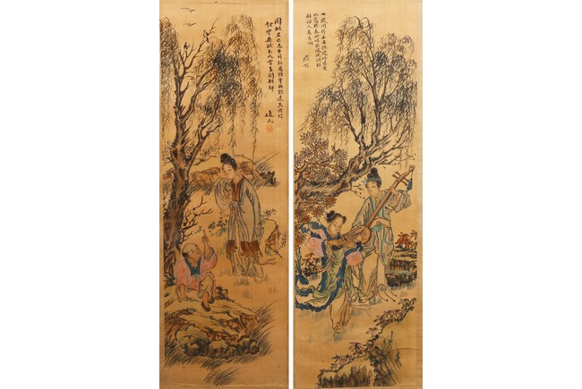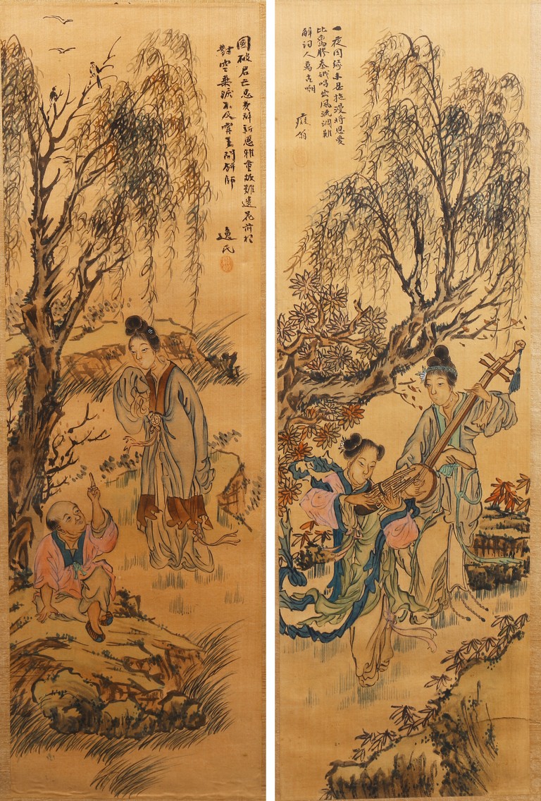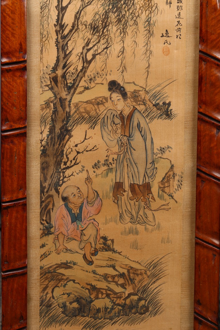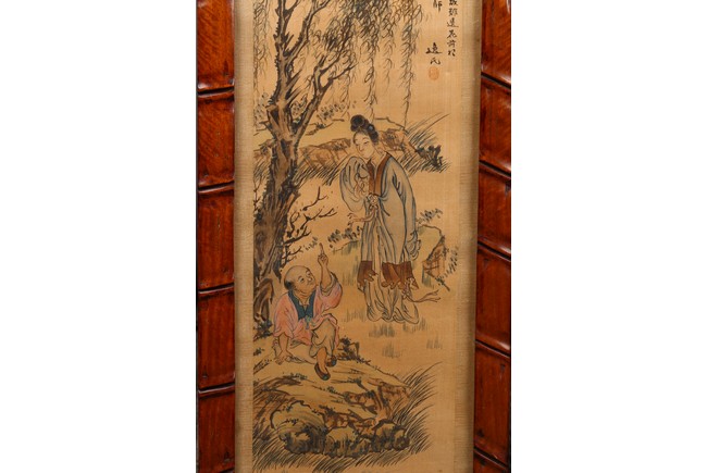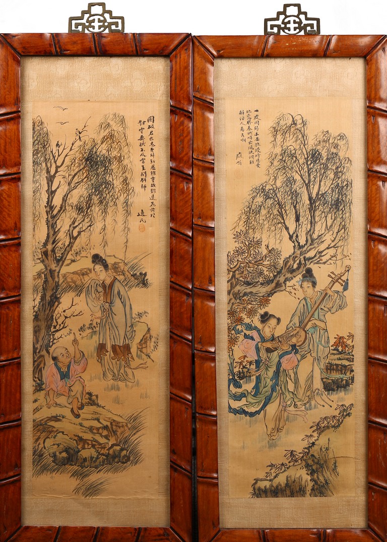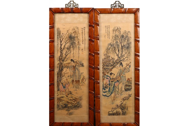 Each ink on silk painting depicting lady and her child, with inscription and signed Yi Shi, all with huali wood frame. Late Qing Dynasty period.