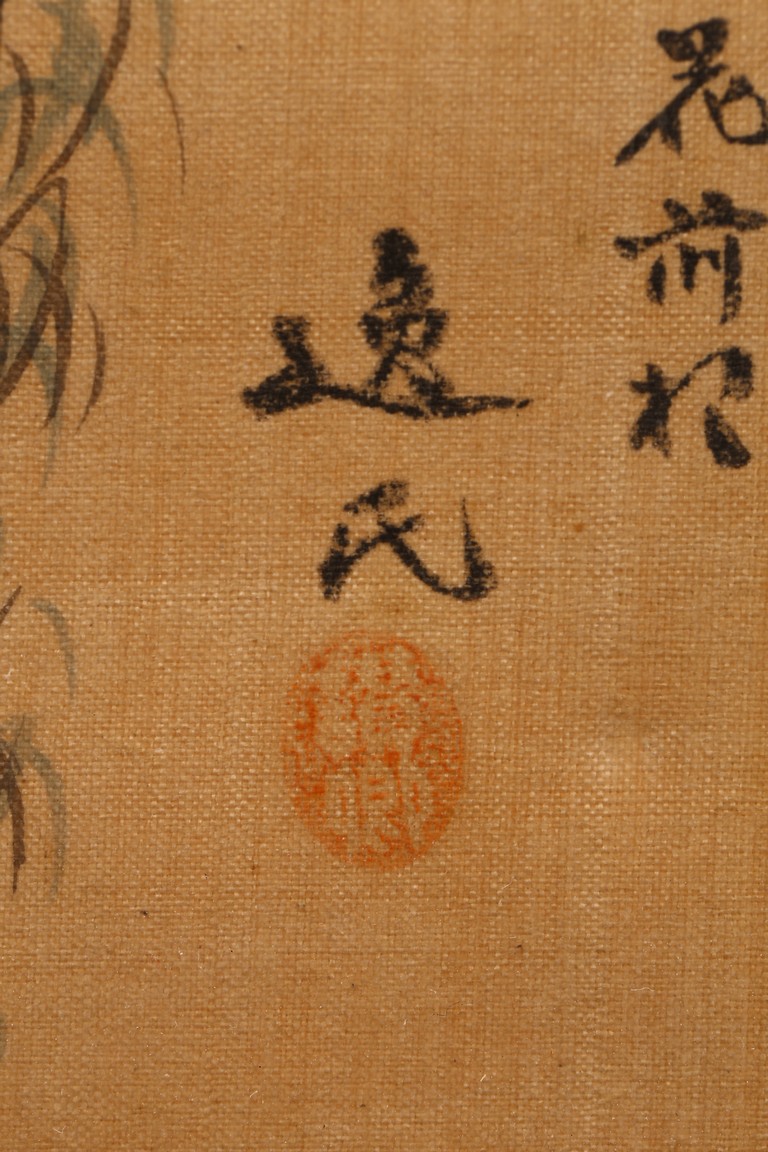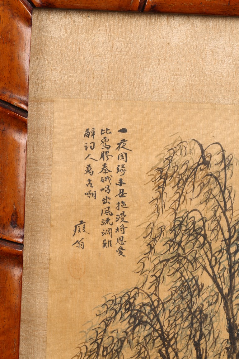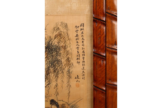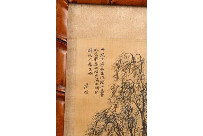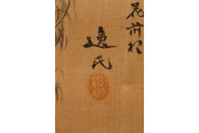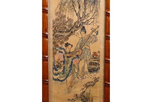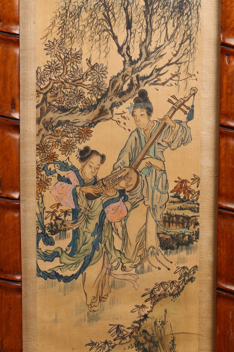Each ink on silk painting depicting lady and her child, with inscription and signed Yi Shi, all with huali wood frame. Late Qing Dynasty period.