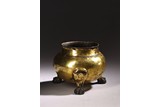 AN ARCHAIC GILT BRONZE GLOBULAR TRIPOD CENSER