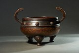 A BRONZE TWO-HANDLED TRIPOD CENSER