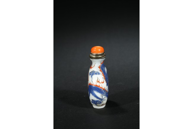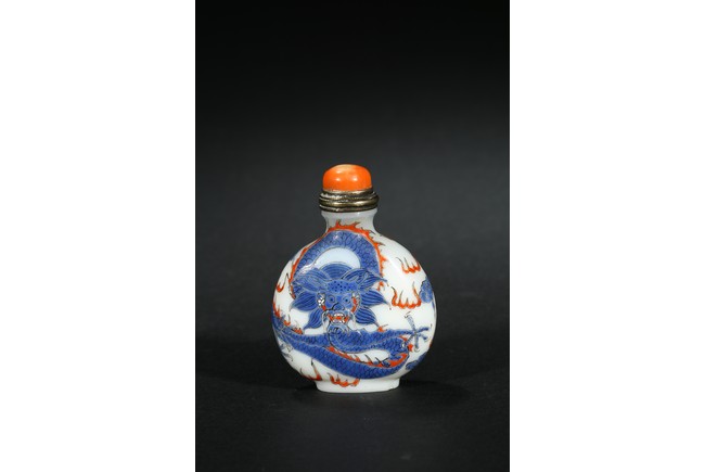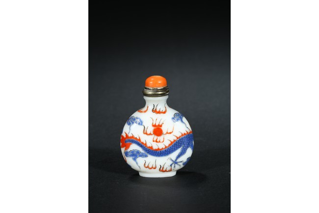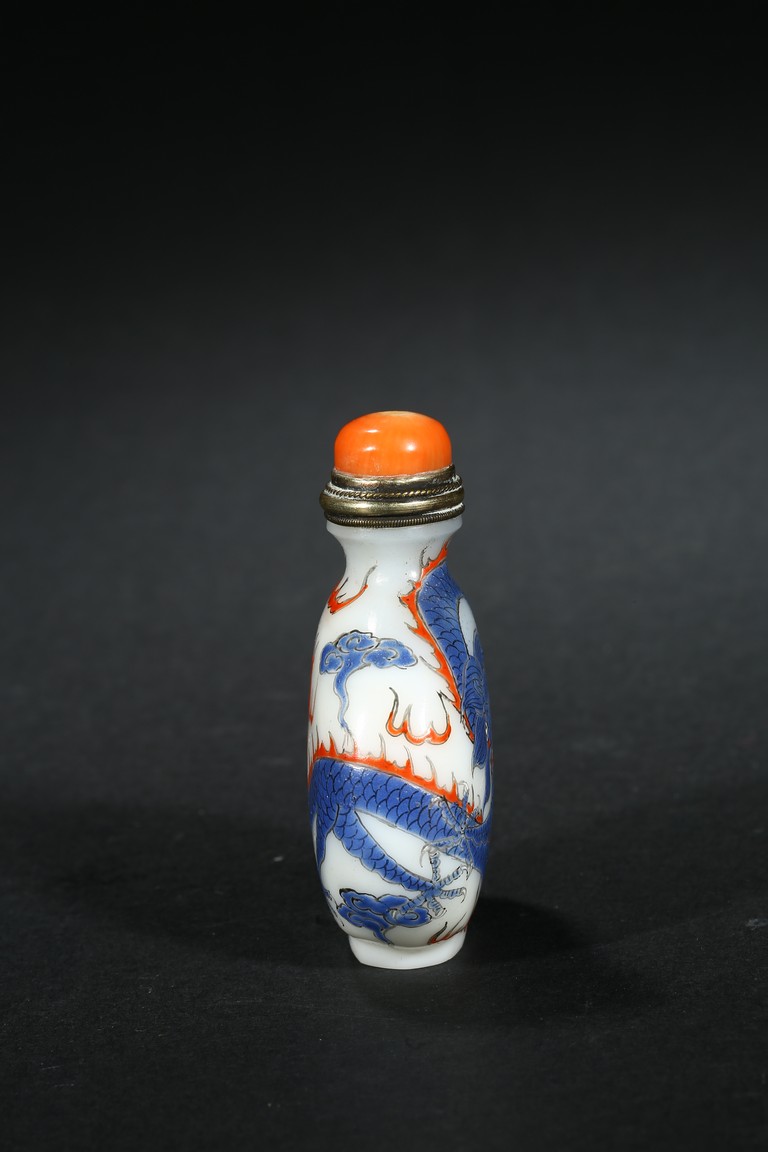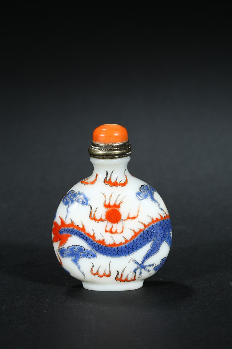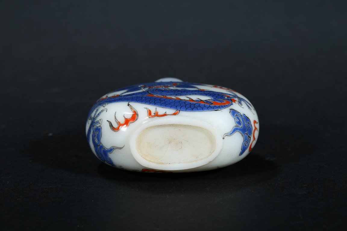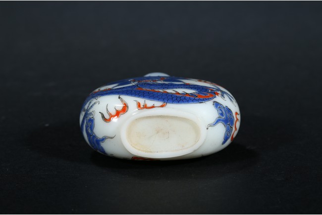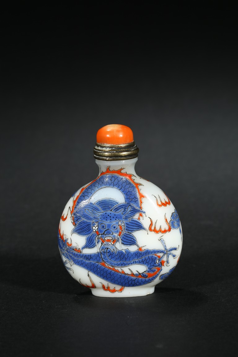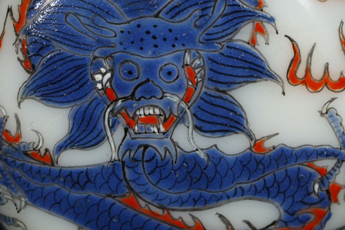 White opaque glass. Exterior painted in blue and red enamel to depict a ferocious dragon chasing flaming pearl.