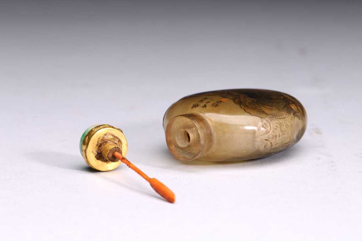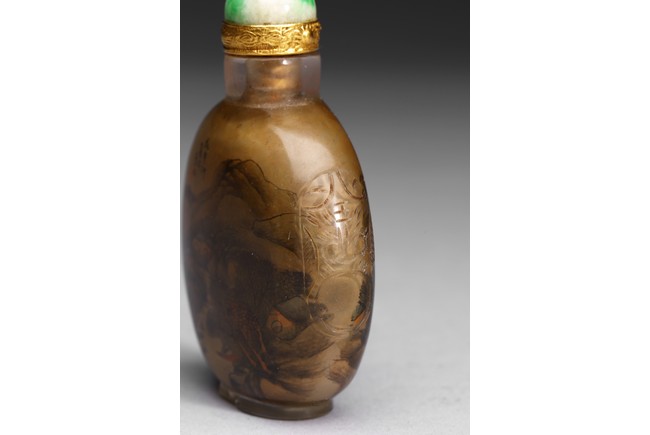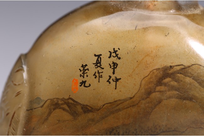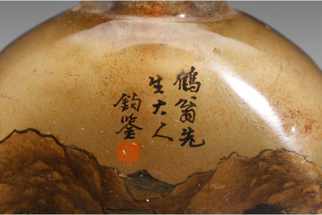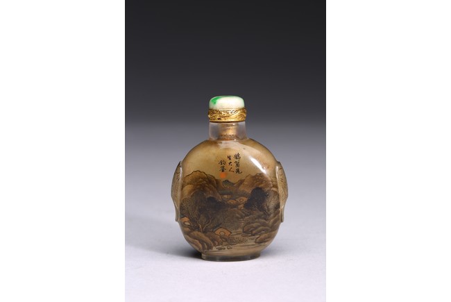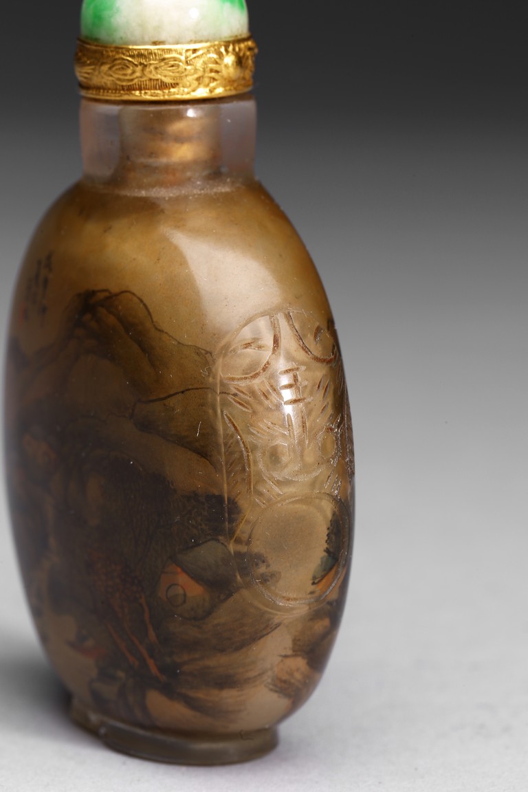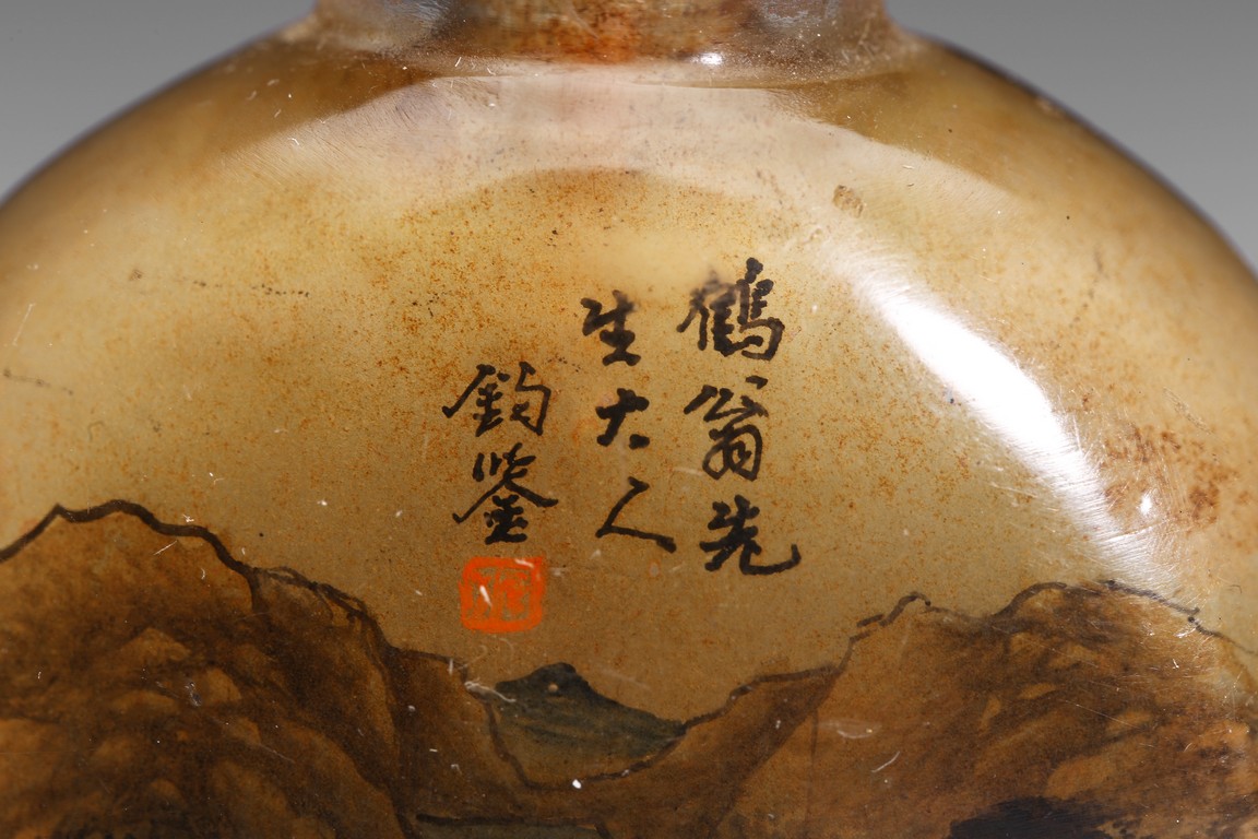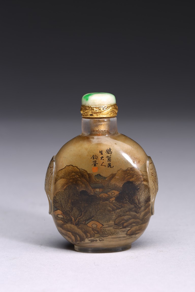Late 19th/early 20th century. Inside-painted with landscape to the front and reverse, inscribed and signed Rong Jiu attributed to Mr.He Weng, with one seal mark, completed with a jadeite stopper.