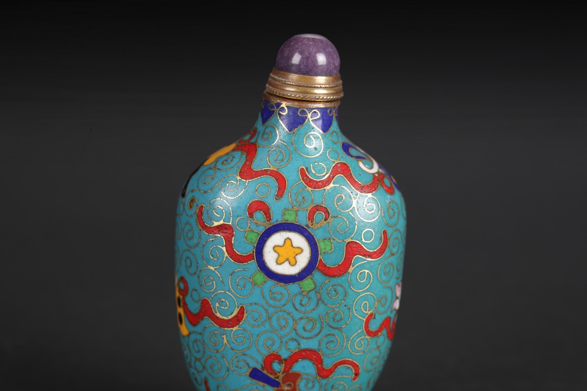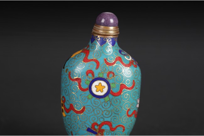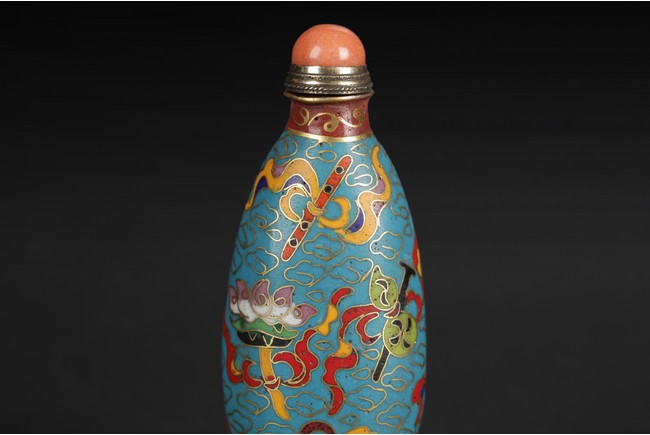 One snuff bottle of long oval shape with coral stopper, the other snuff bottle of flattened oval shape, with a purple stone stopper. Both snuff bottles depict the Eight Treasures on its body, amidst cloud or circular patterns.
