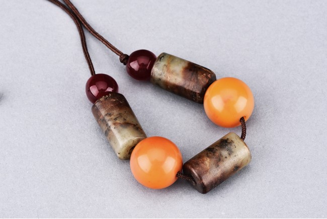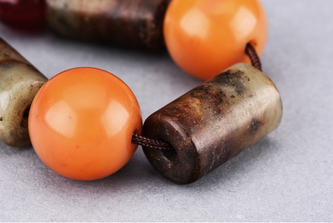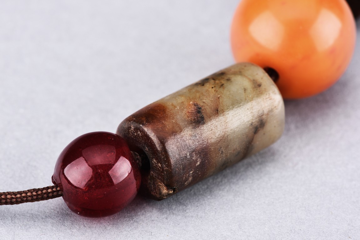 17th century or earlier (jade). Comprising of three cylindrical archaic jade carvings and two amber beads.