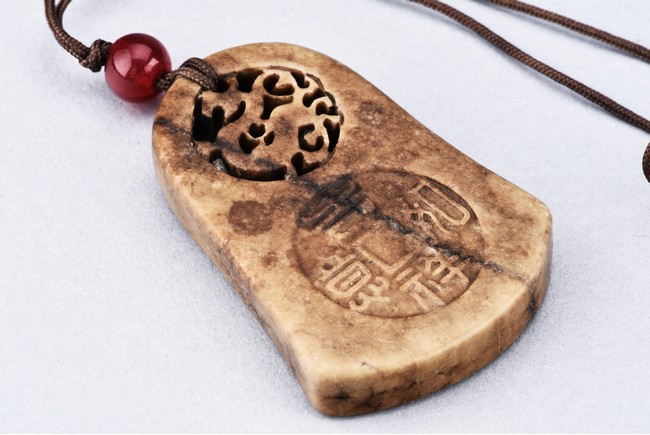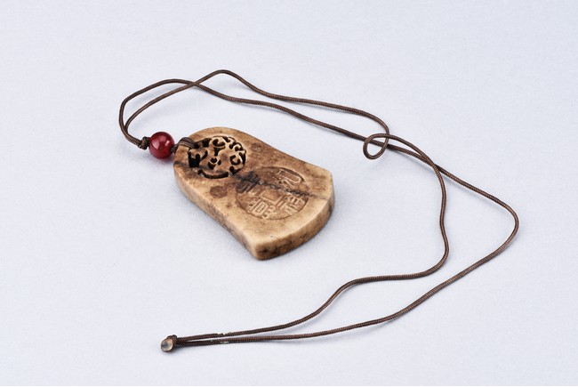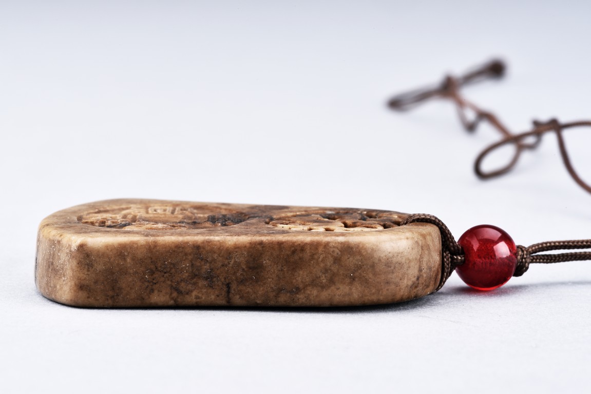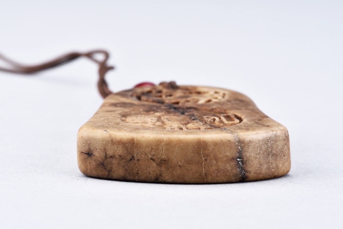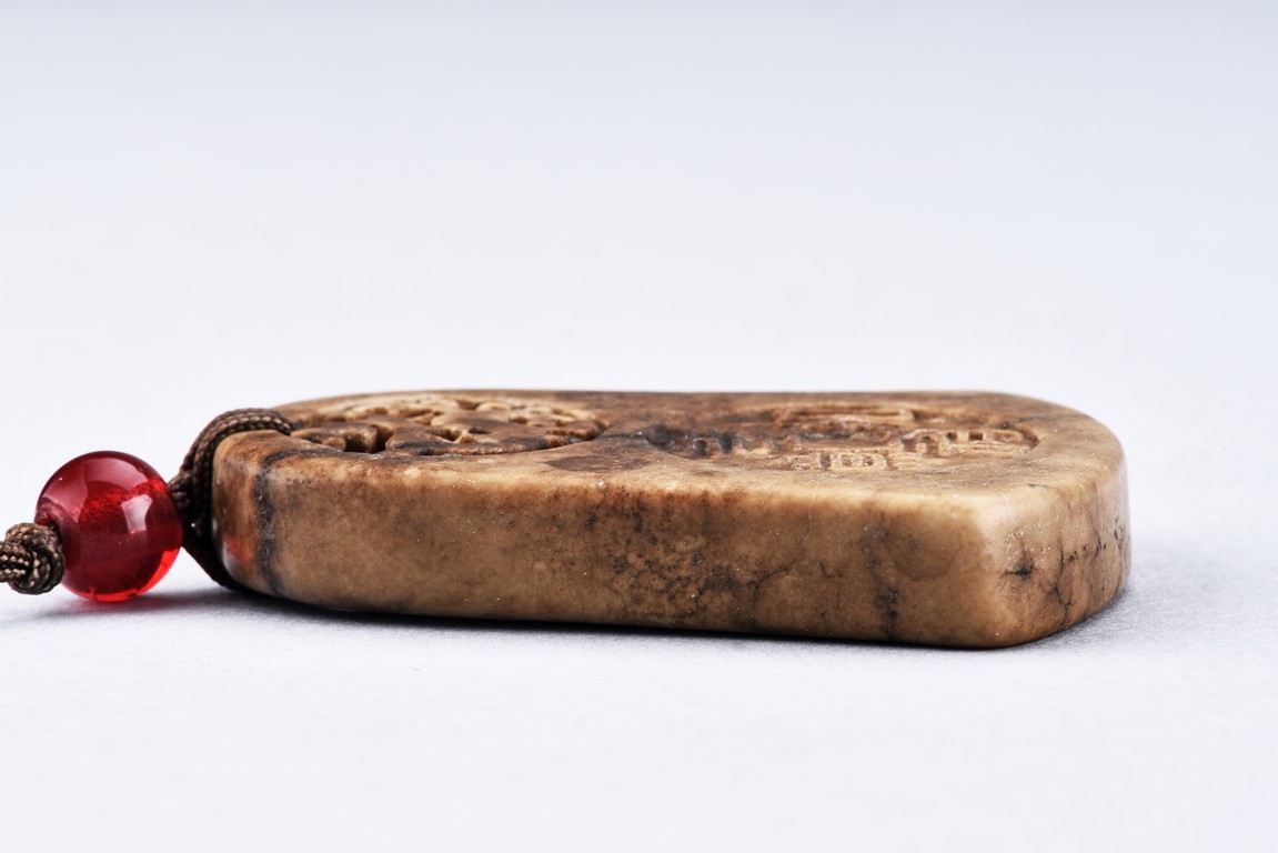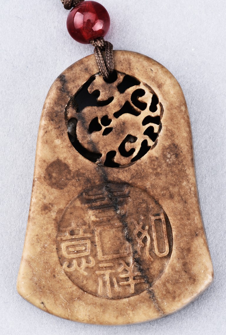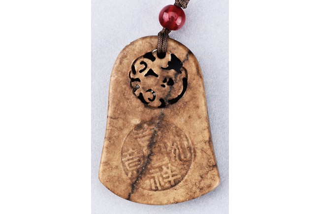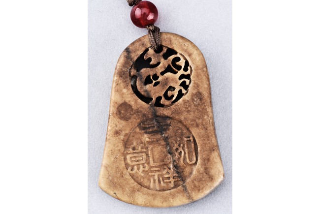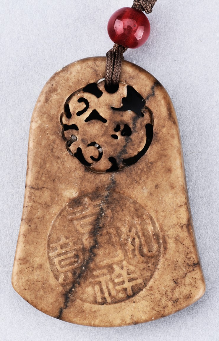 A JADE CARVED 'FORTUNE' PENDANT 玉雕如意吉祥鐘形掛墜