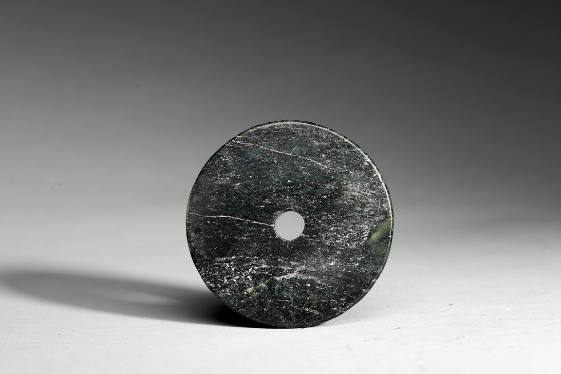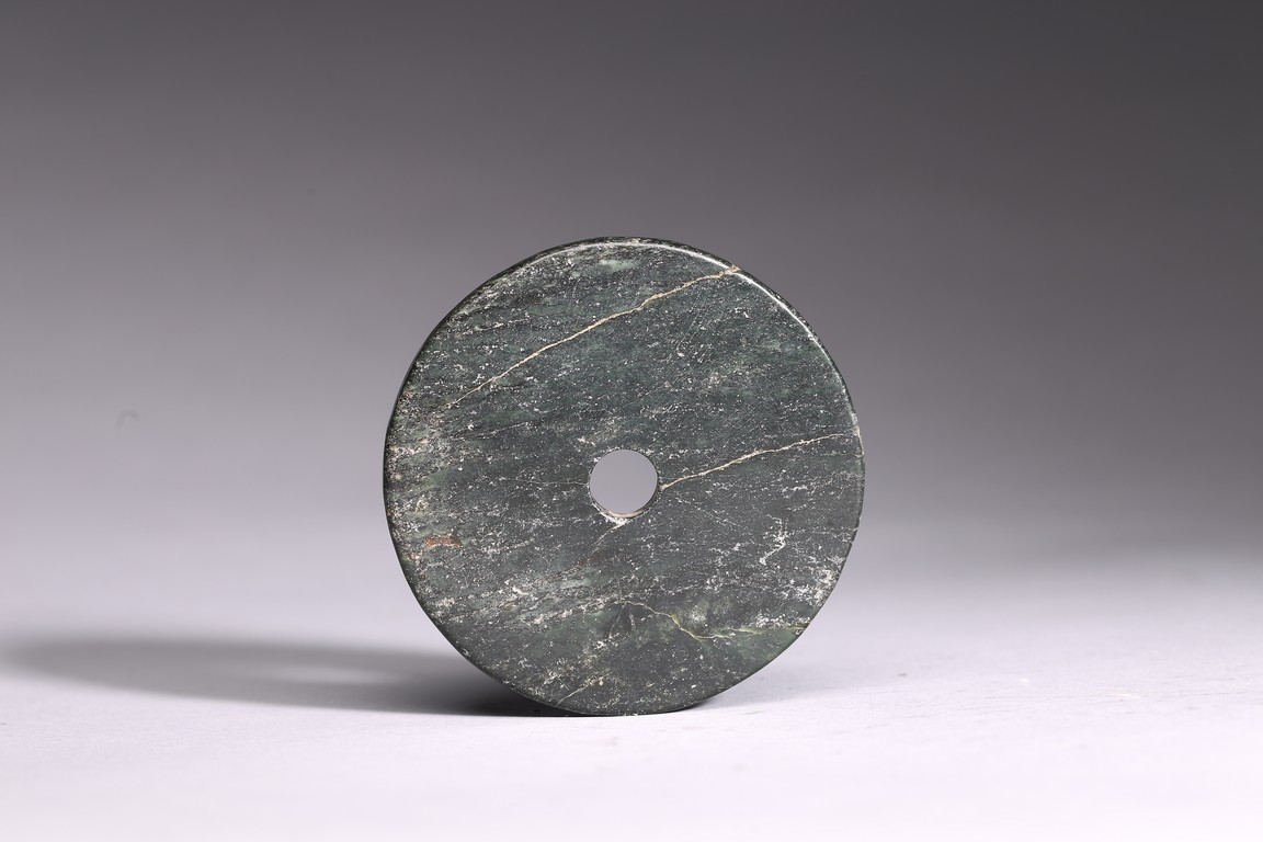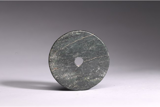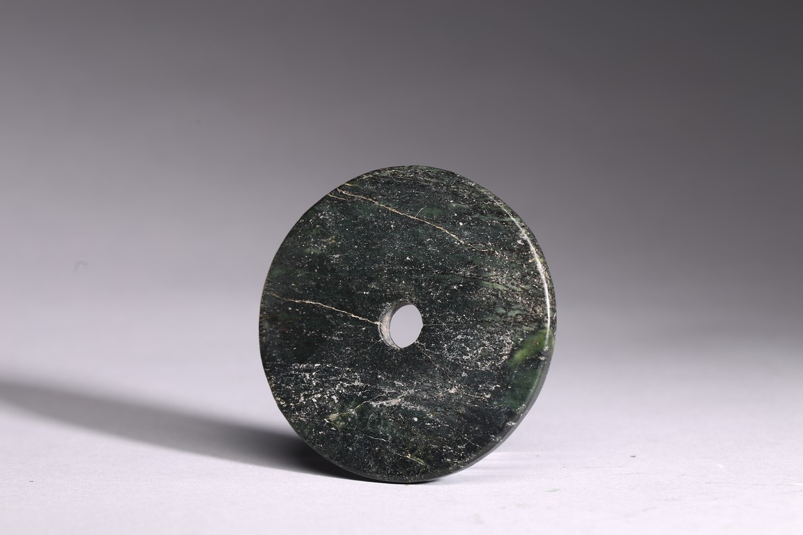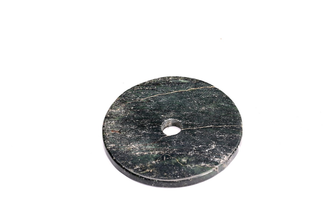 17th century or earlier. Circular shape with a small aperture at the center. Of opaque black and spinach green tone.