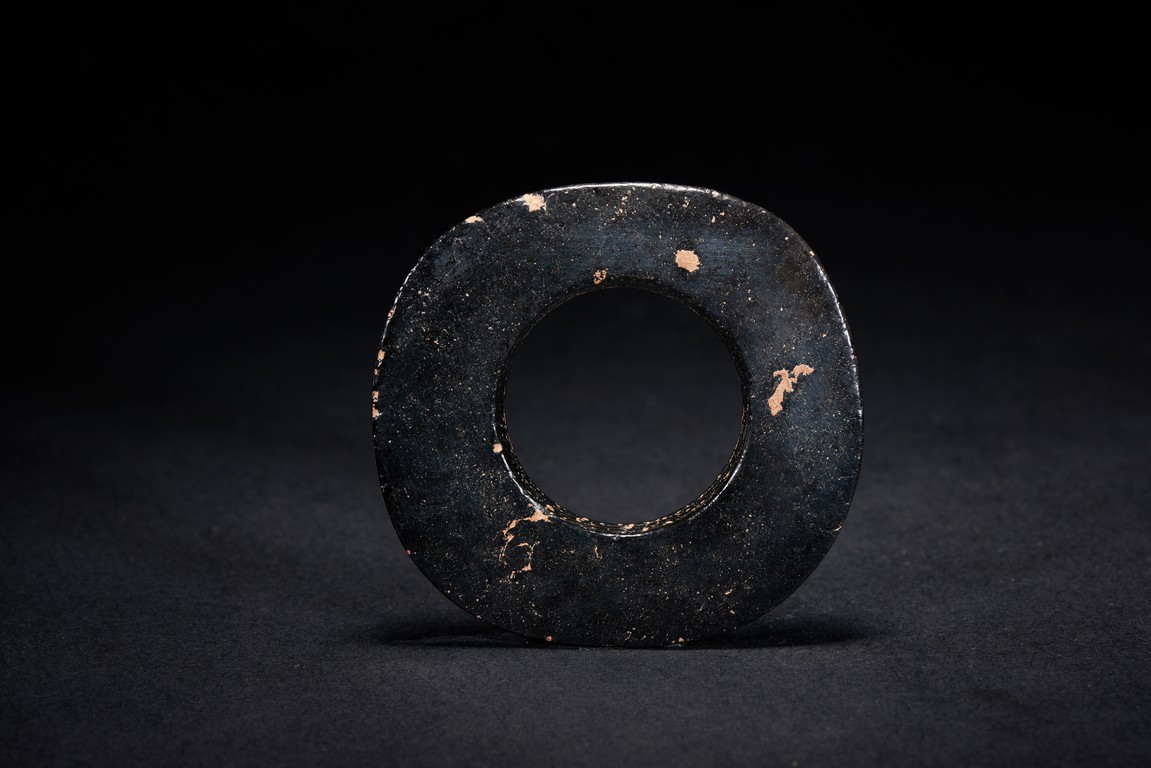 Possibly from Qijia culture (2200 BC – 1600 BC). The disc with a circular aperture drilled at center, the stone is of opaque black tone with scattered buff marks.