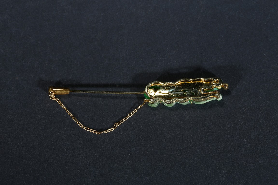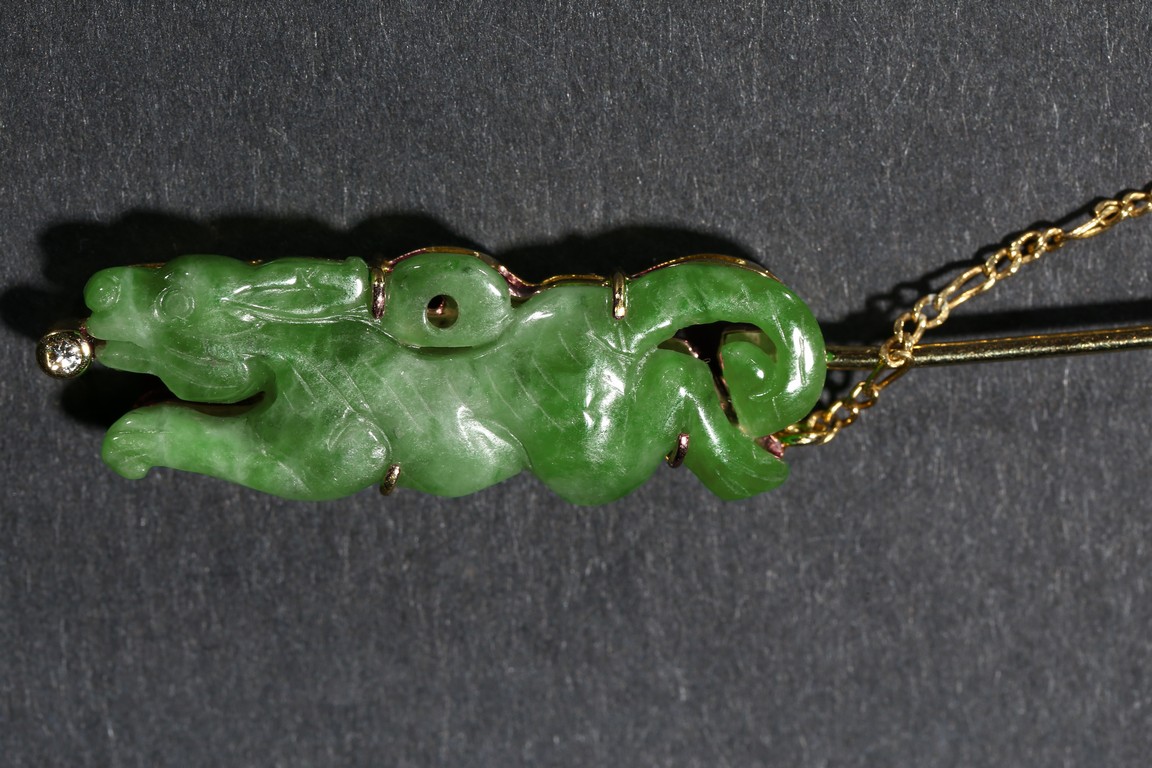 Carved to depict a running rabbit. The stone is of polished mottled green and white tone with high translucency.