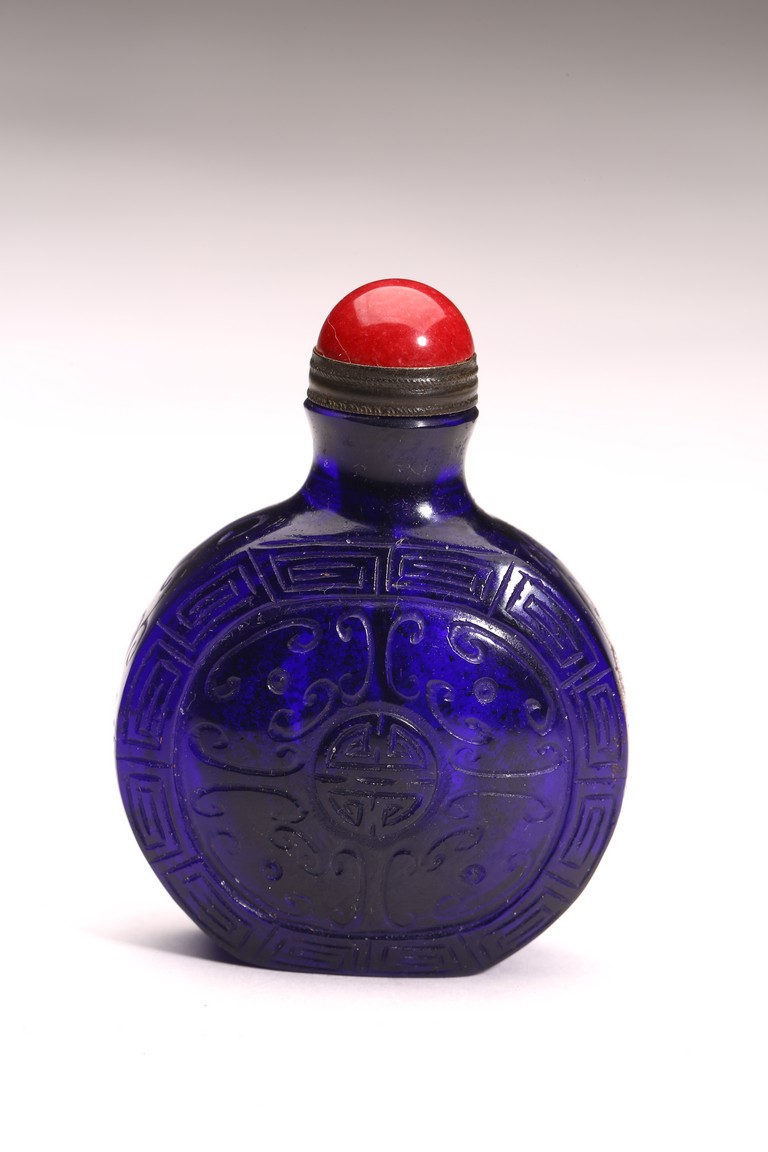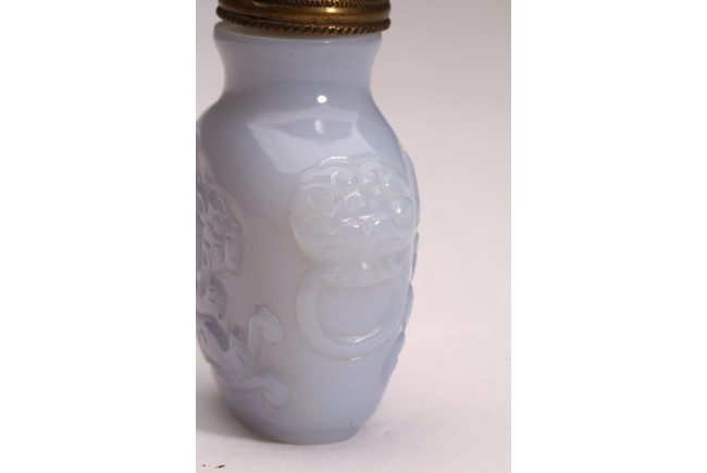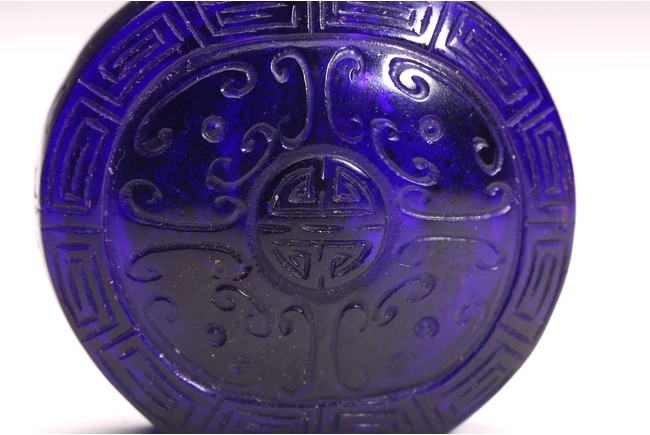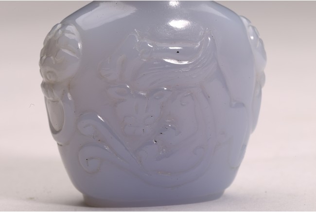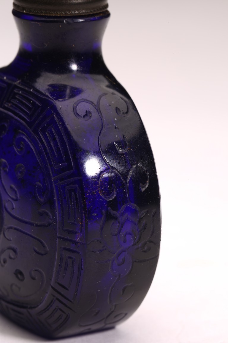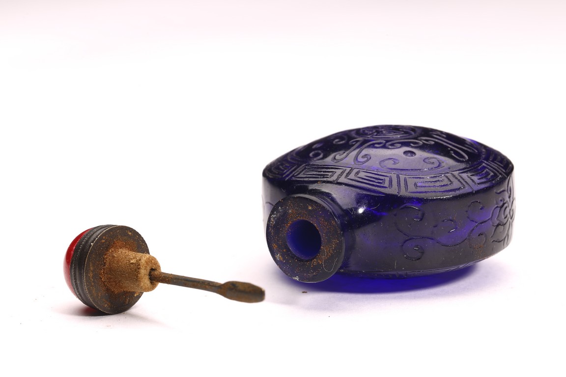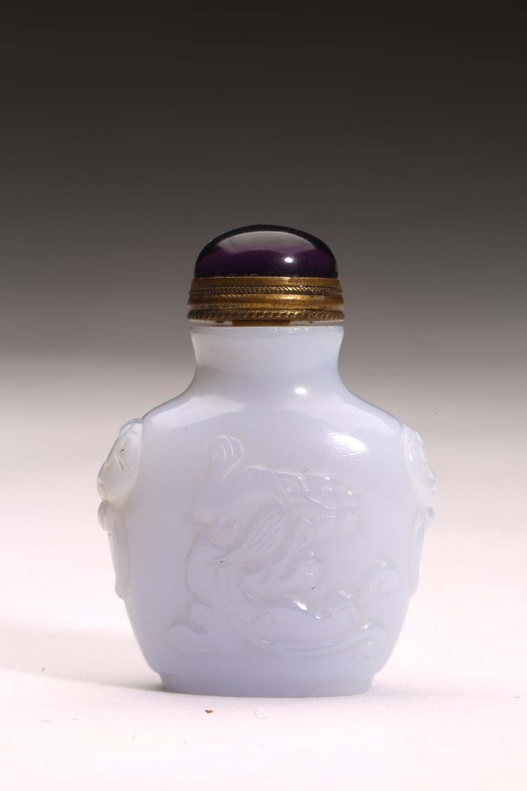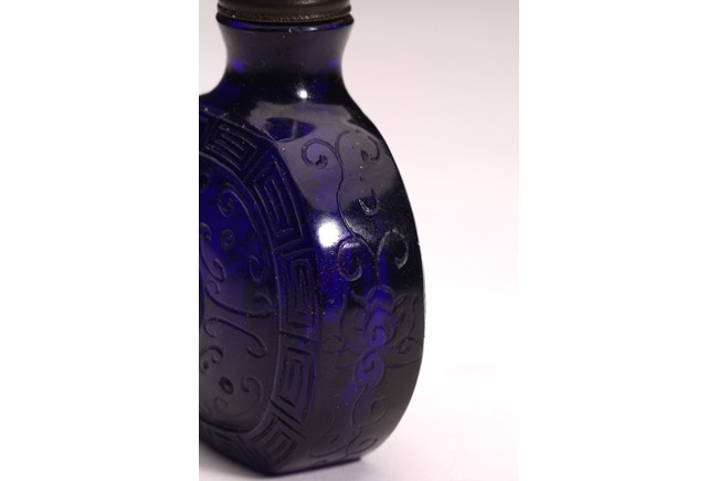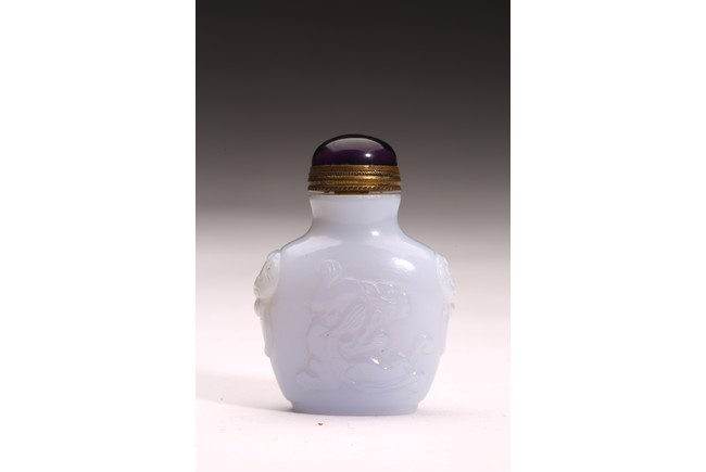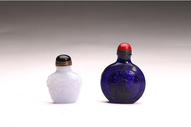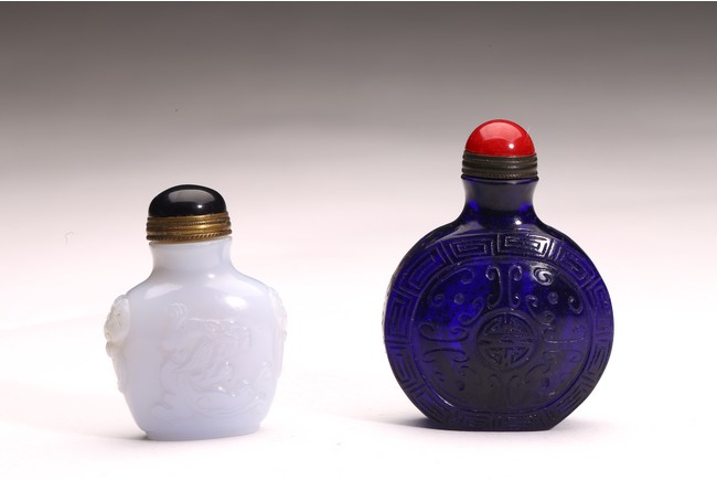 Comprising of a translucent purplish blue glass snuff bottle and an opaque bluish white snuff bottle.