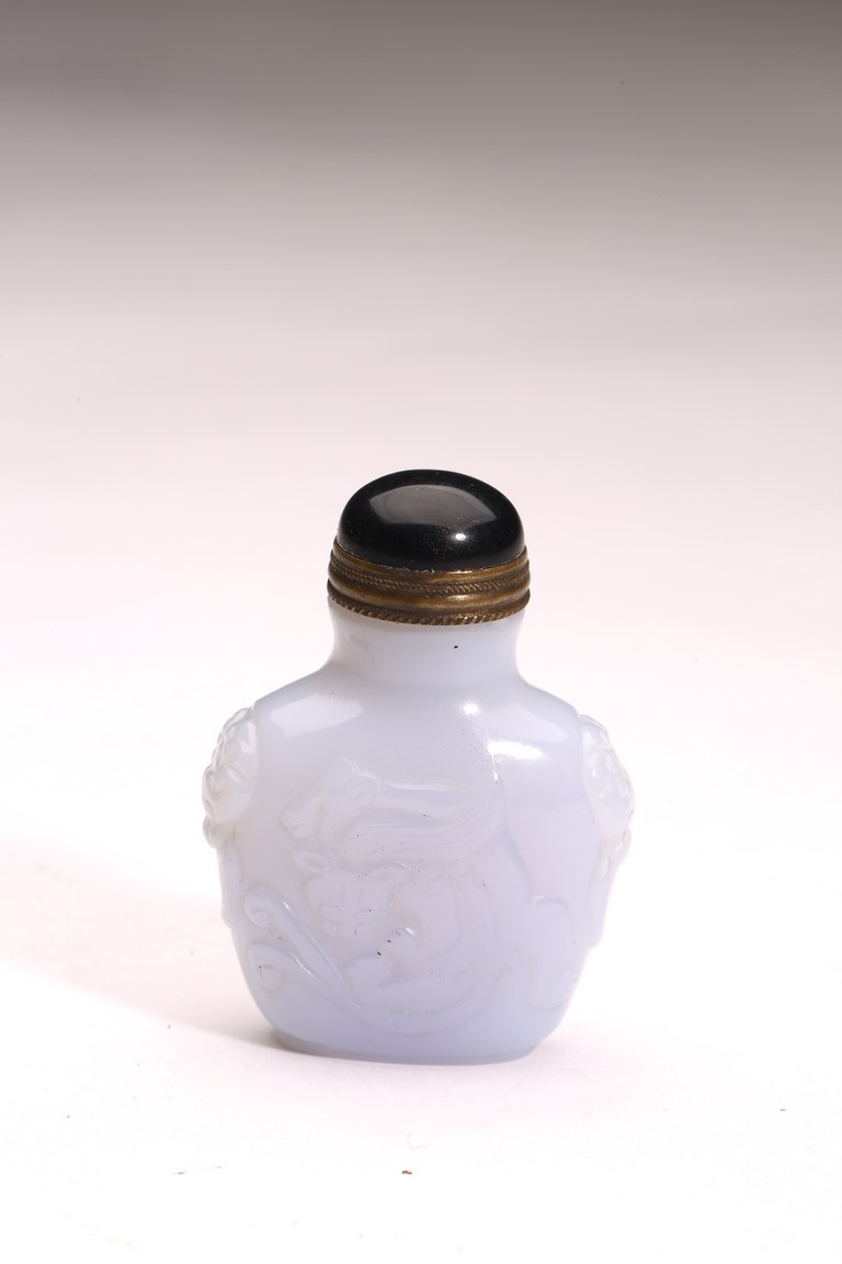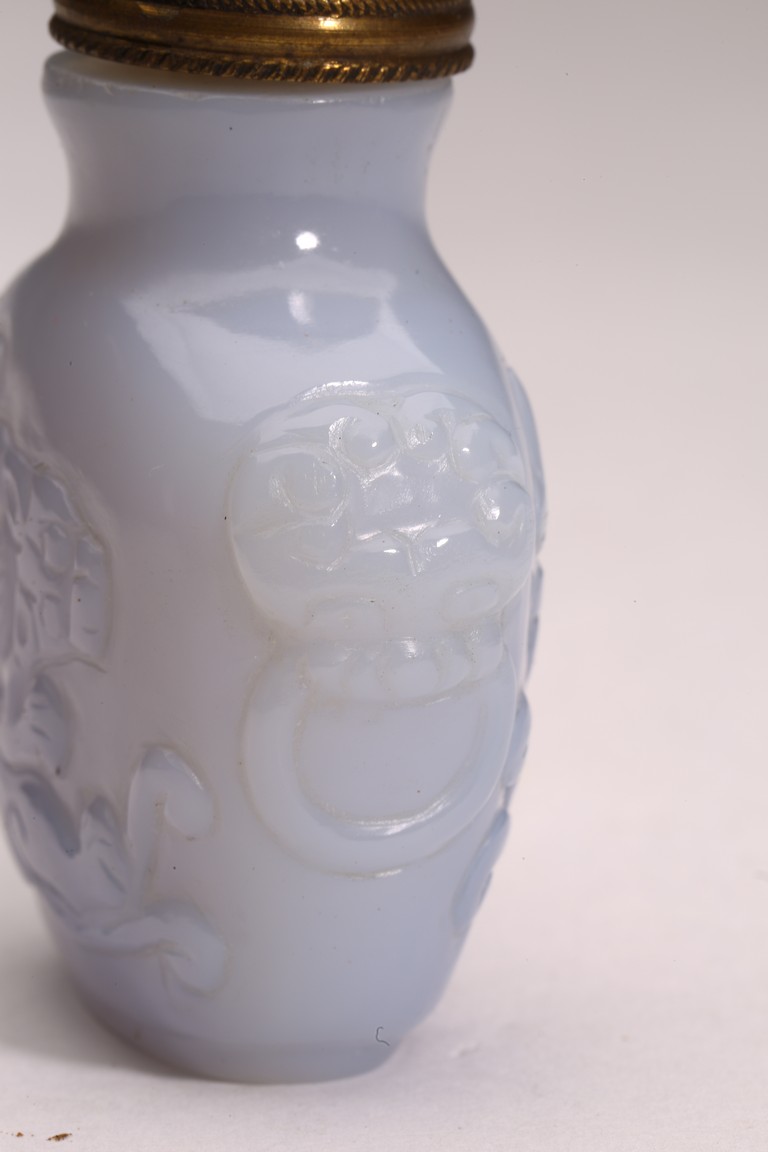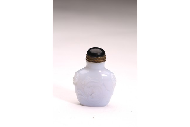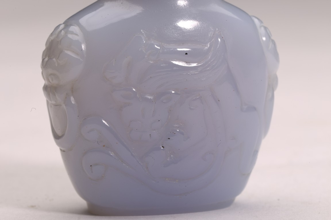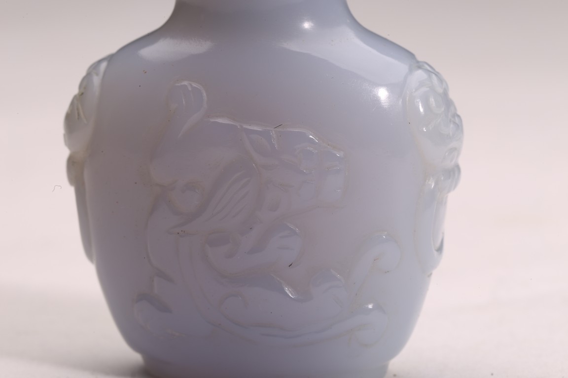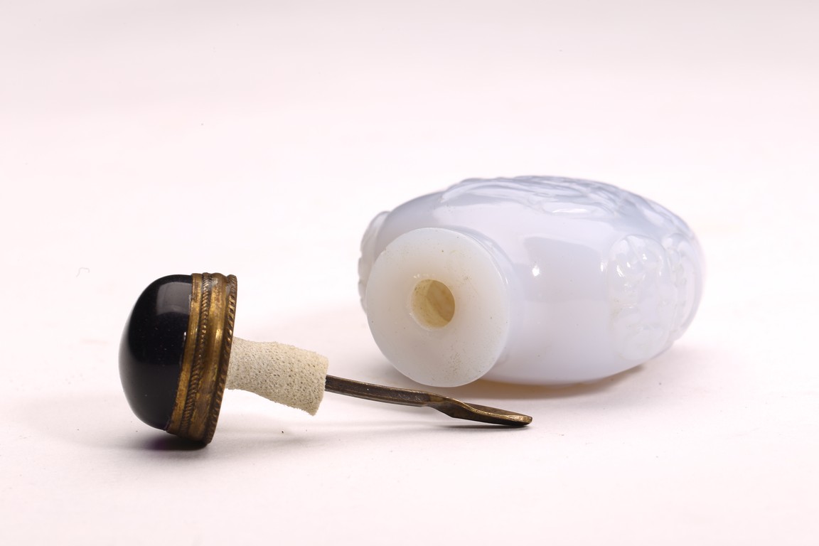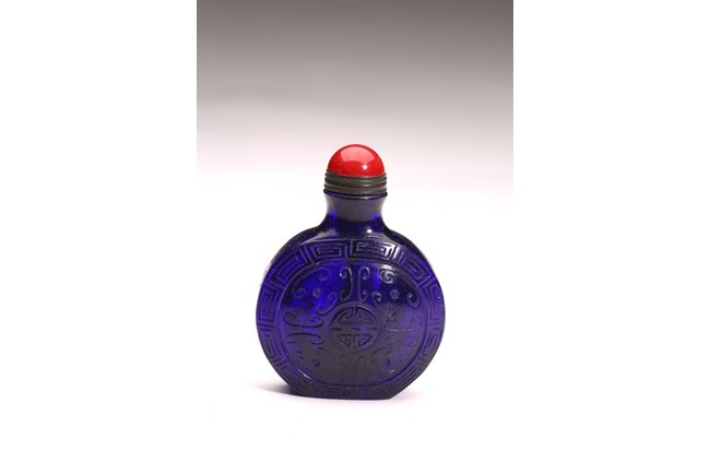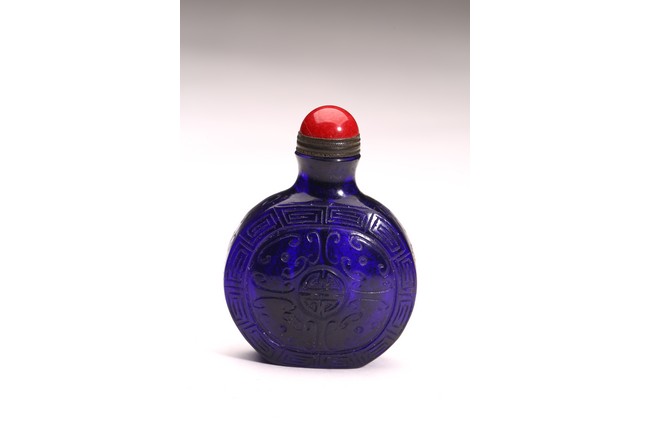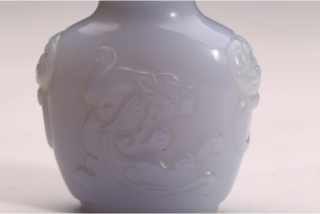 Comprising of a translucent purplish blue glass snuff bottle and an opaque bluish white snuff bottle.