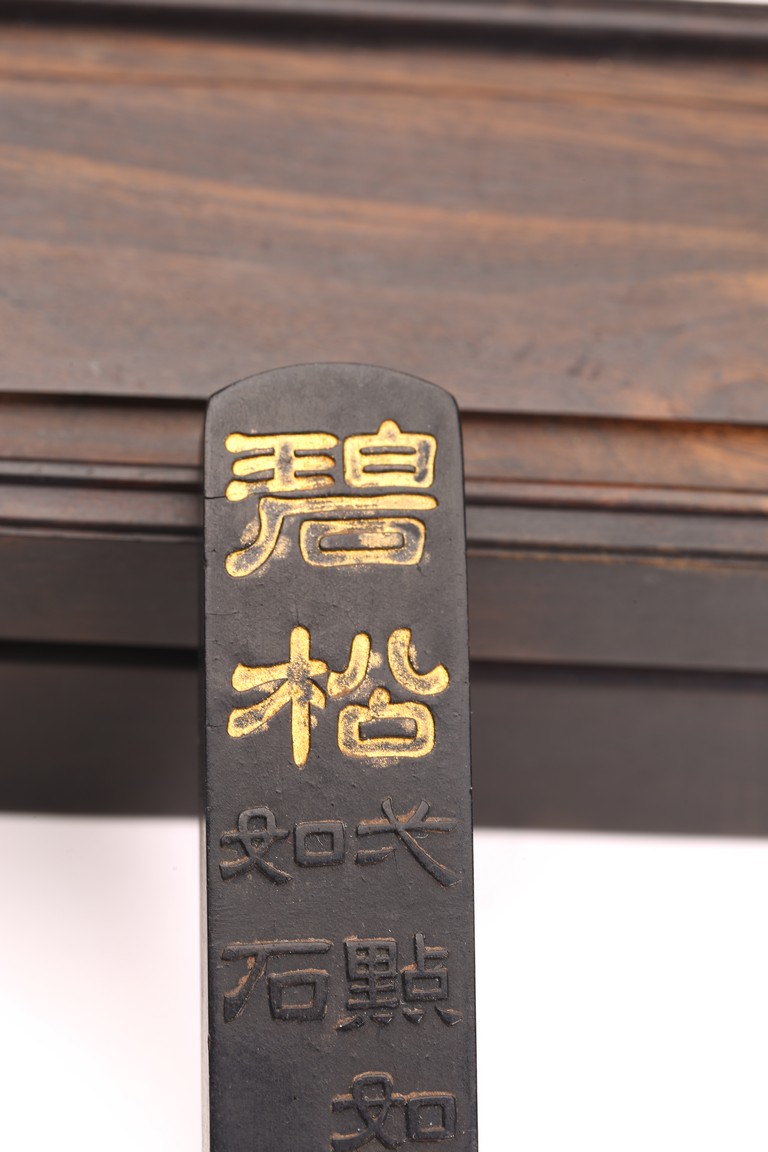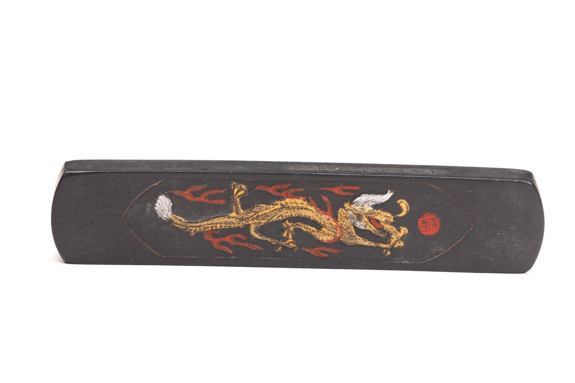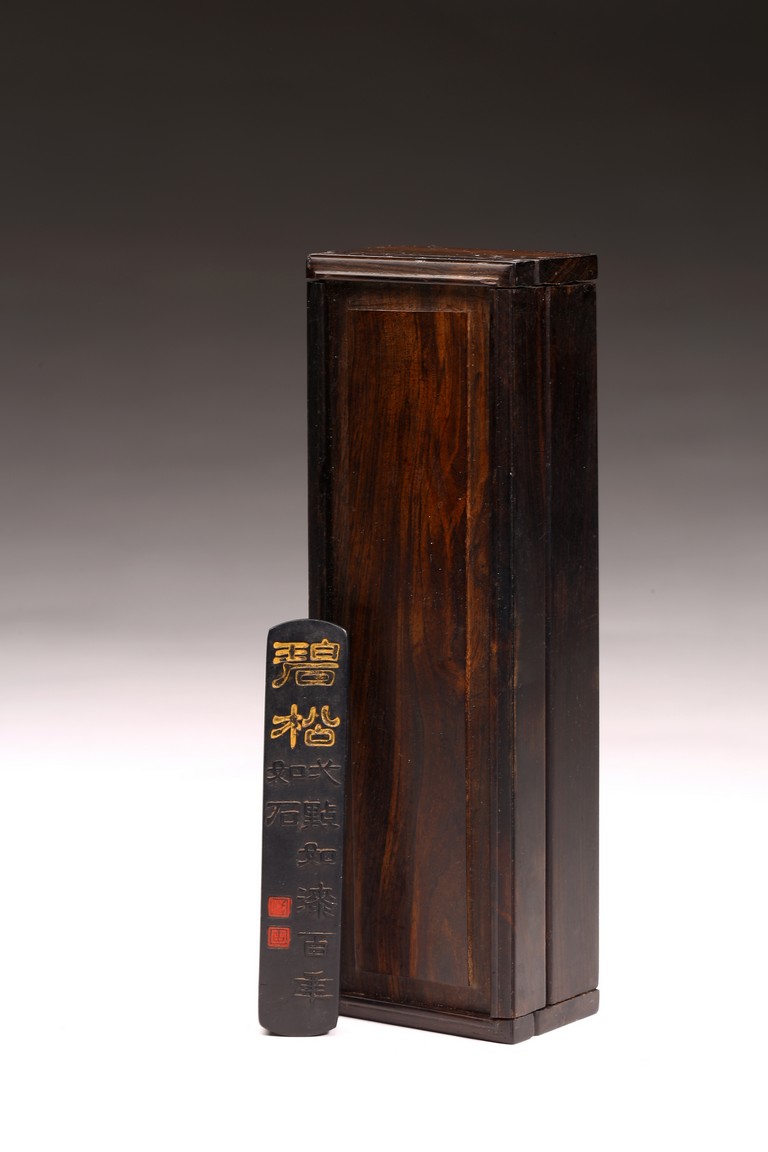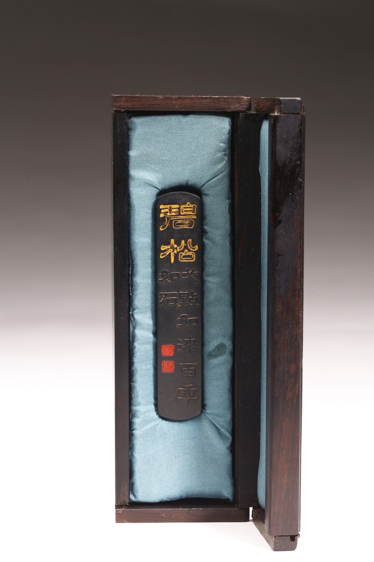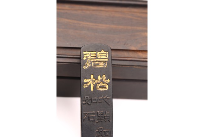 19th or Early 20th C. The rounded rectangle shaped ink cake inscribed with two character 'Bi Song' in gilt and eight character below, with two seal marks; the reverse carved in gilt with a ferocious dragon in flame chasing a pearl. Accompanied with hardwood box.