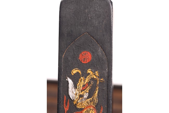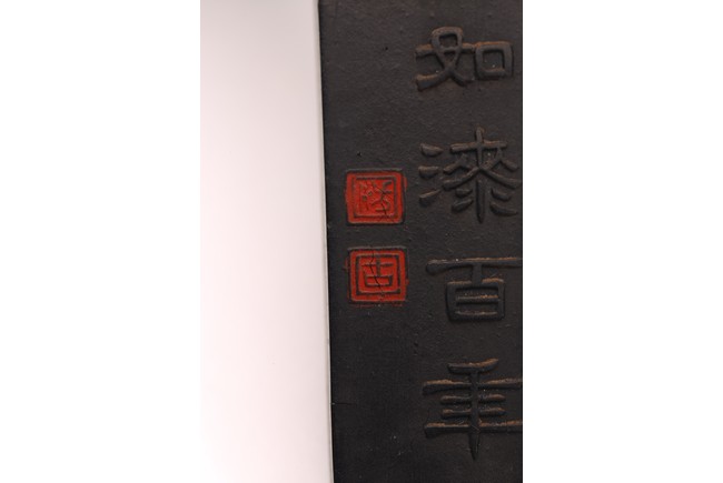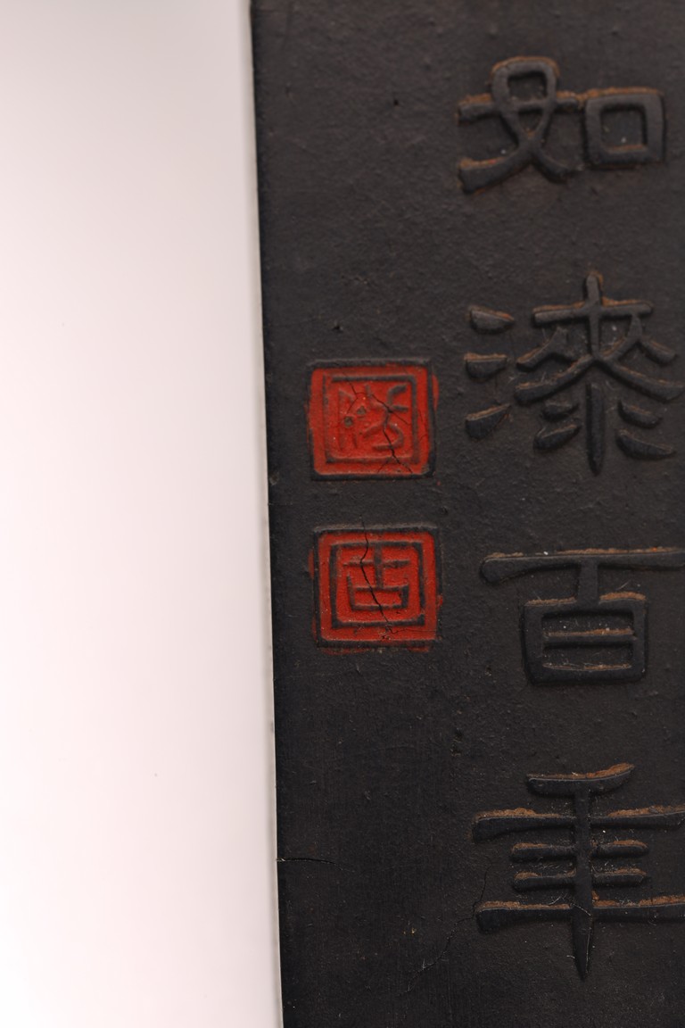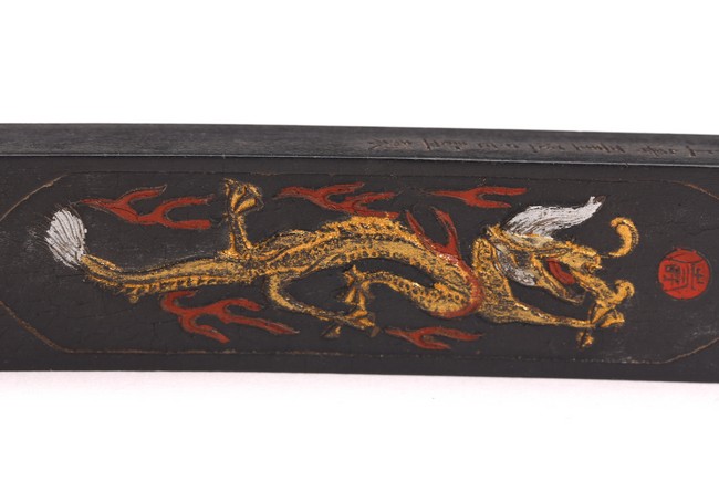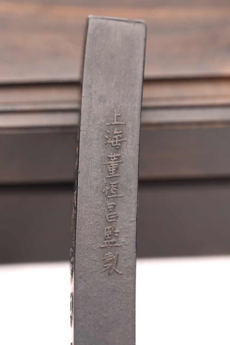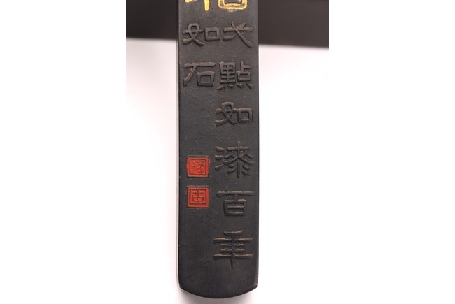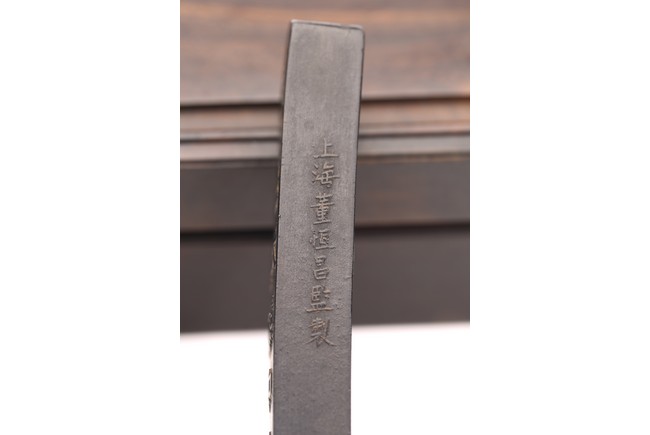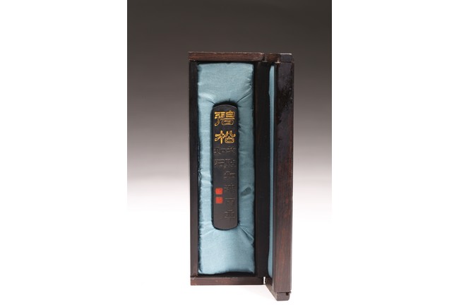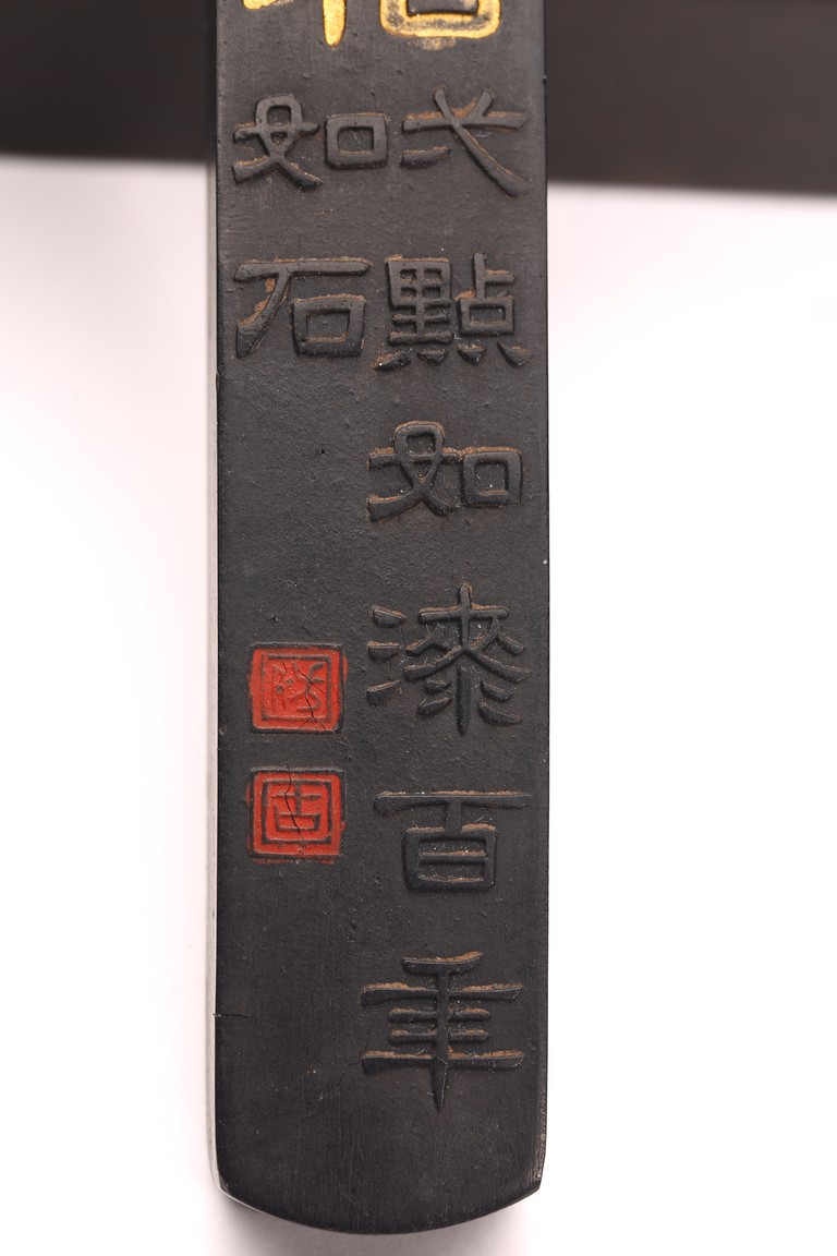 19th or Early 20th C. The rounded rectangle shaped ink cake inscribed with two character 'Bi Song' in gilt and eight character below, with two seal marks; the reverse carved in gilt with a ferocious dragon in flame chasing a pearl. Accompanied with hardwood box.