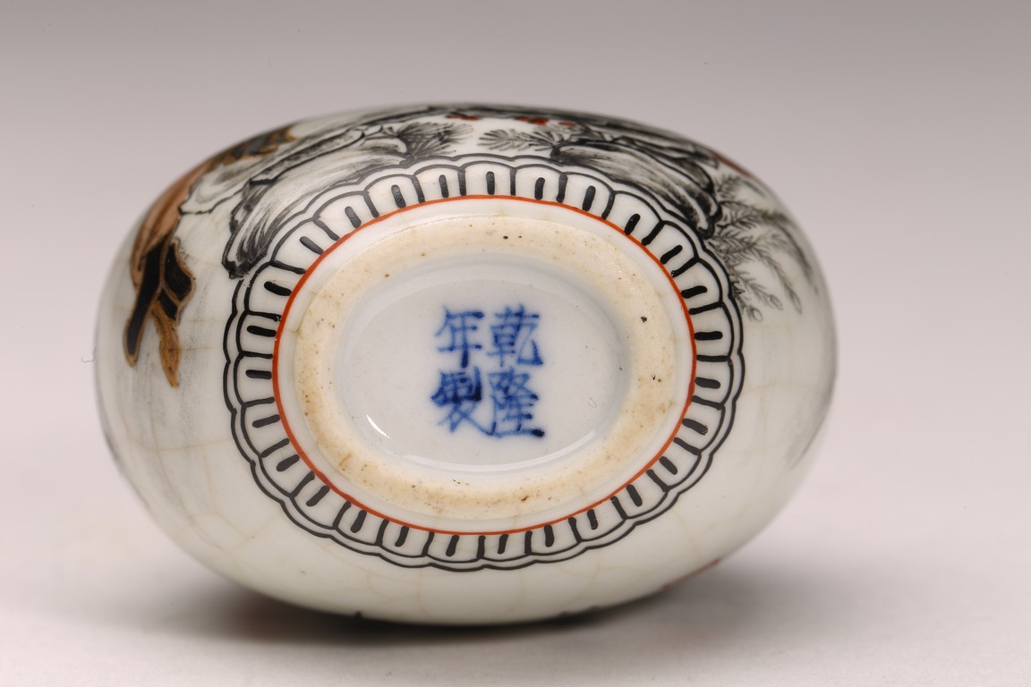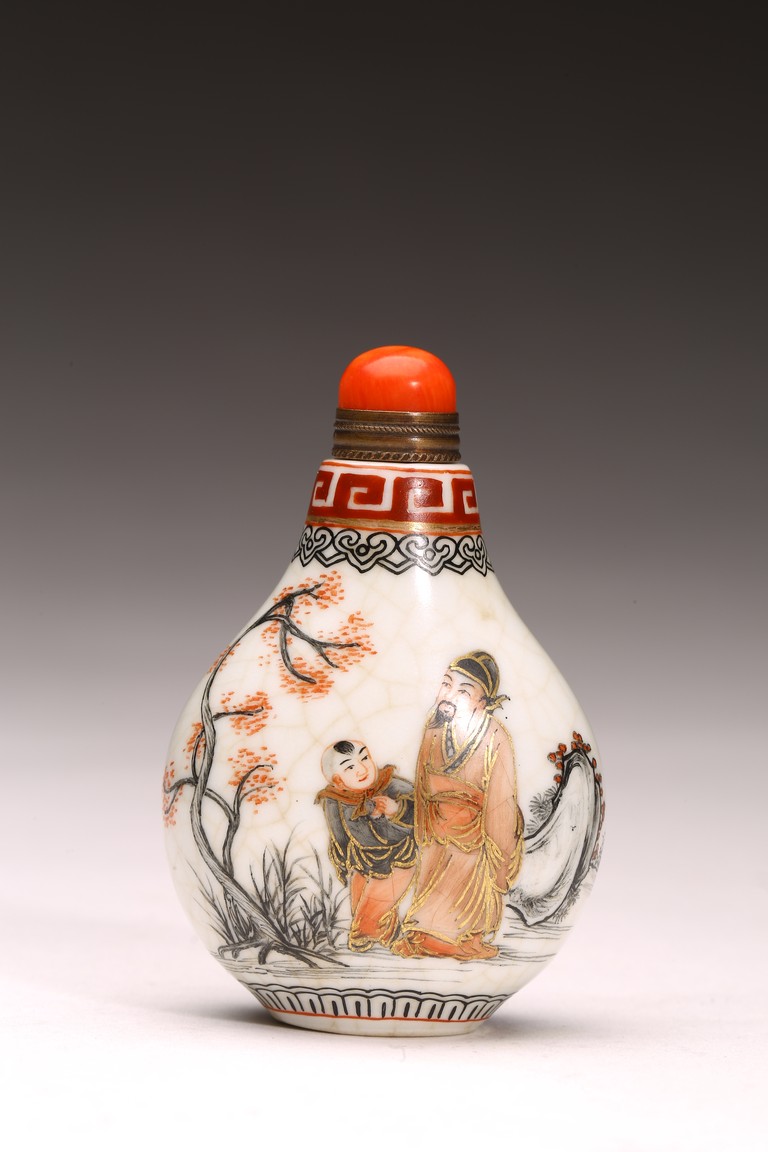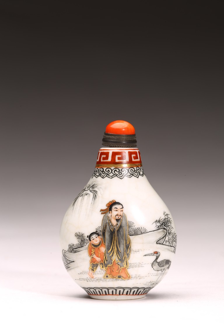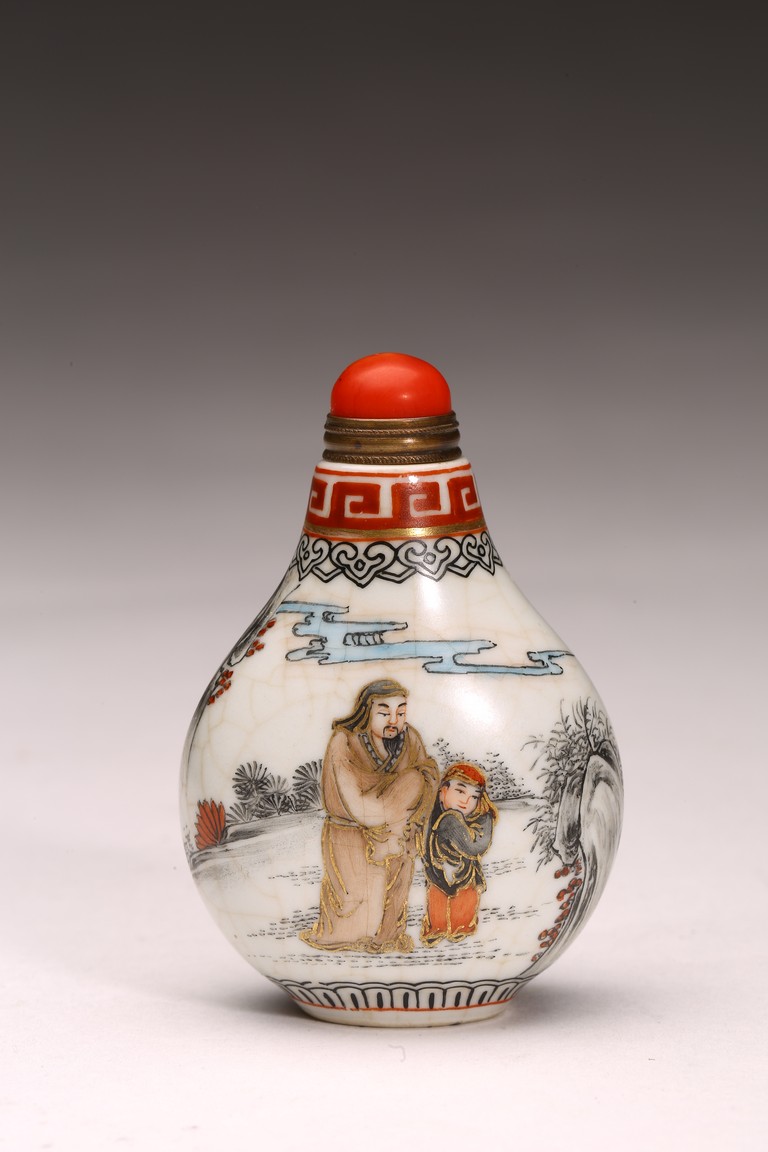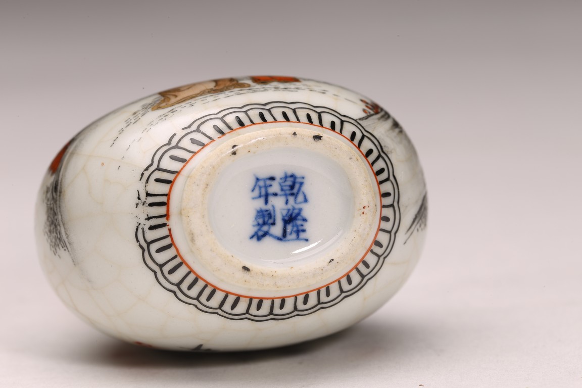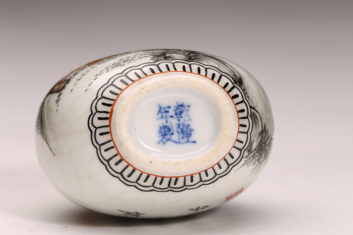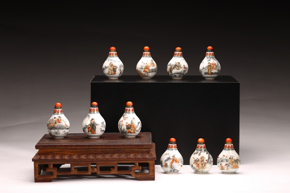 Comprising of 10 painted snuff bottles. Each depicting elderly figure accompanied by young attendant. Base with four character Qianlong mark. Stands in photos not included.
