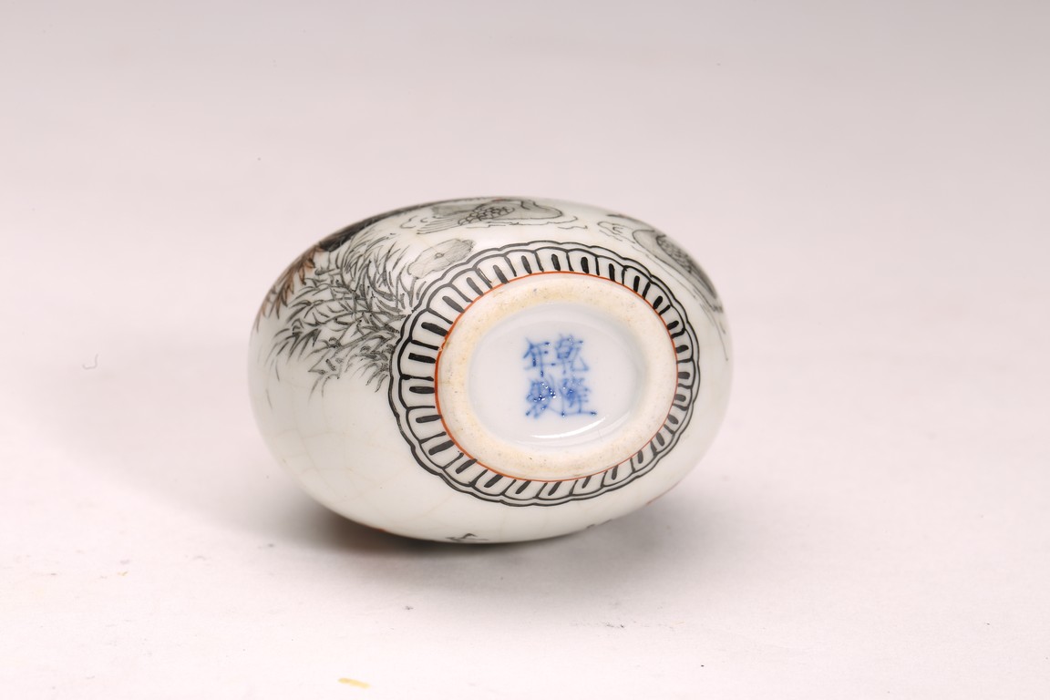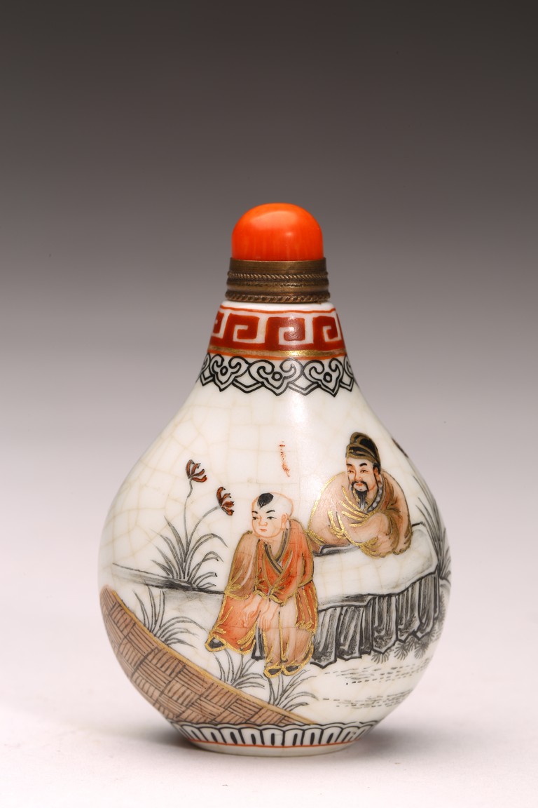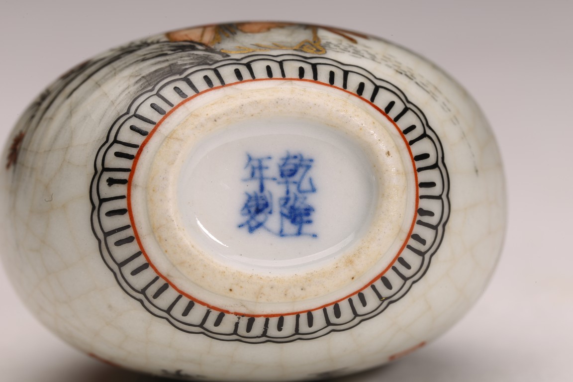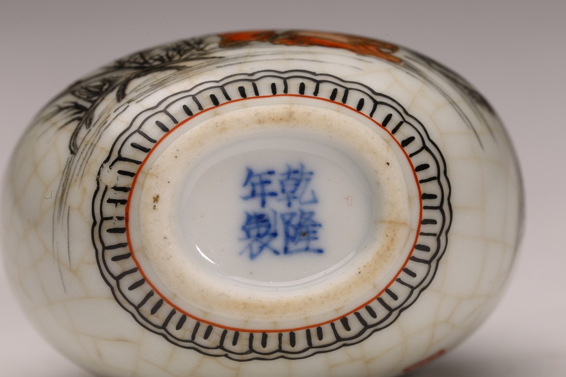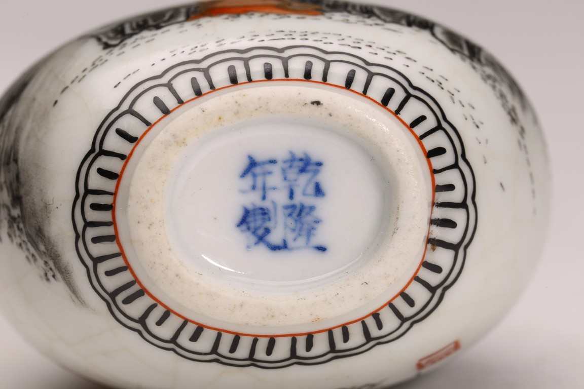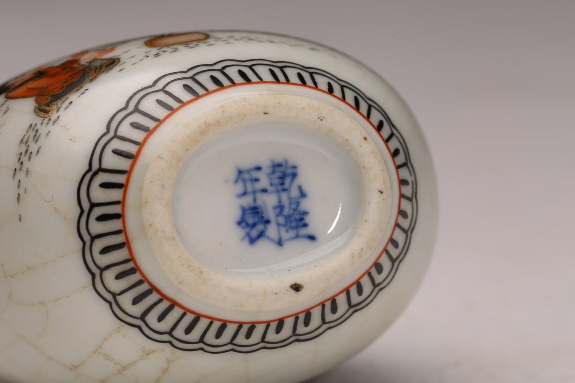 Comprising of 10 painted snuff bottles. Each depicting elderly figure accompanied by young attendant. Base with four character Qianlong mark. Stands in photos not included.