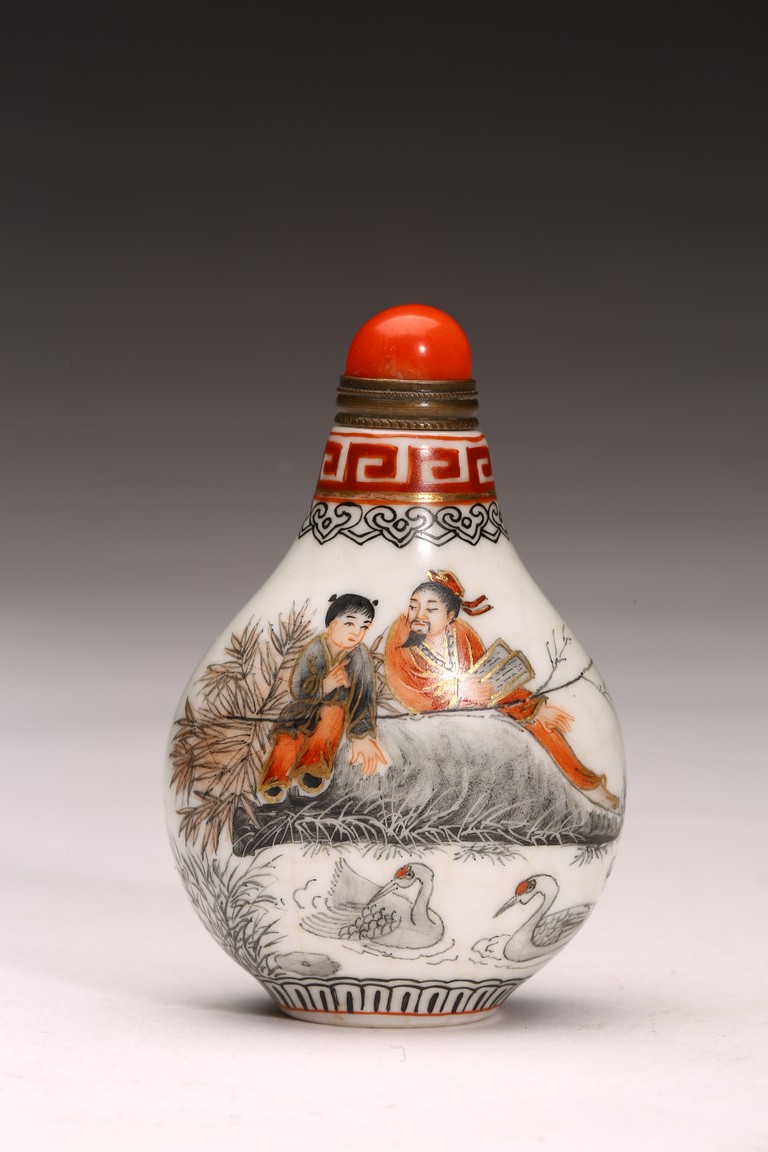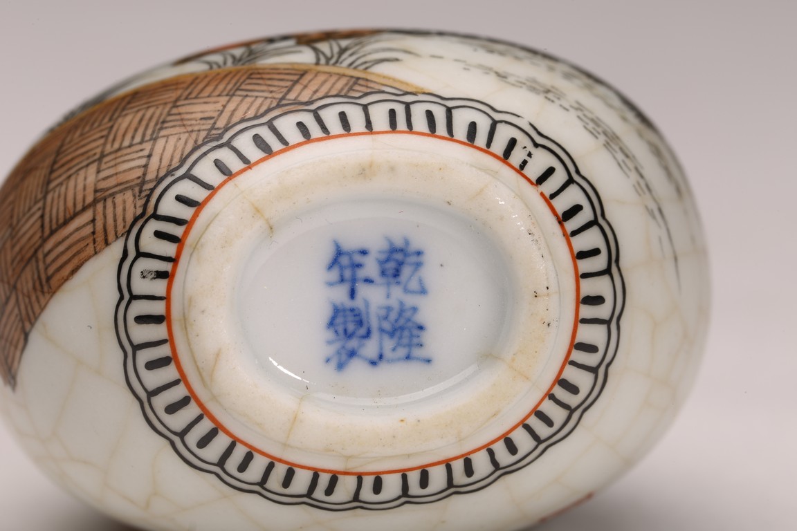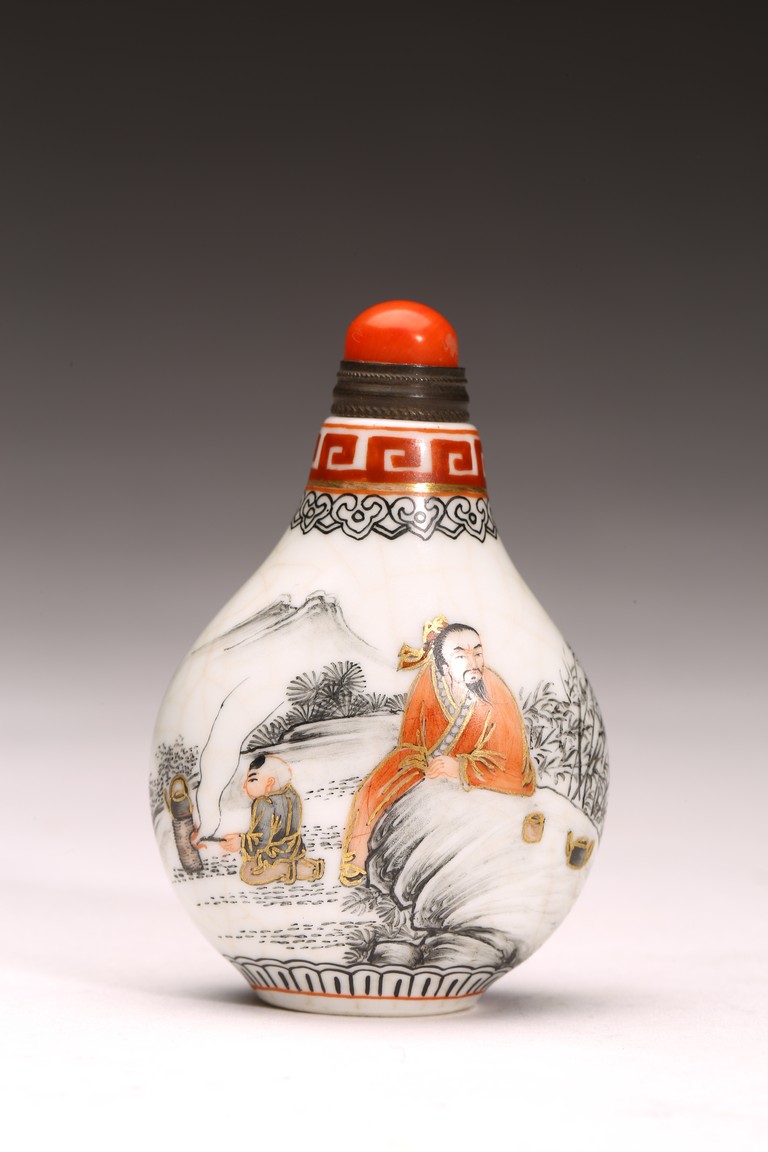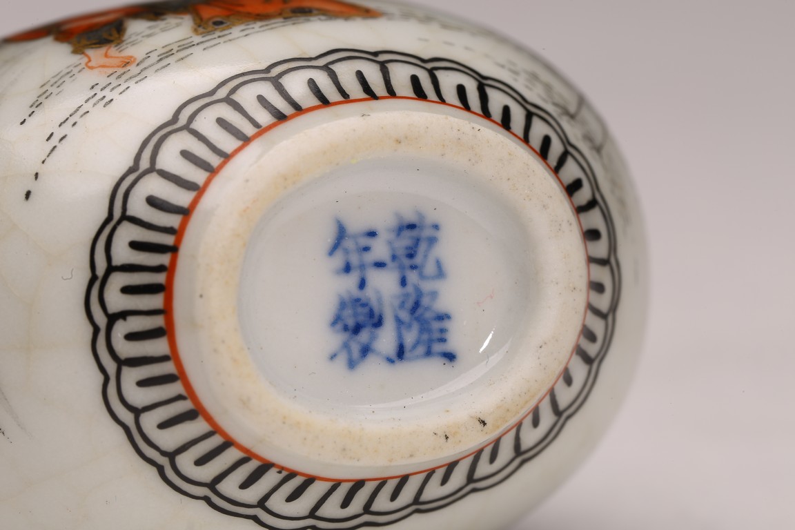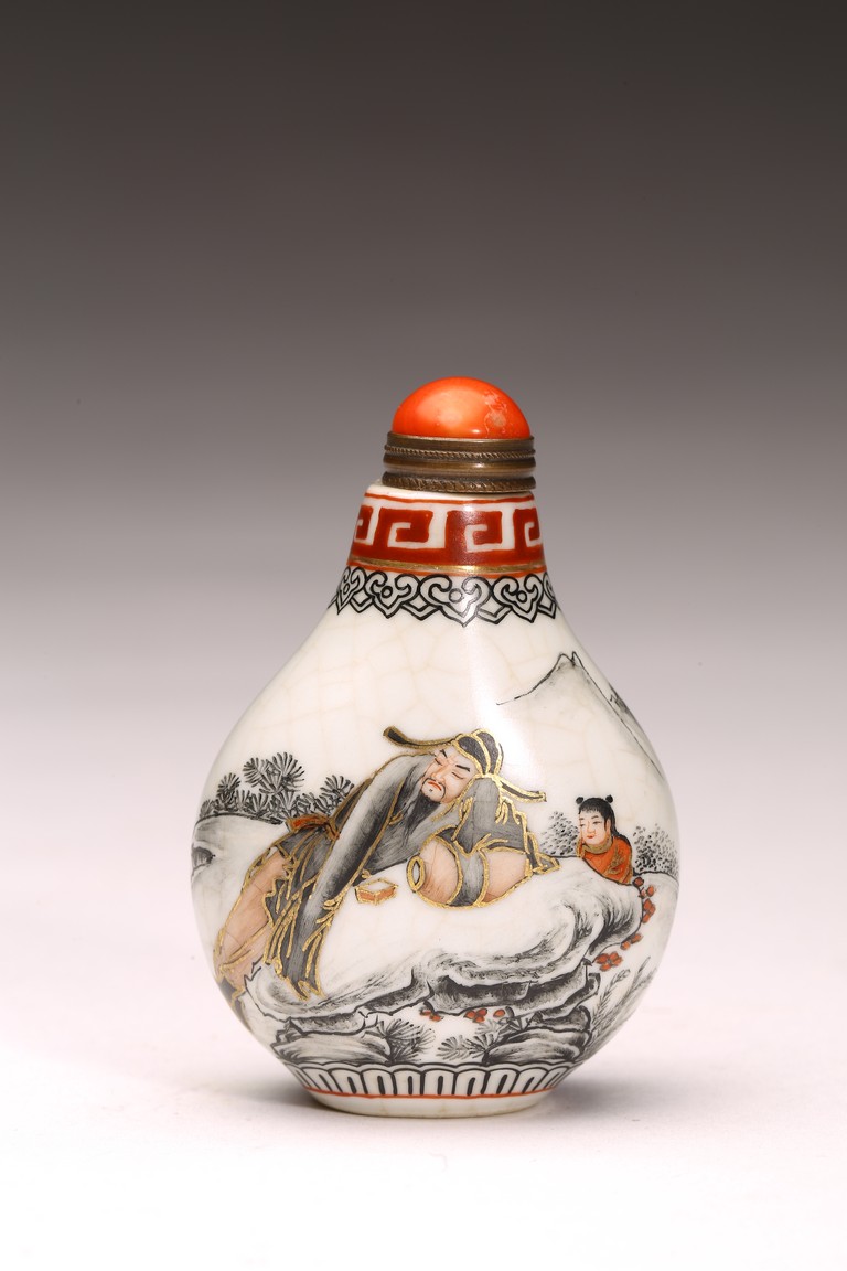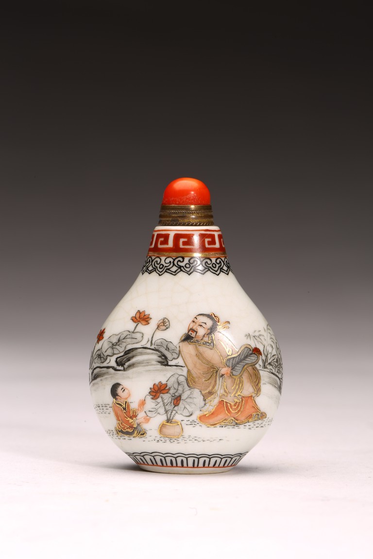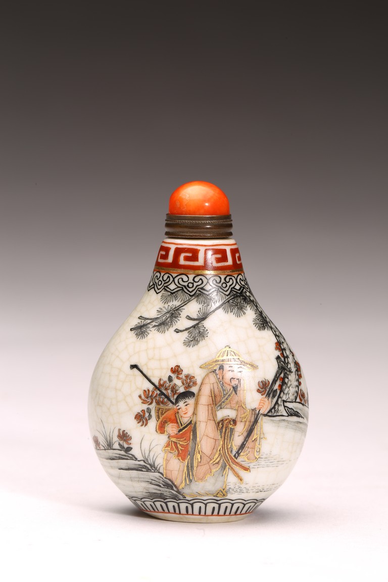Comprising of 10 painted snuff bottles. Each depicting elderly figure accompanied by young attendant. Base with four character Qianlong mark. Stands in photos not included.