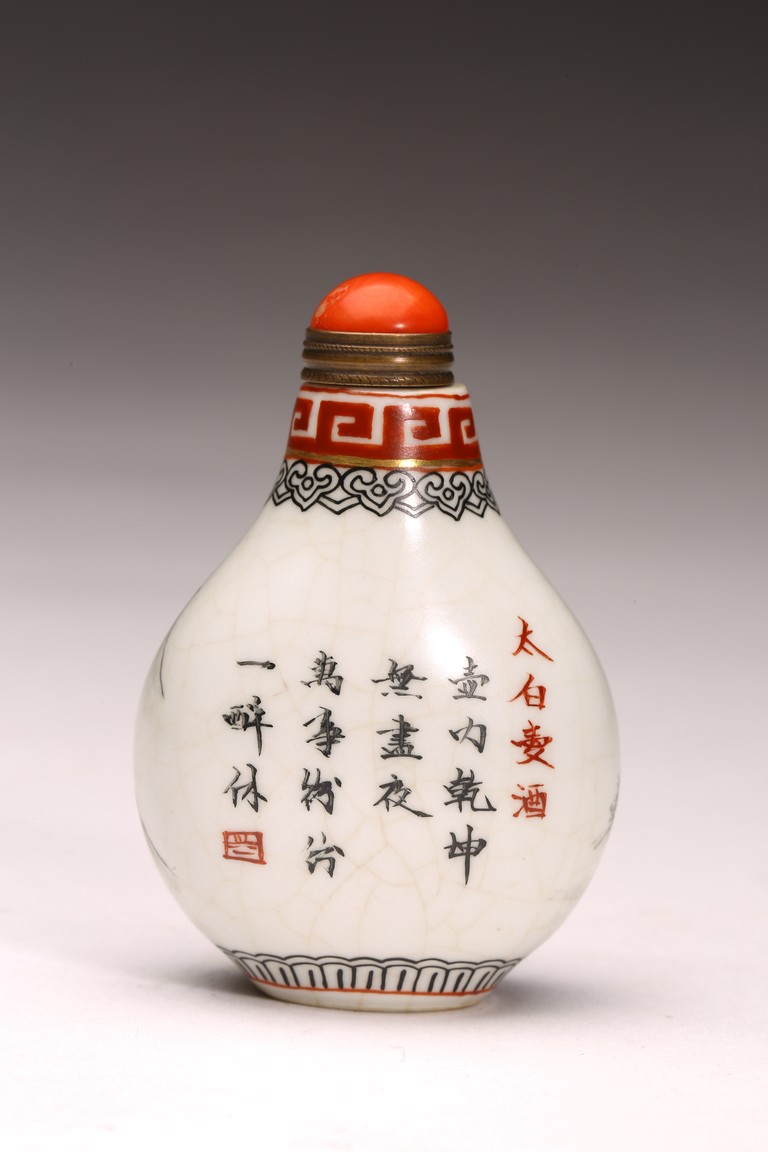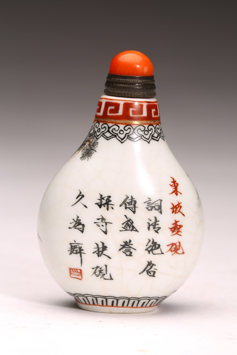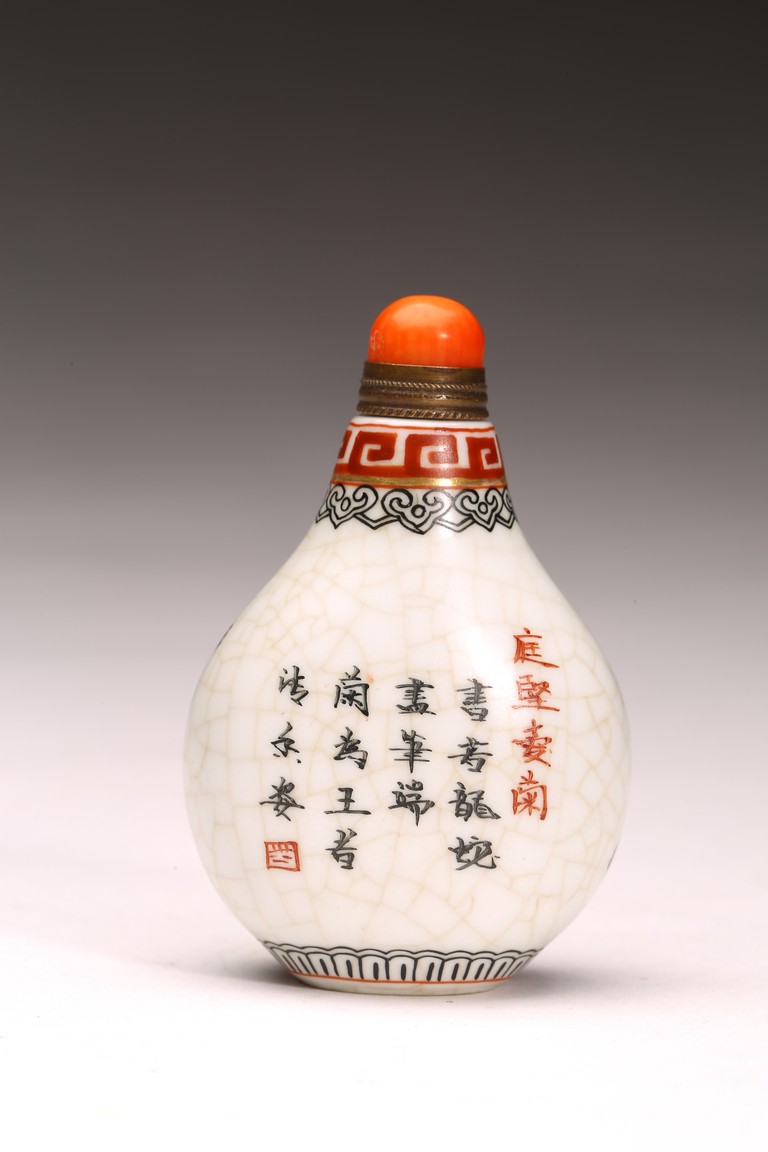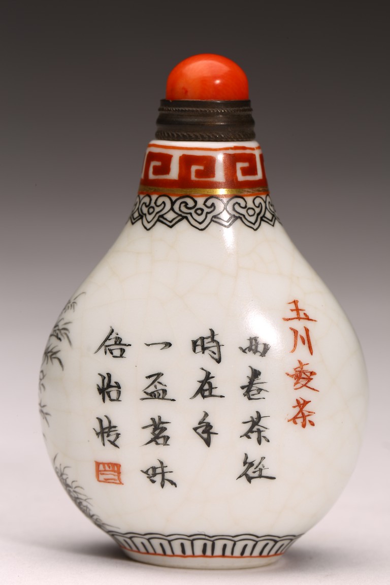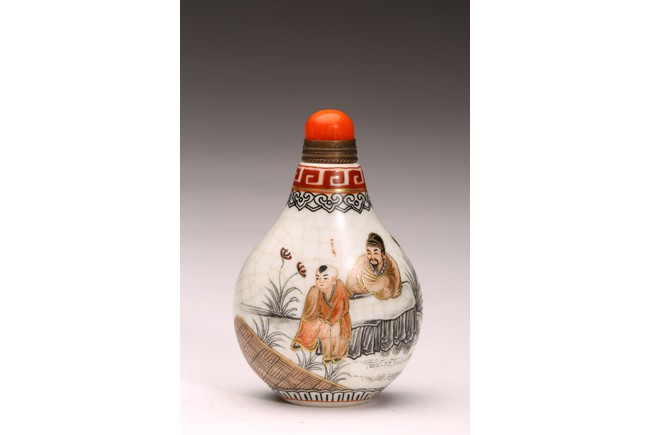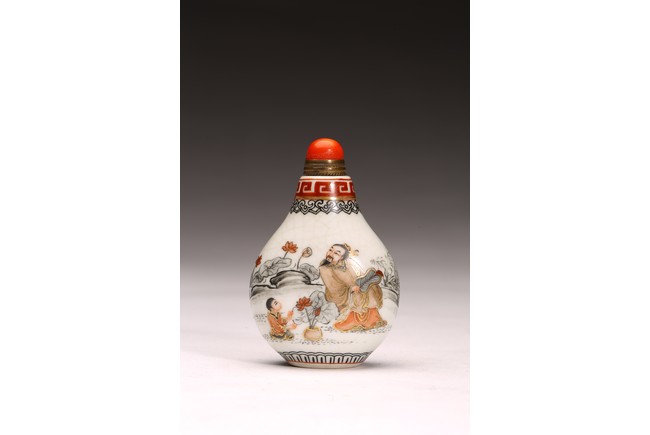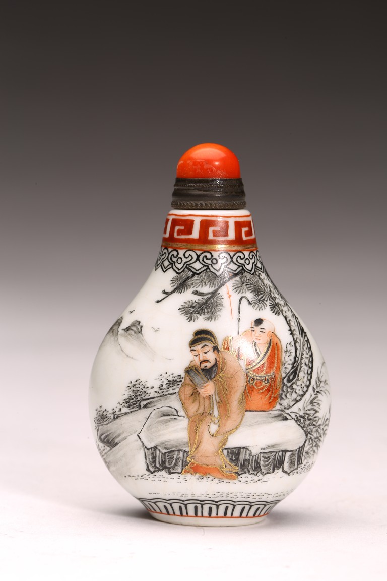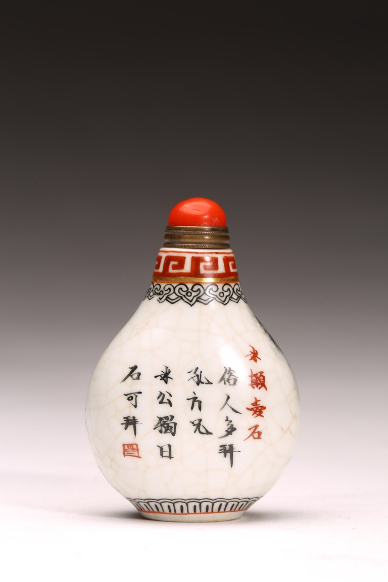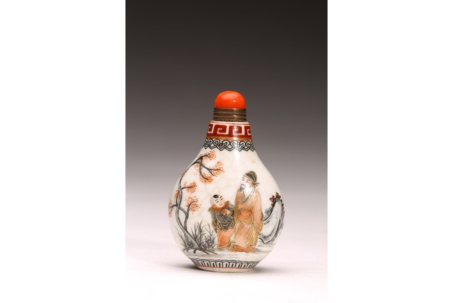 Comprising of 10 painted snuff bottles. Each depicting elderly figure accompanied by young attendant. Base with four character Qianlong mark. Stands in photos not included.