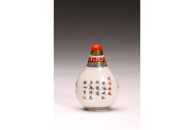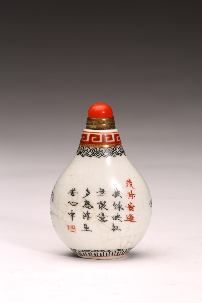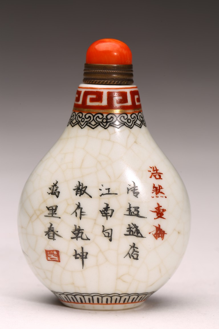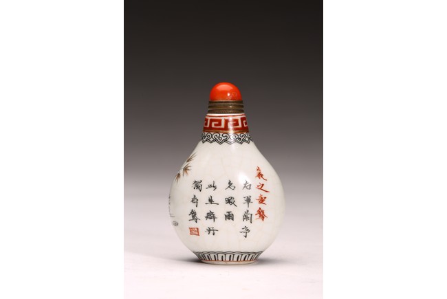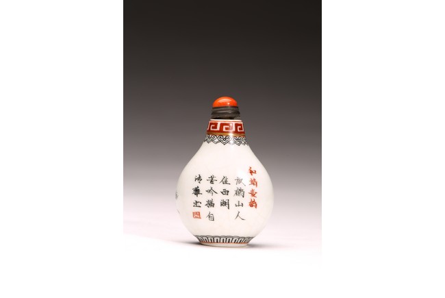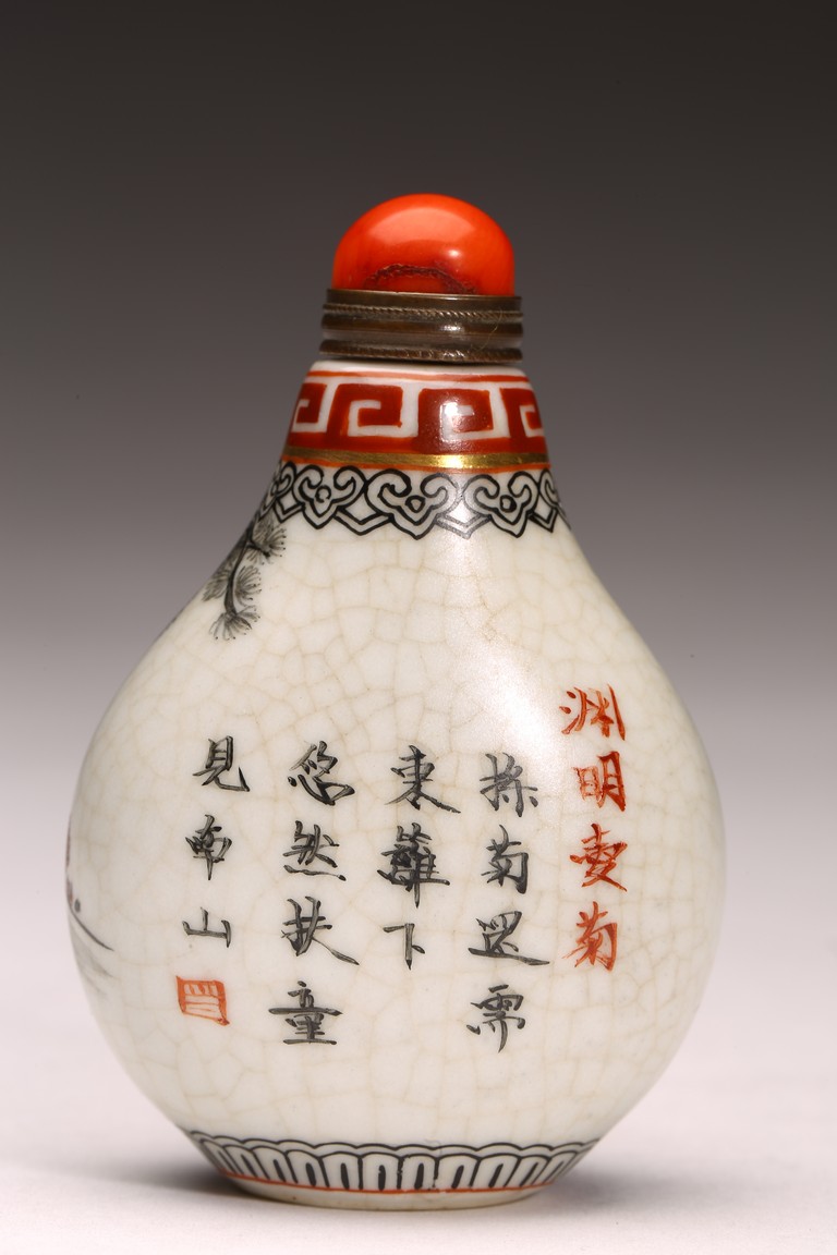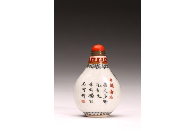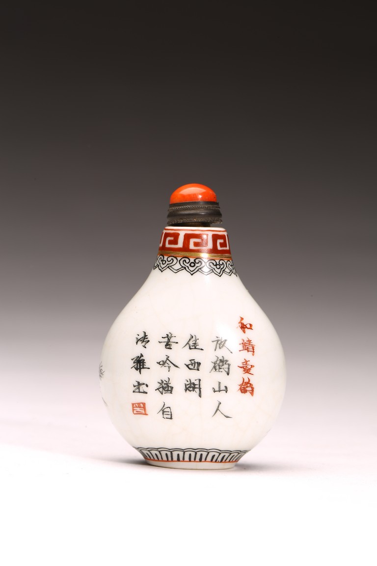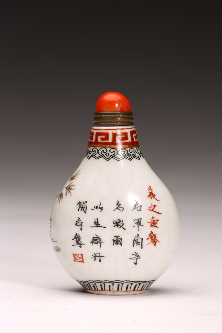 Comprising of 10 painted snuff bottles. Each depicting elderly figure accompanied by young attendant. Base with four character Qianlong mark. Stands in photos not included.