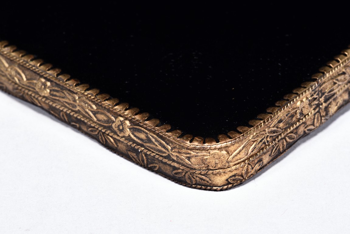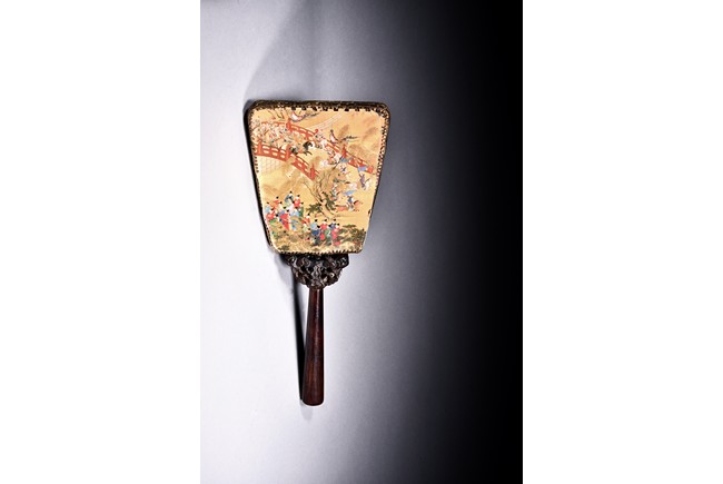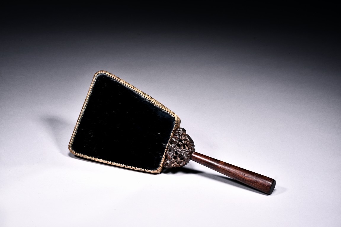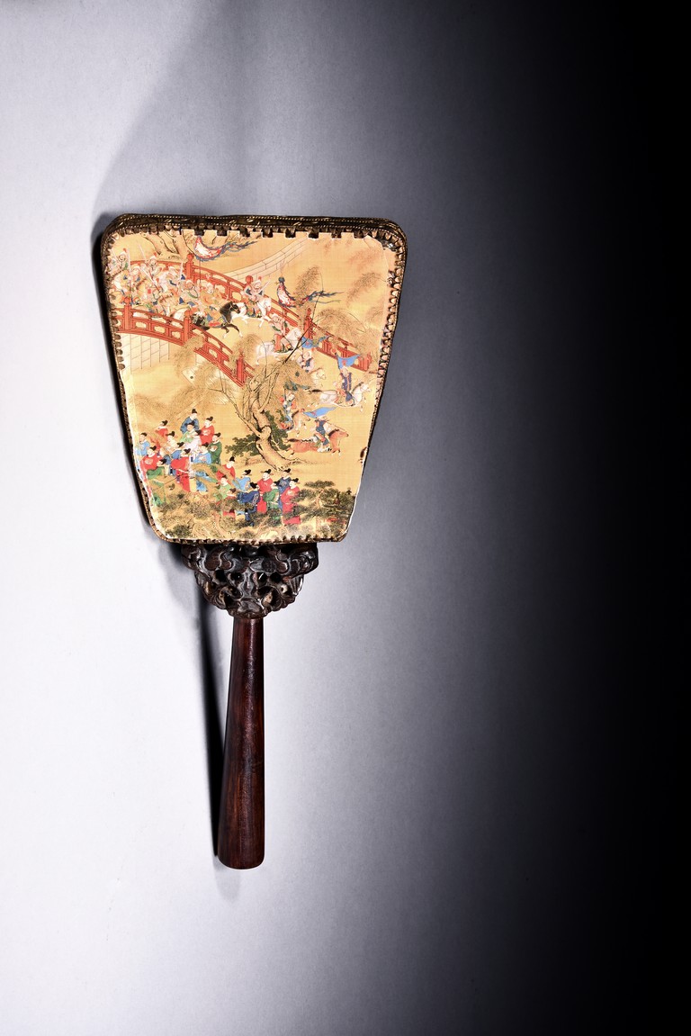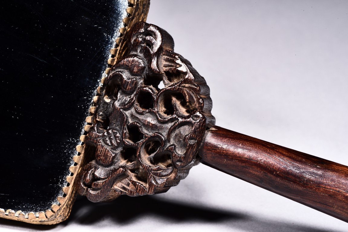 The hardwood handle with reticulated design, the mirror with bronze frame and backed by a decorative painting.