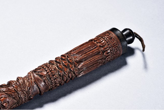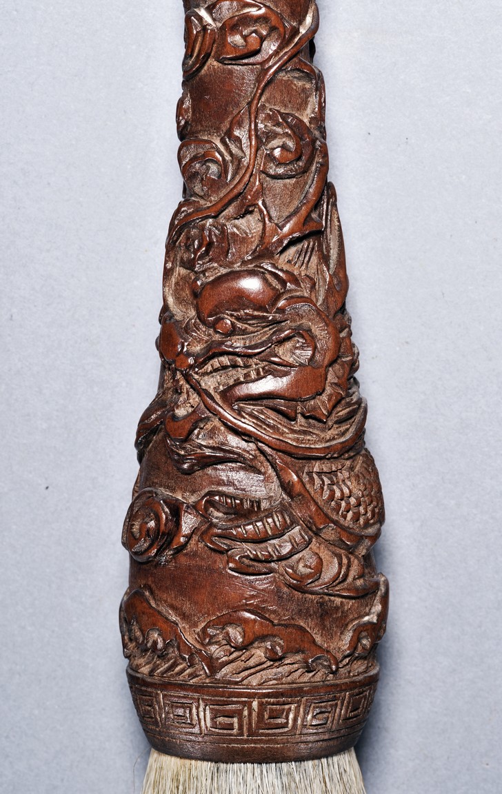 The handle of the brush is carved in relief with dragons and auspicious clouds, with a key-fret band terminating at the end.