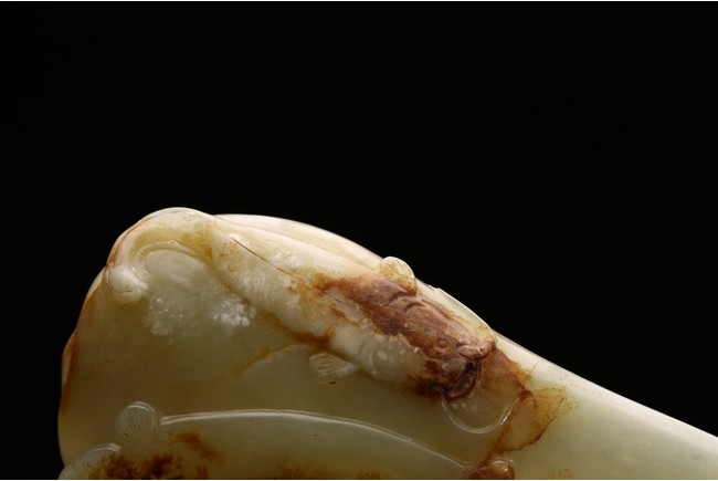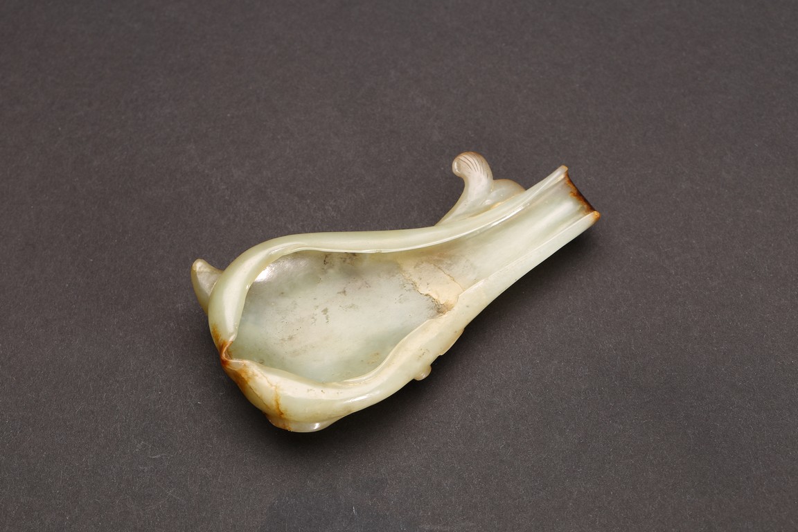 Qing Dynasty period 18th/19th C.Carved in the form of a large leaf curled up as washer, with carved fish below as base.