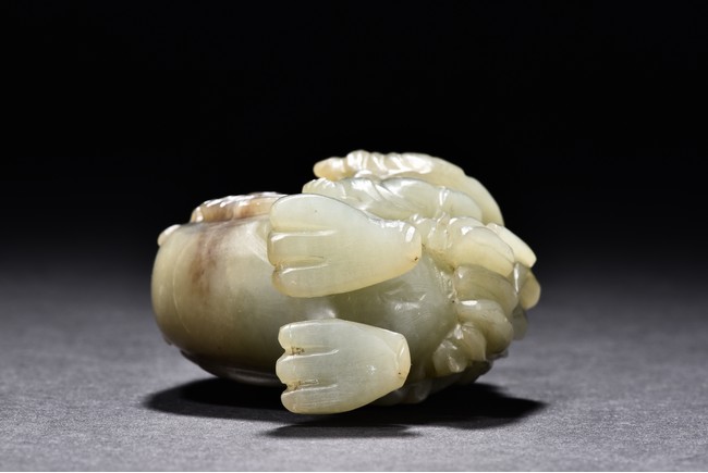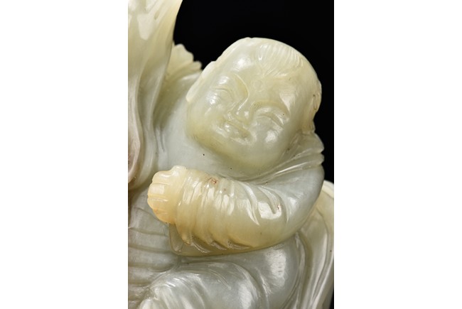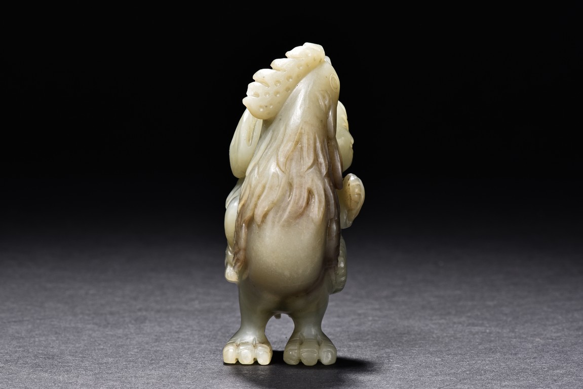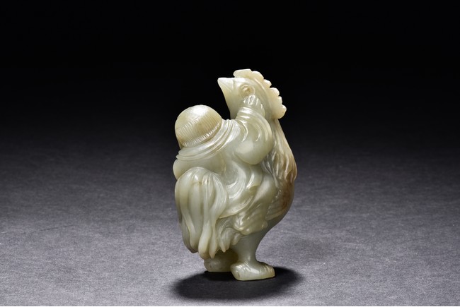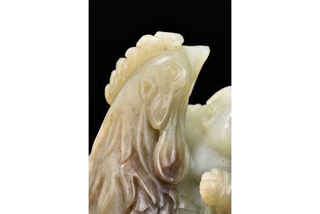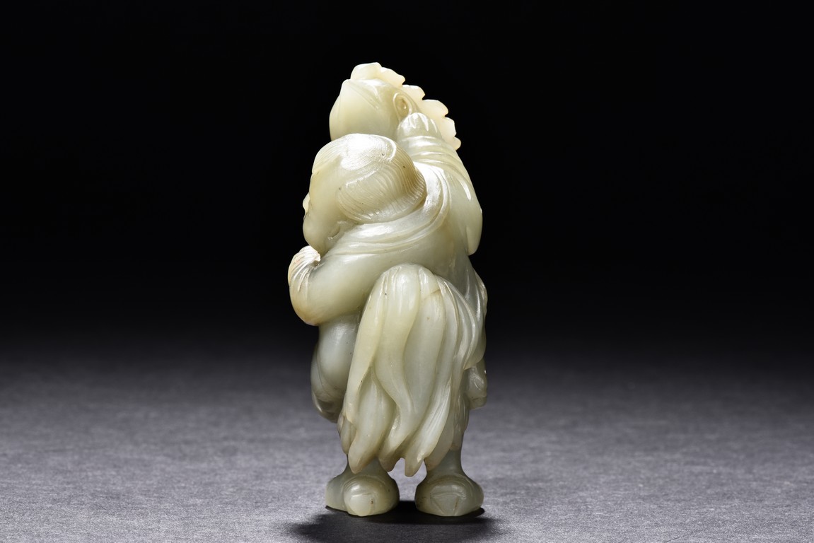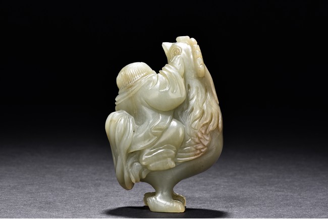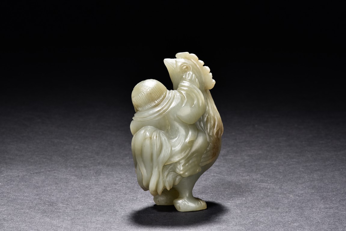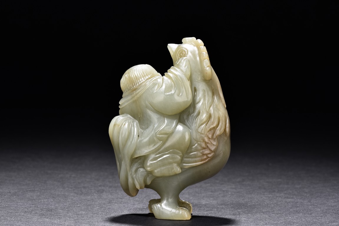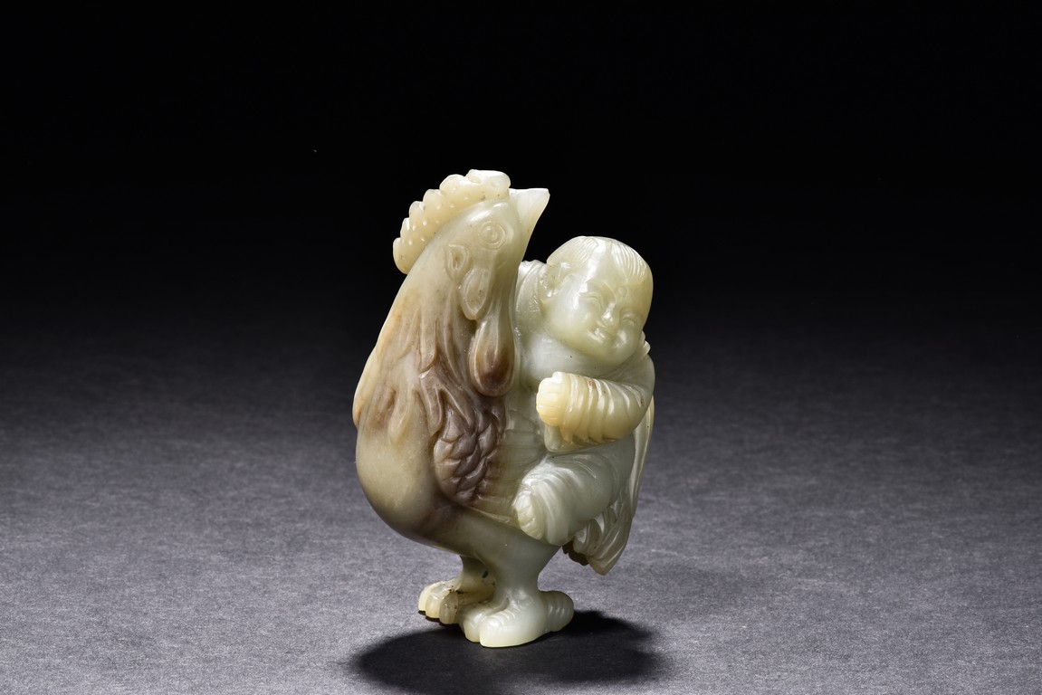 Qing Dynasty period. Modelled as a small child sitting upon a rooster, the child shown with a joyful expression, the hair detailed with incised lines, the rooster feathers incised with details, its head turning to the side. The stone is of celadon tone.