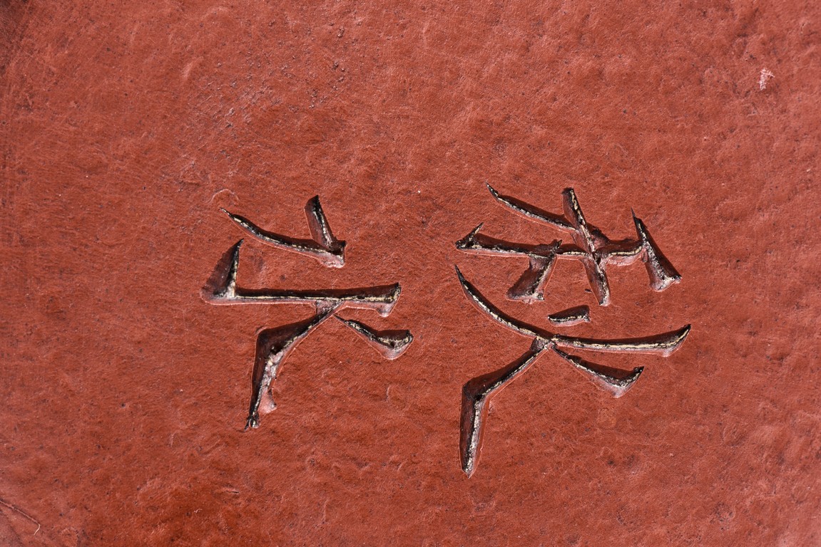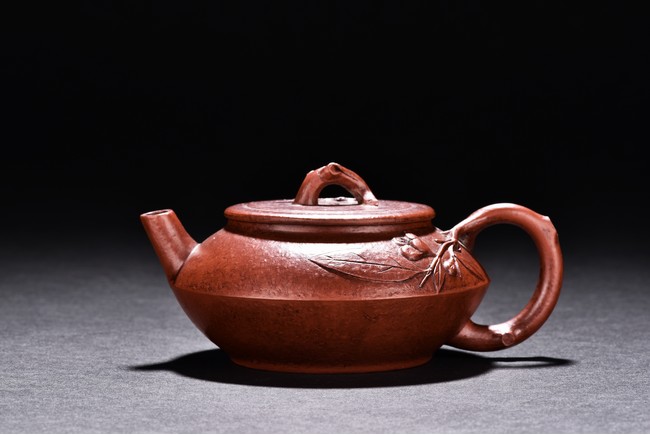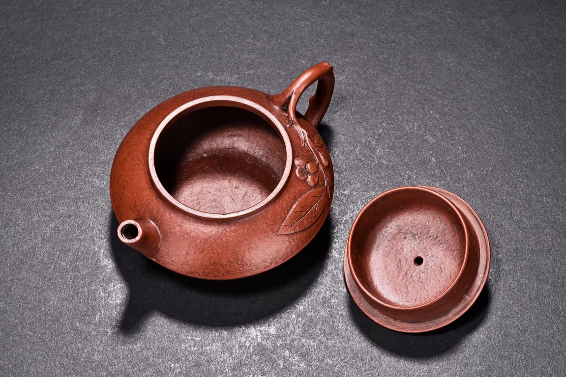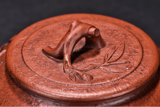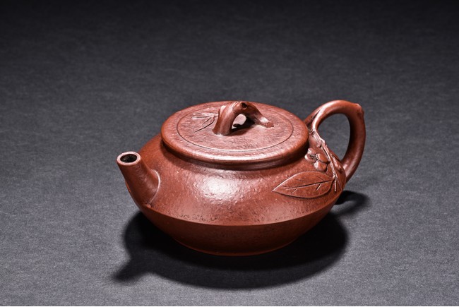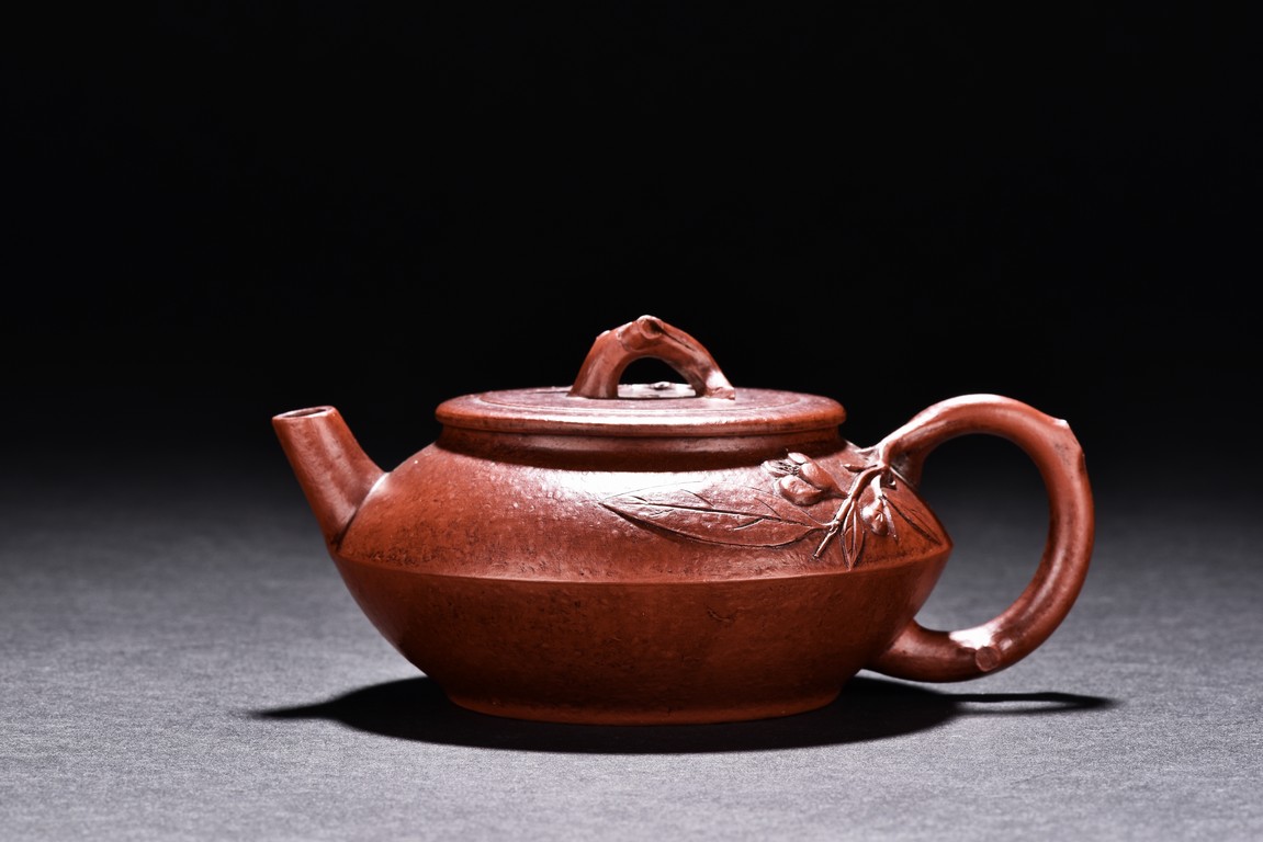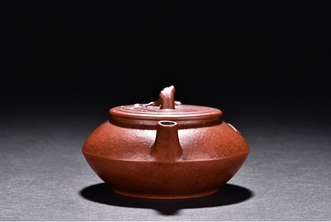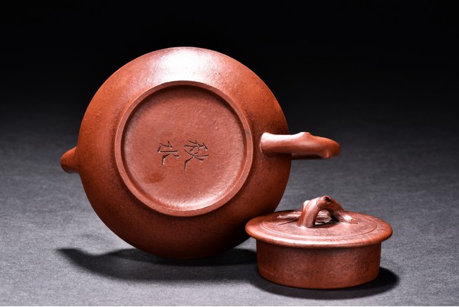Of compressed globular form, the handle and cover top in the form of gnarled trunk. Base with two character Qiu Shui inscription.