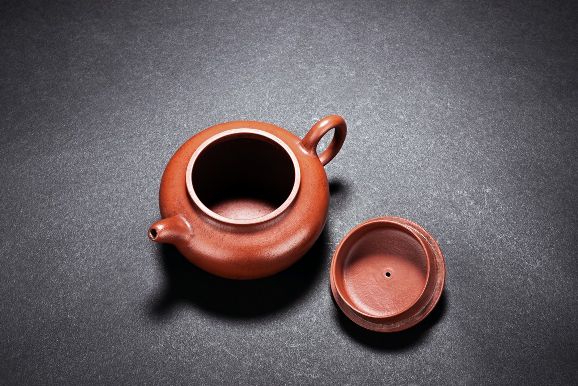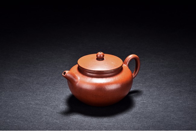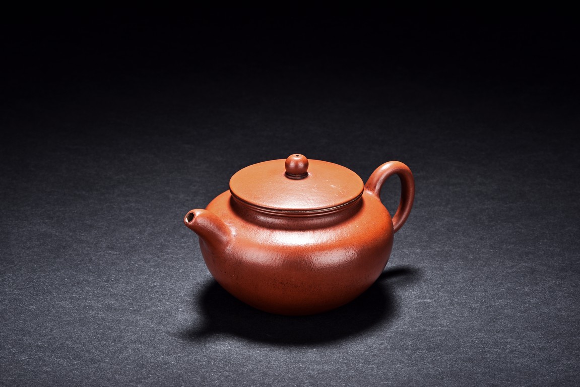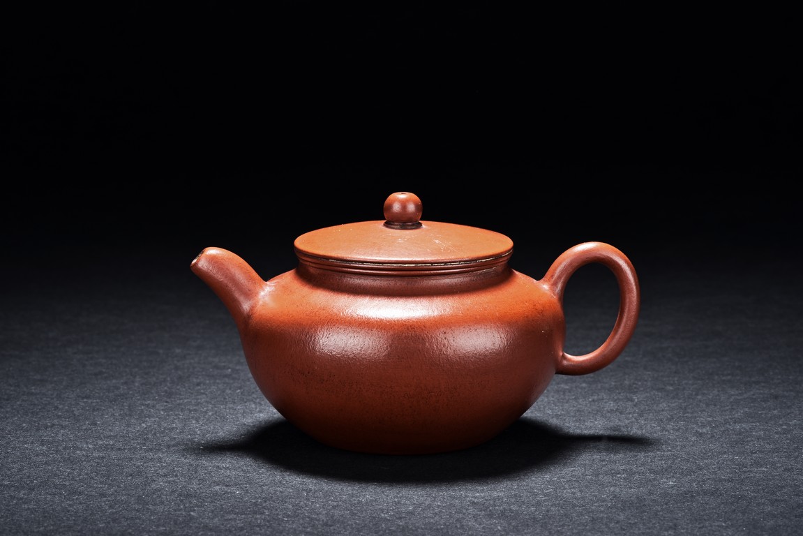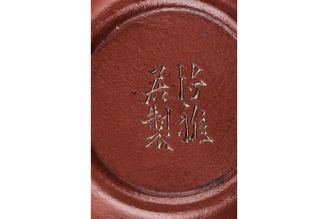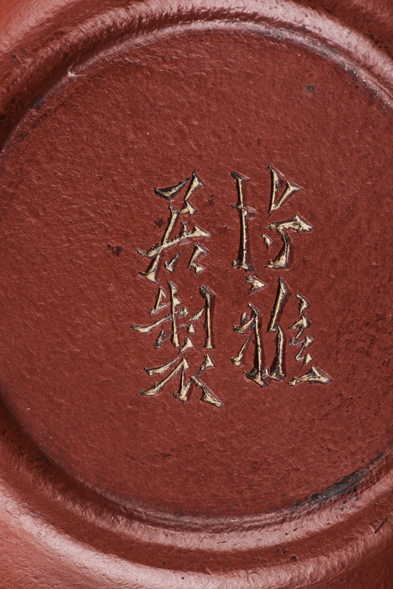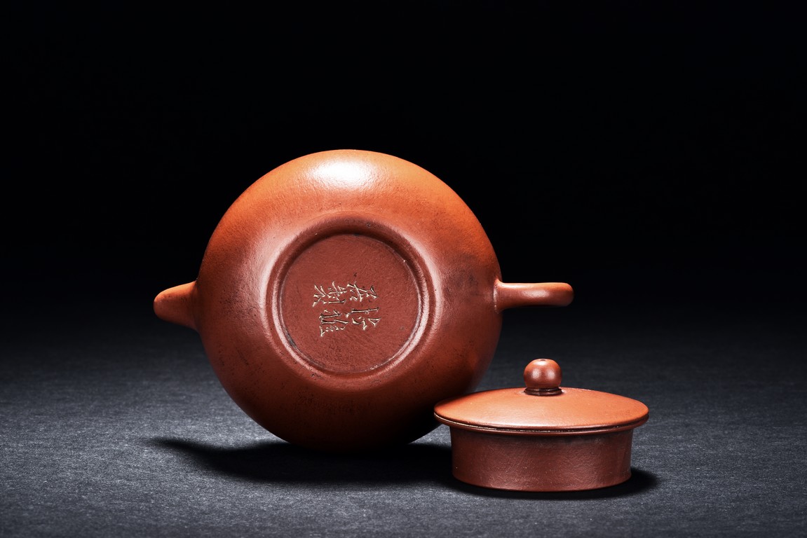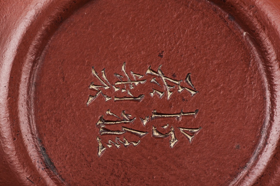 Of ear shaped handle, the teapot is of compressed globular shape, the spout slightly curved, with round dome cover, surmounted with bead finial. The bottom incised with four character 'Bo Ya Ju Zhi'.