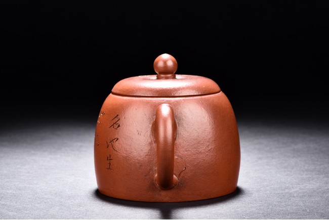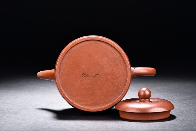 The teapot is incised with a poem on the body with two character colophon 'Song Ting', with ear-shaped round handle, curved spout. The bottom incised with two character 'Yu Gong'.