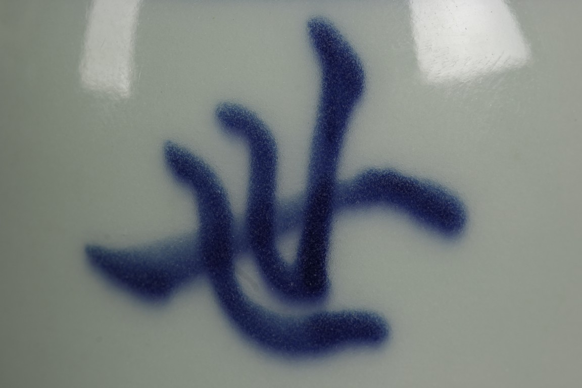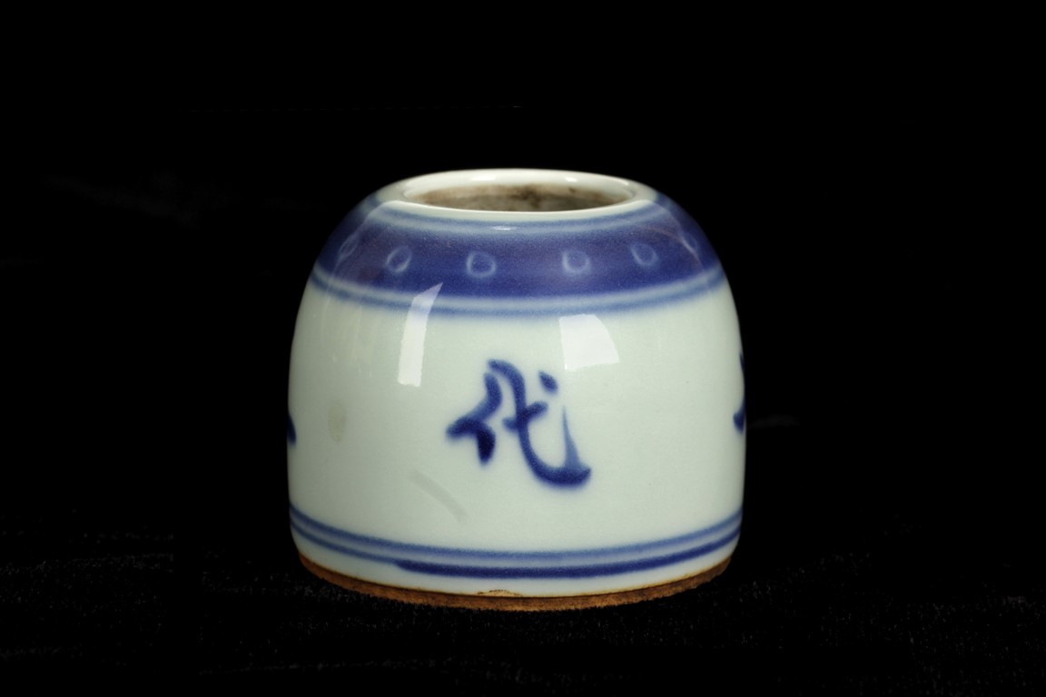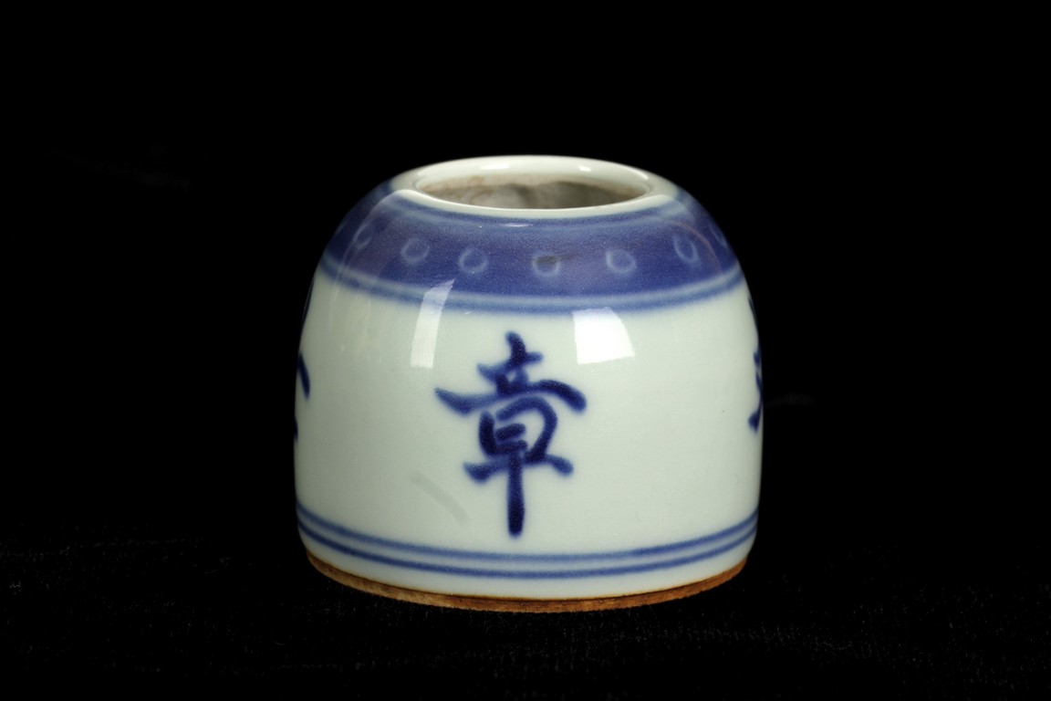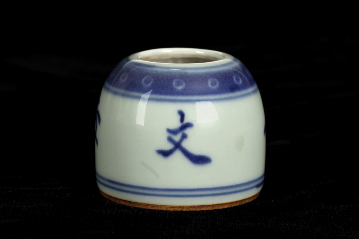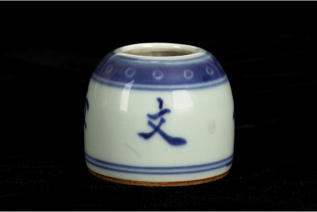 19th century. Of dome shape, the blue and white brush washer depicts four Chinese characters on the body, between scrolling double line patterns and scrolling band of round dots, the bottom with double ring pattern.