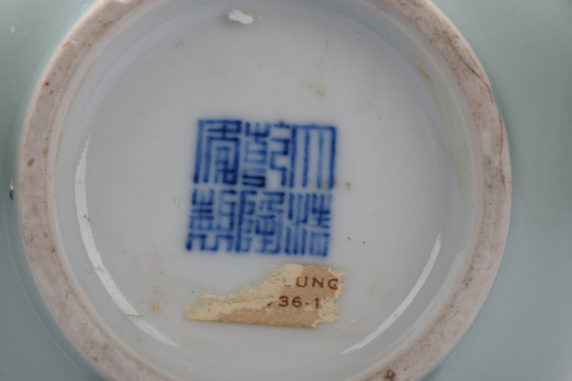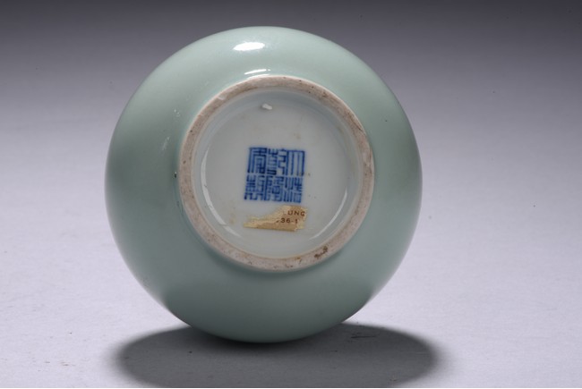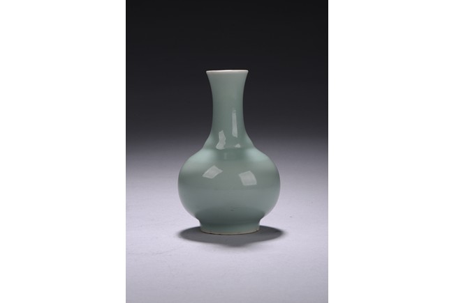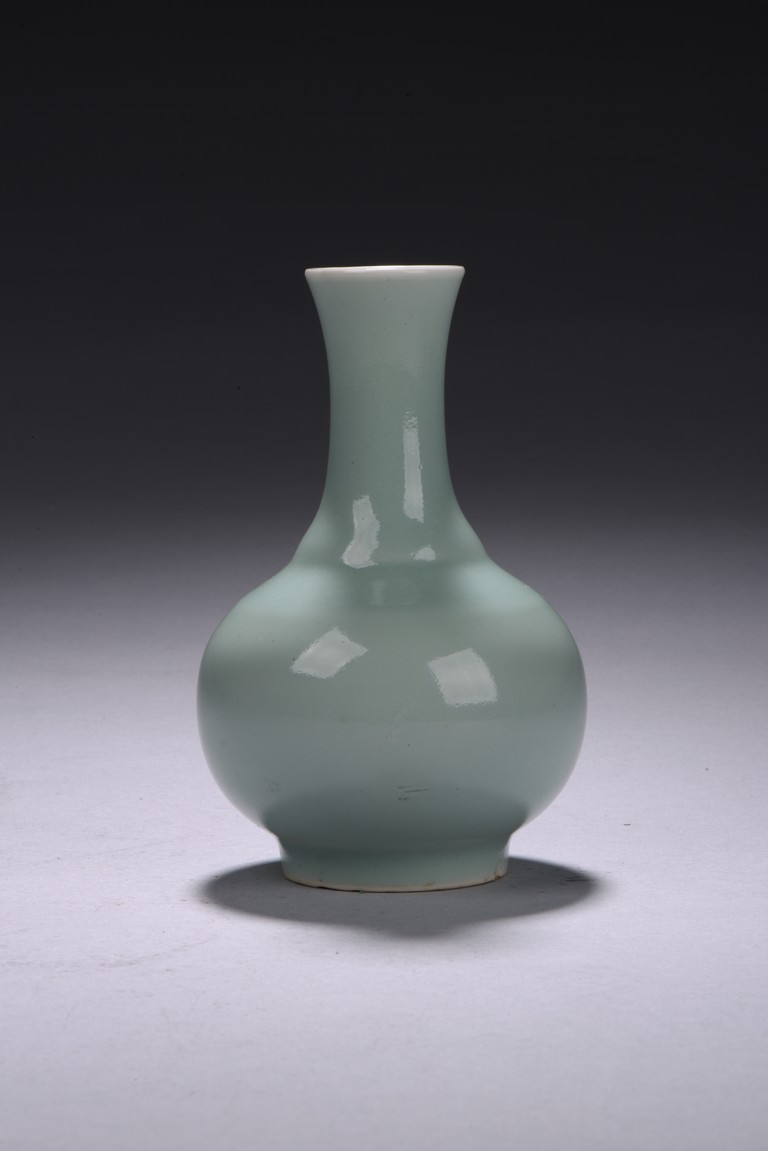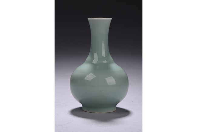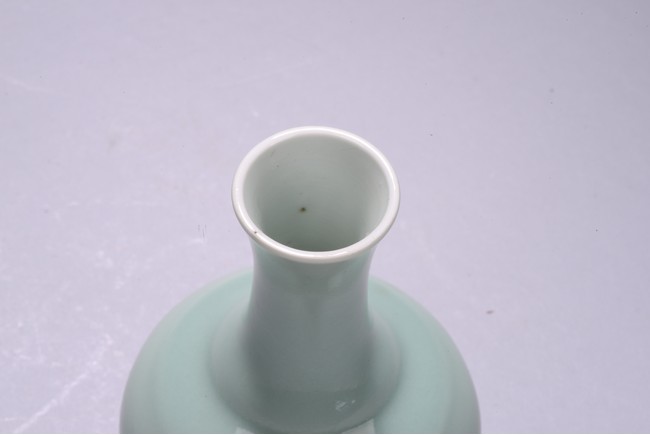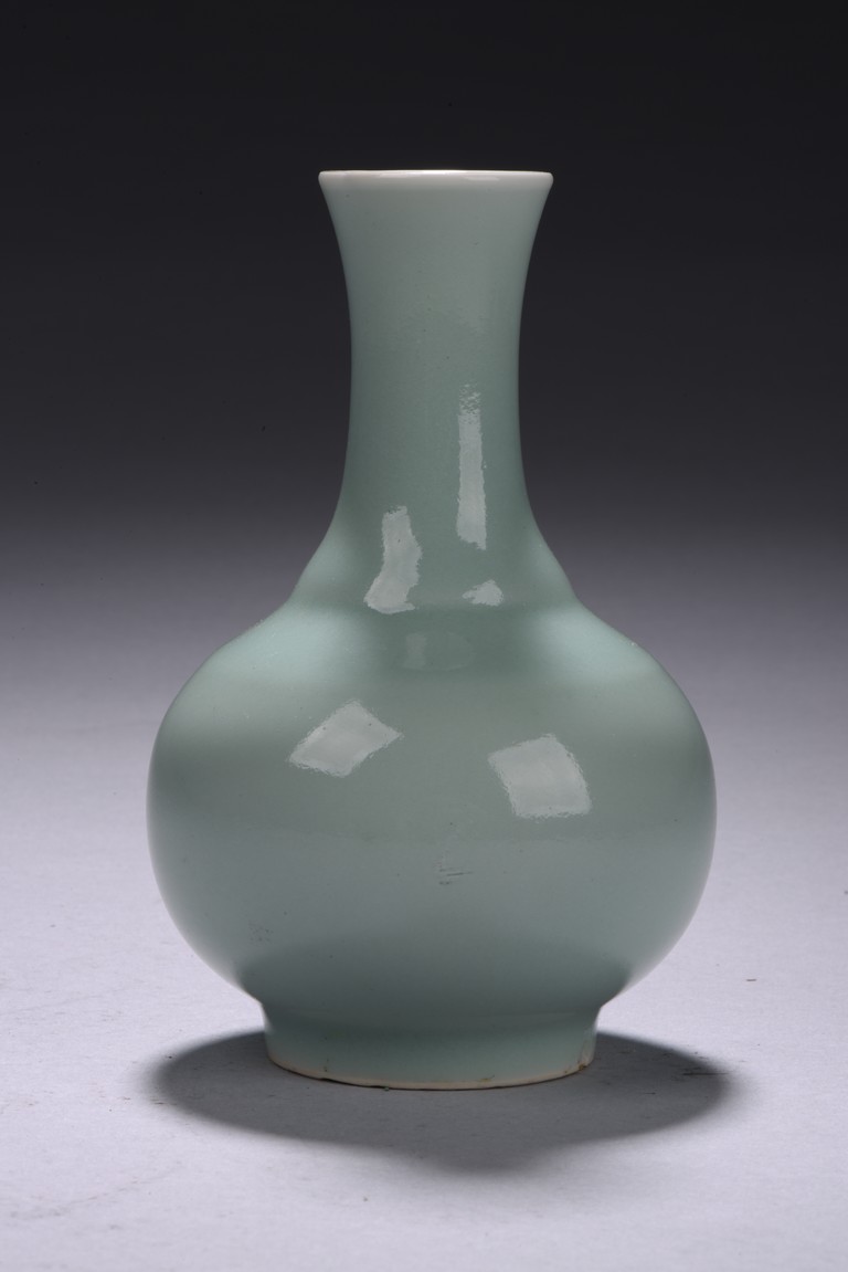 Qing Dynasty period.Of compressed globular shape, the vase raised on short circular foot with a long cylindrical neck with slightly flared rim, overall covered with celadon glaze. The base bears a six character mark.