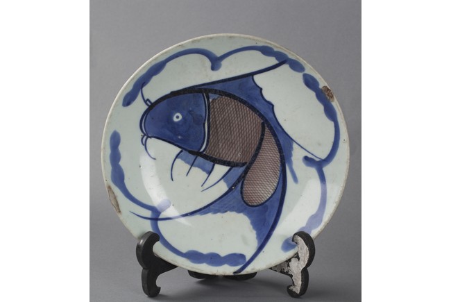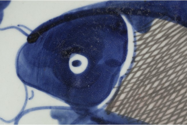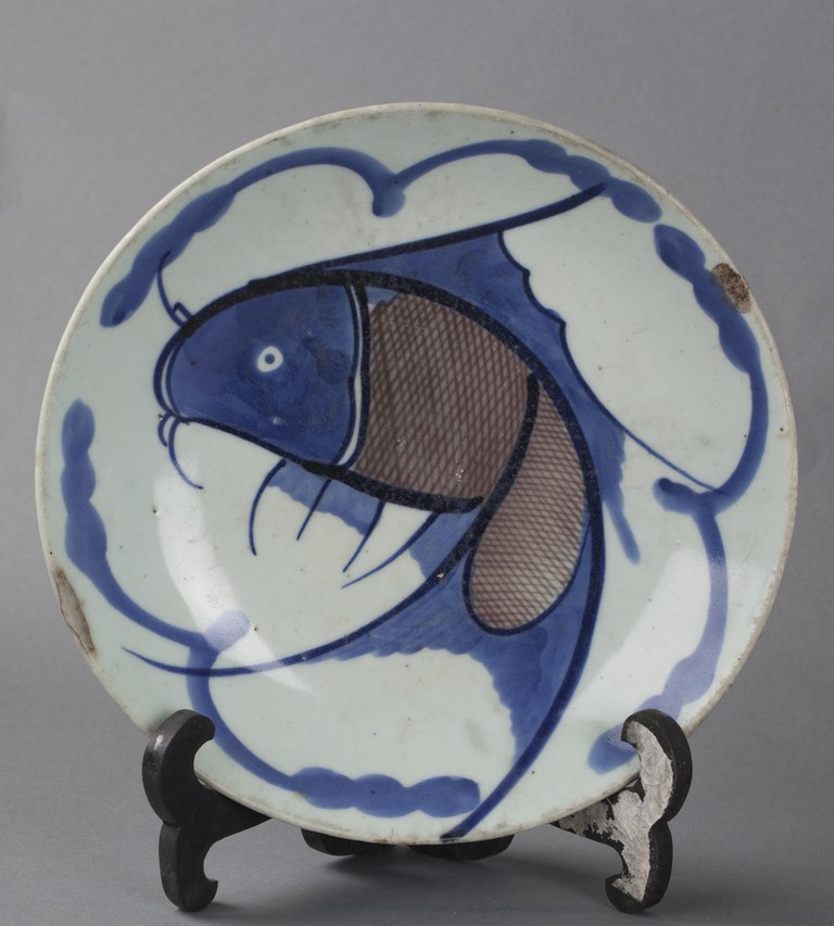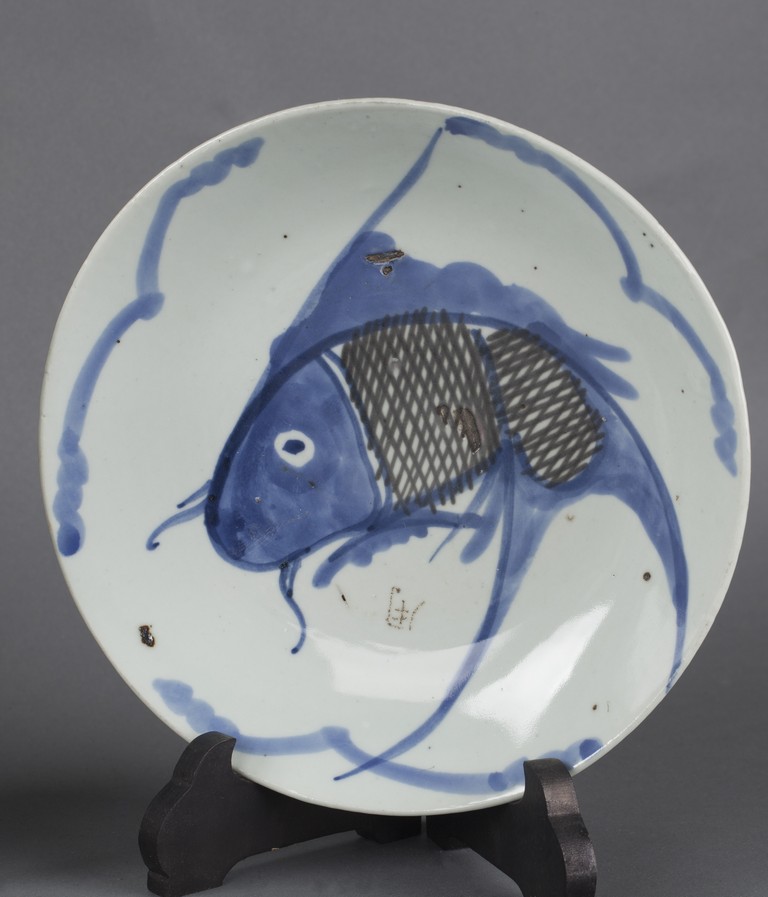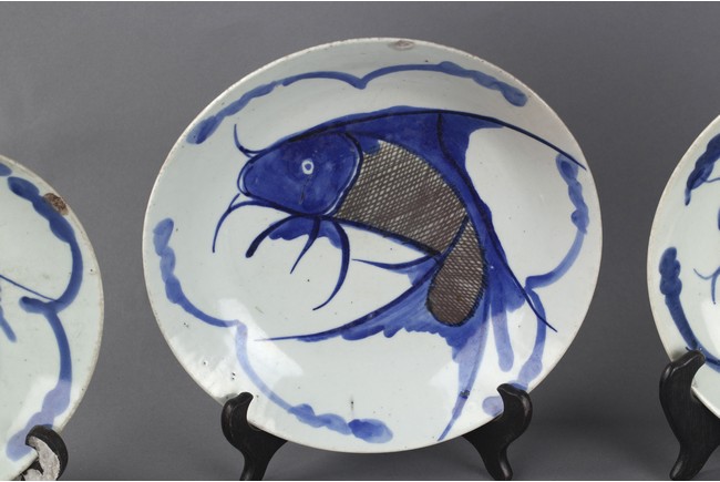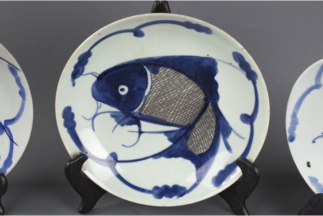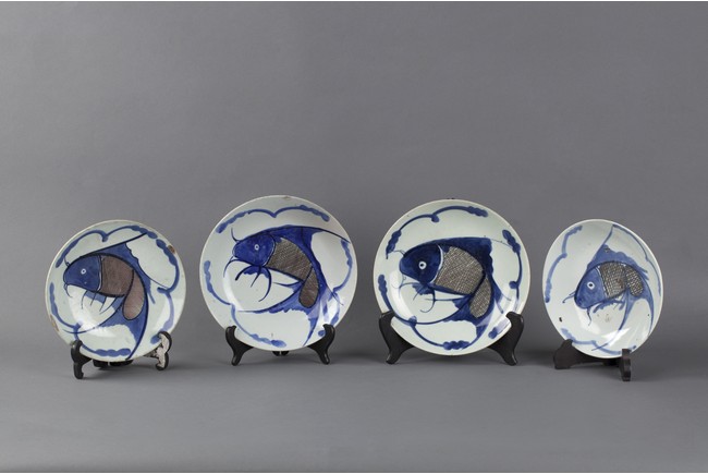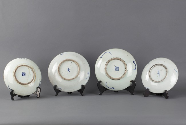 A set of four blue and white dishes depicting a carp in turning motion, each with its own stand and different marks on the back.