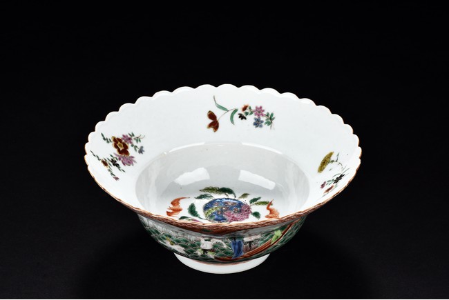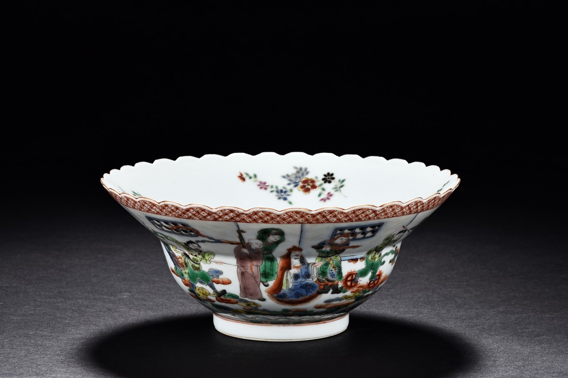 Potted with sides rising to widely flared rim, the body finely enamelled with continuous scene of historical stories, the bottom bears apocryphal six character 'Qianlong' mark.