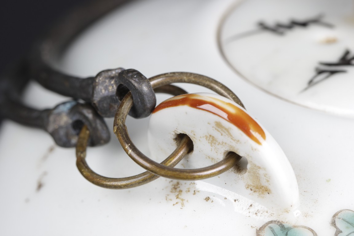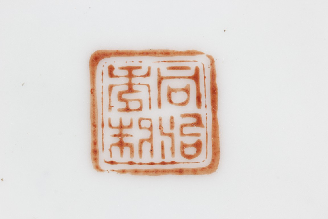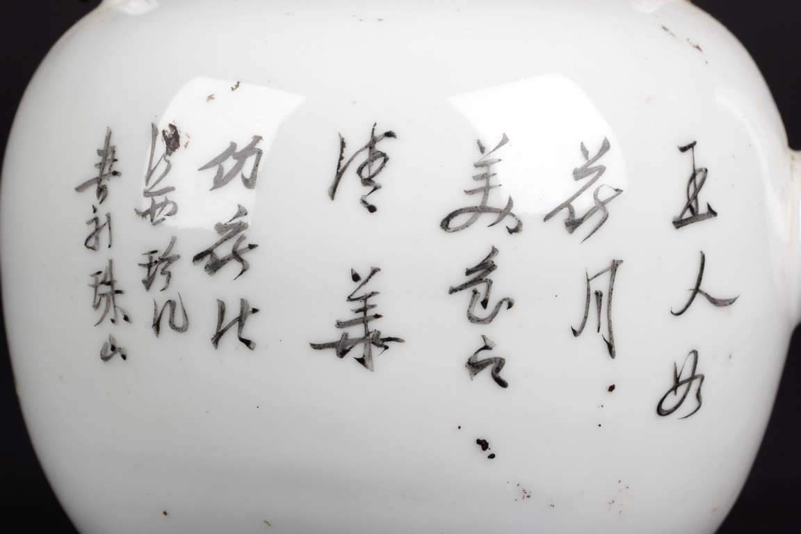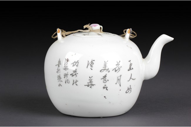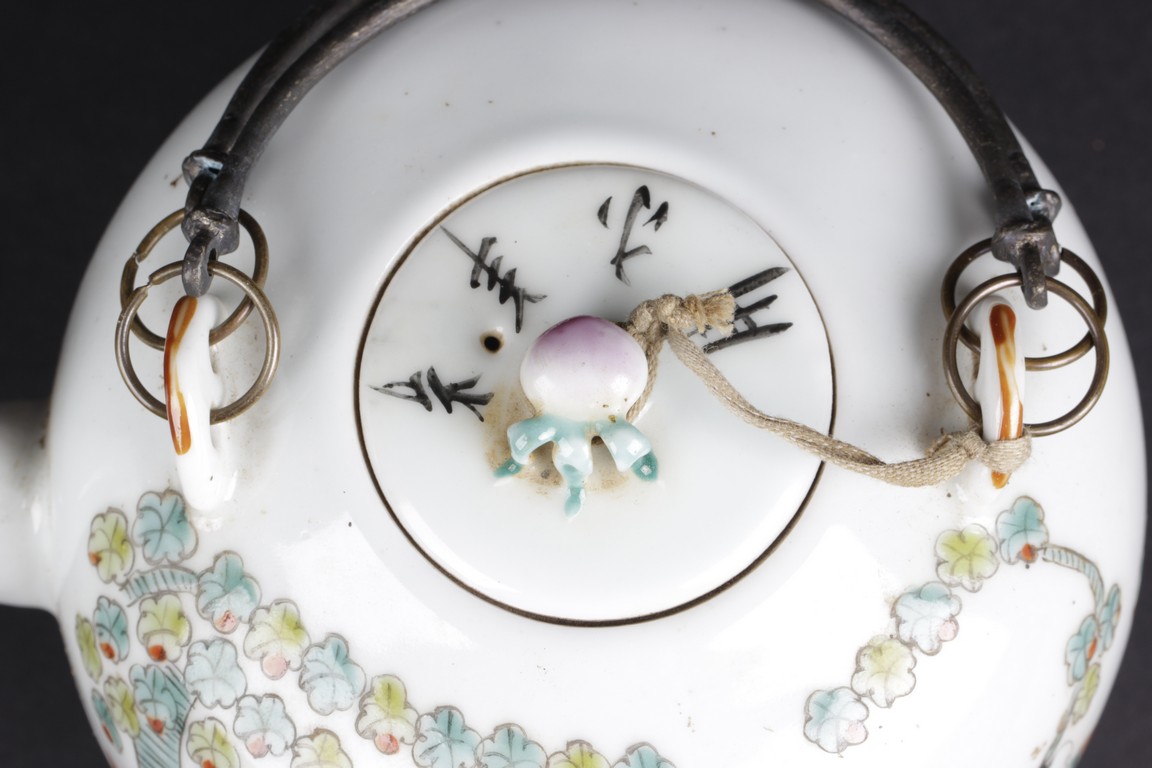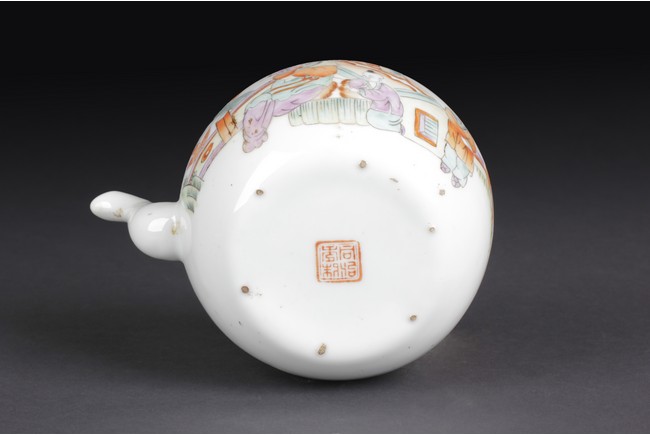 19th century. Of globular form, the teapot's exterior painted a mother with a baby and two kids in a garden scene, with a Chinese poem and artist signature on the back, the high shoulder with two arched handles, the cover with a pear shaped knop, and bottom bears four character seal.