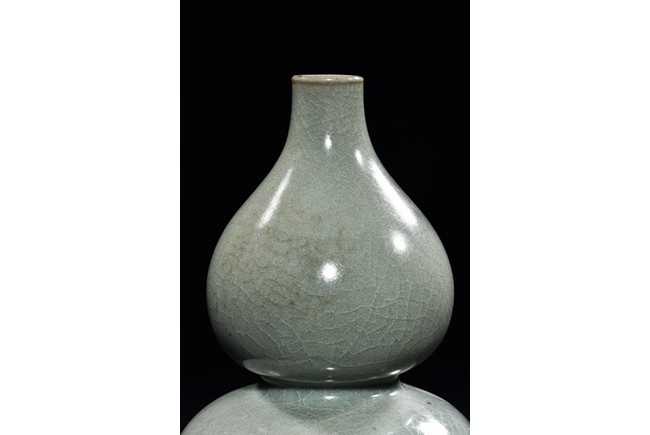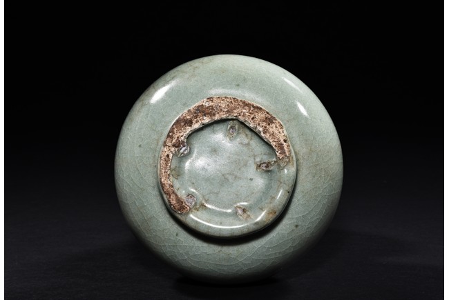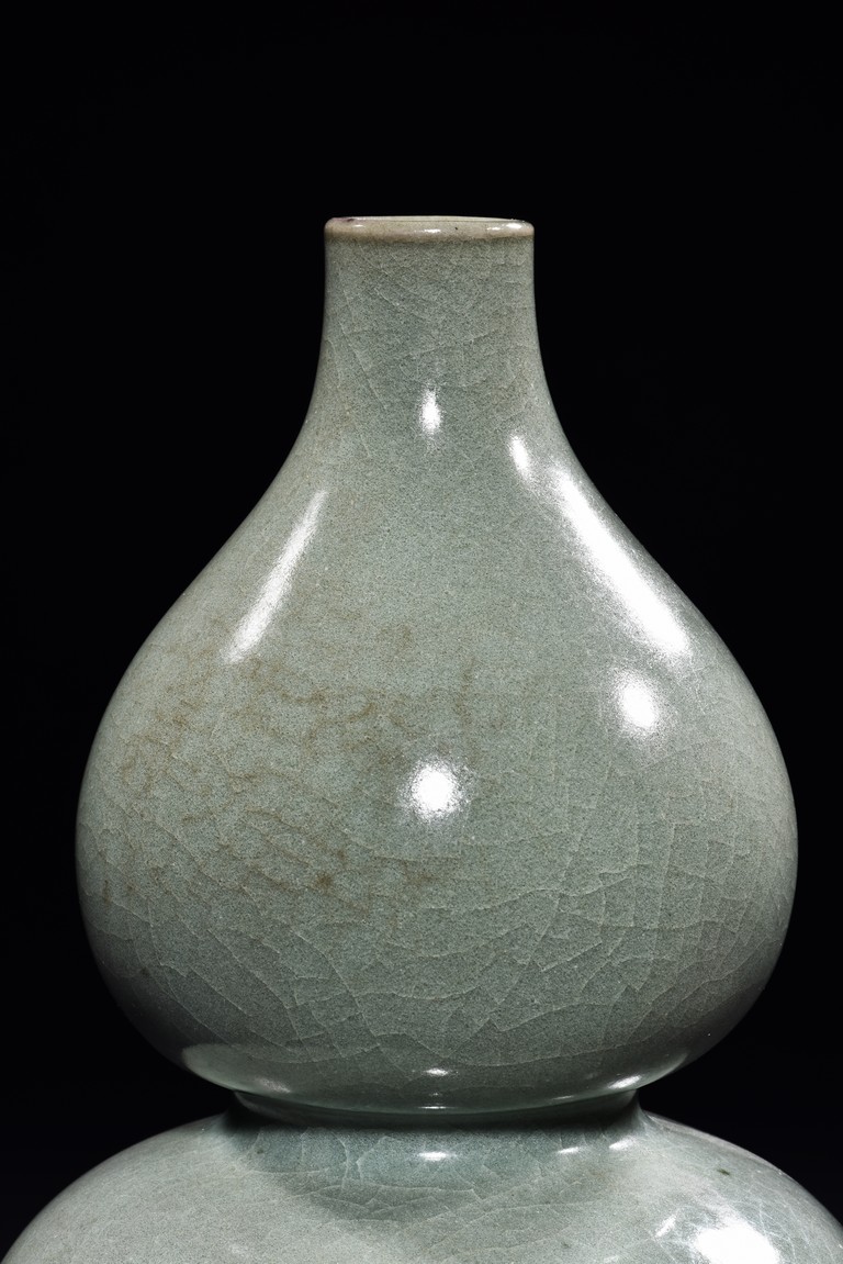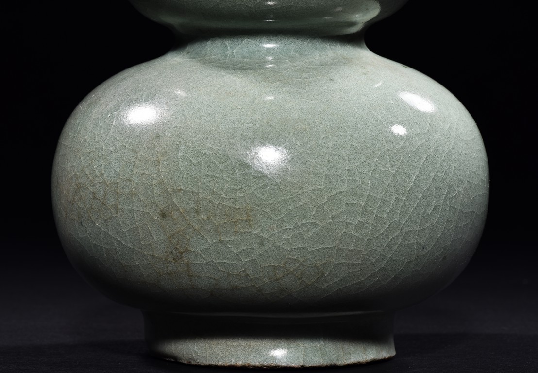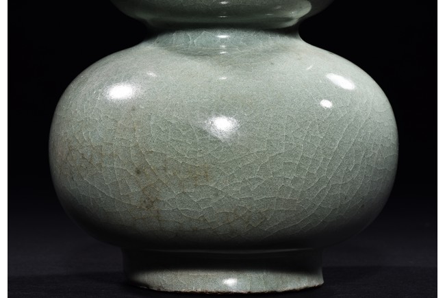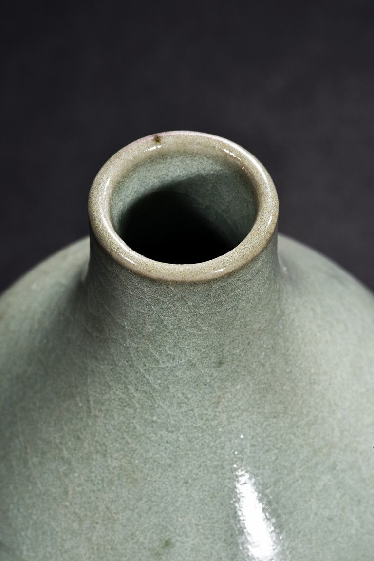 Possibly Ming Dynasty period (16th/17th C.) With bulbous lower body and upper body tapering to a narrow neck, the exterior covered in a glaze of celadon green tone with fine cracklings.