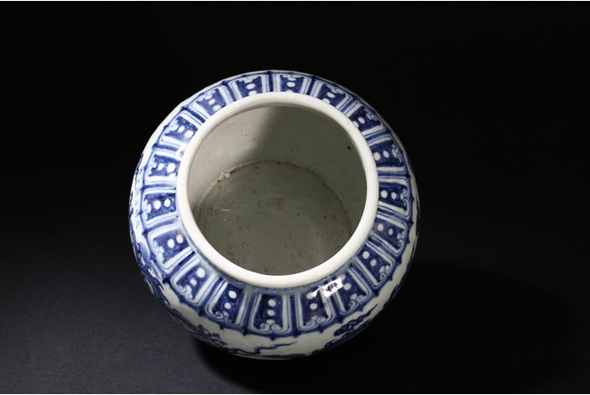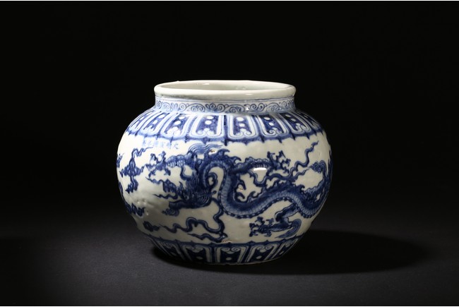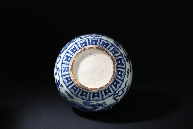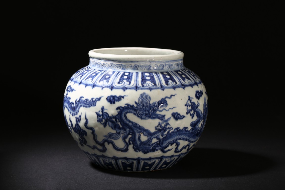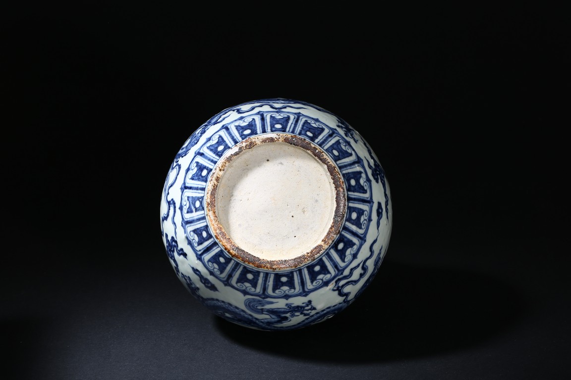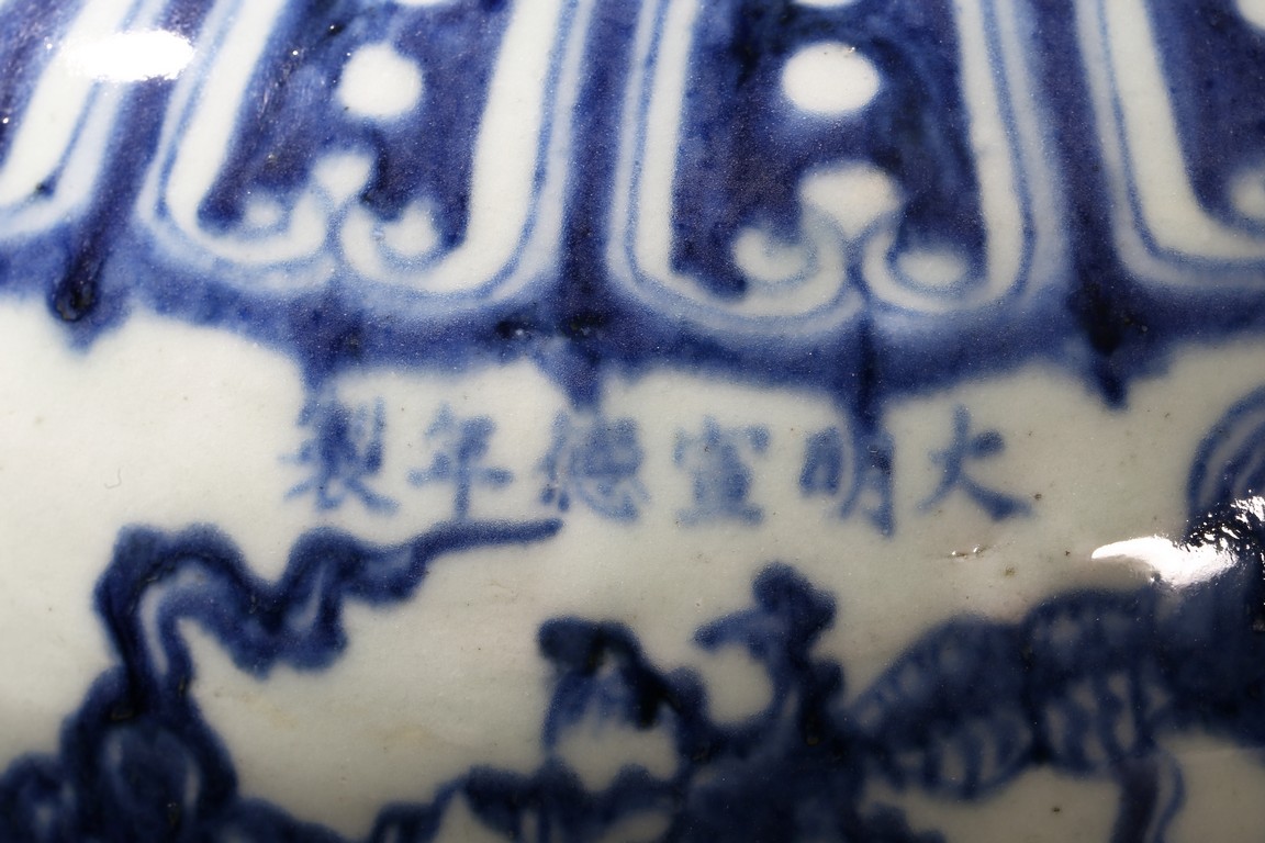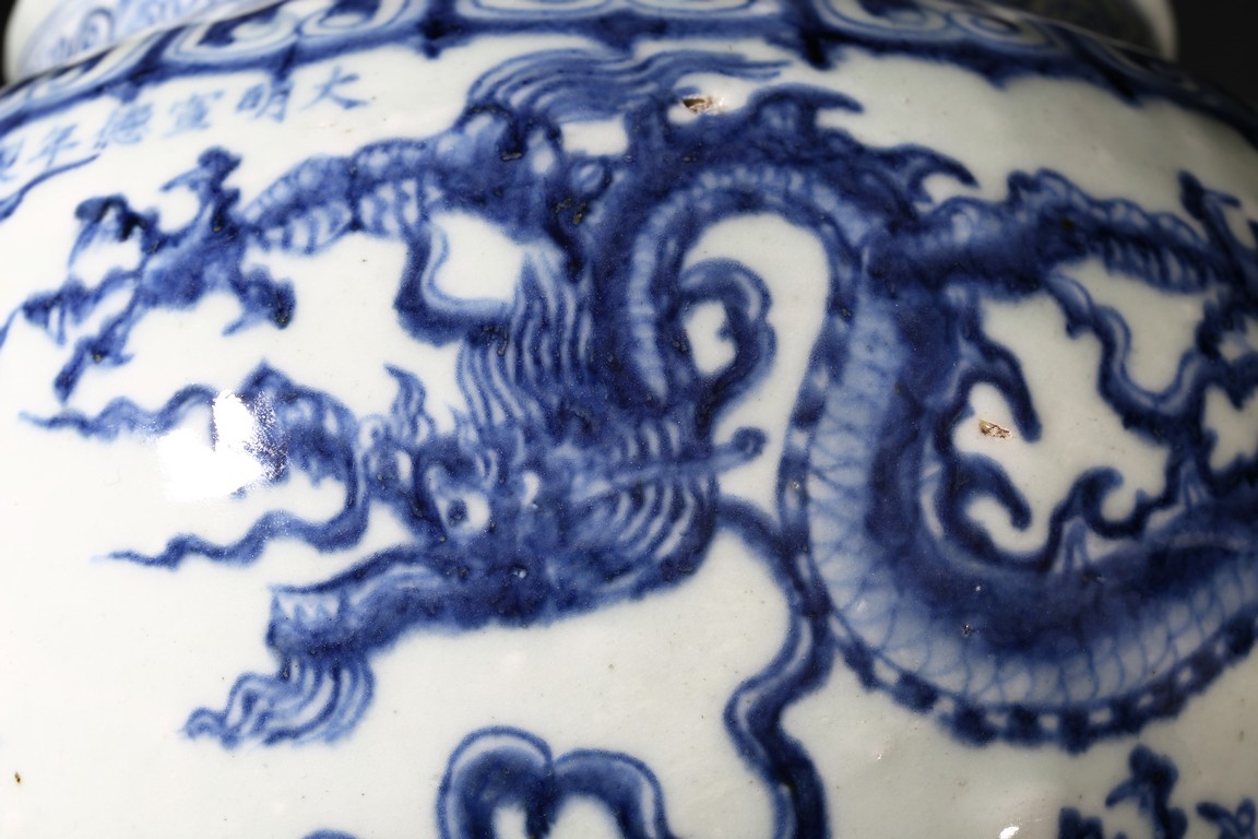 Body decorated with five clawed ferocious dragon with sinuous body chasing flaming pearl, flanked by two lappet bands around shoulder and base, with six apocryphal character Xuande above the dragon.
