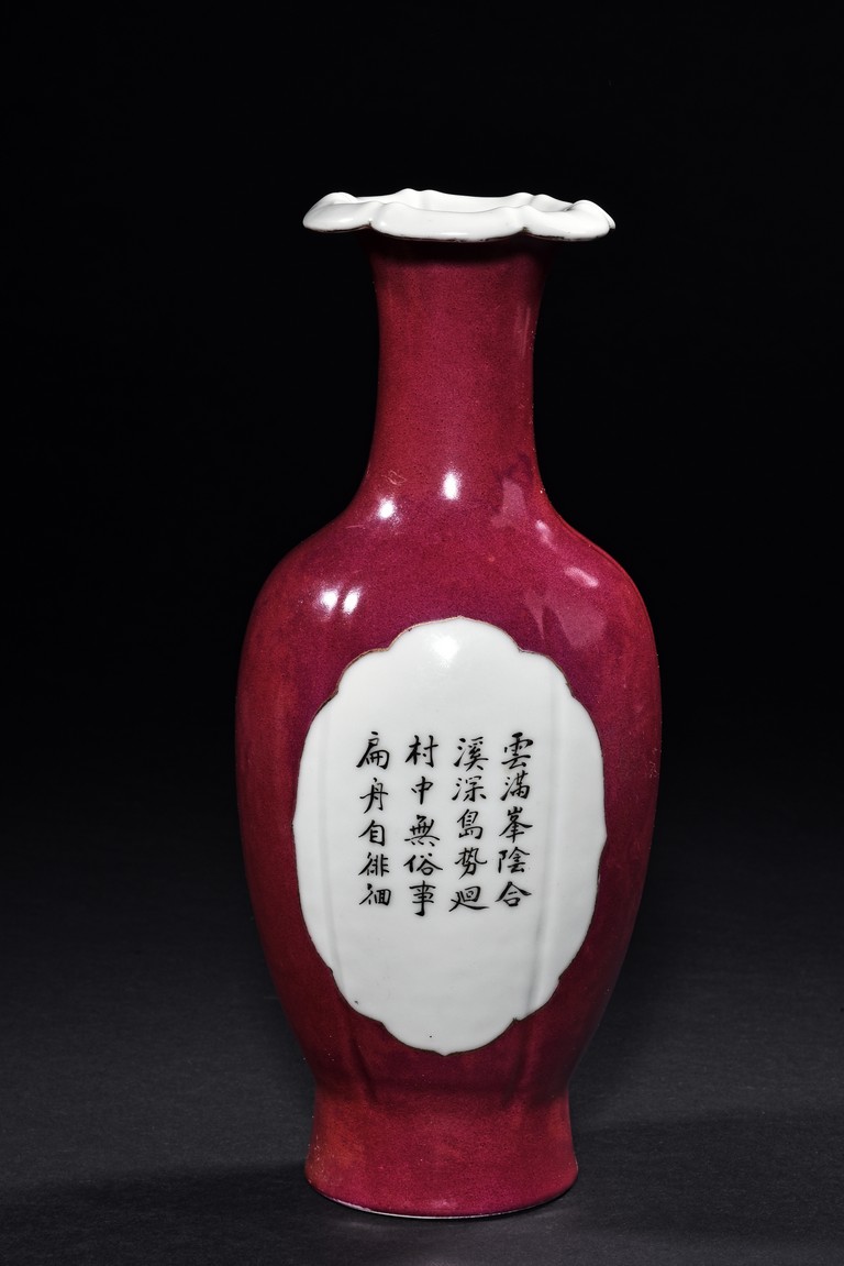 Qing Dynasty period. The vase rises to a widely flared rim with six lobes, the body covered in red glaze with two medallions on both sides enclosing a landscape scene and semi-cursive poem. The bottom bears four character mark 'hua sheng zhen pin'.
