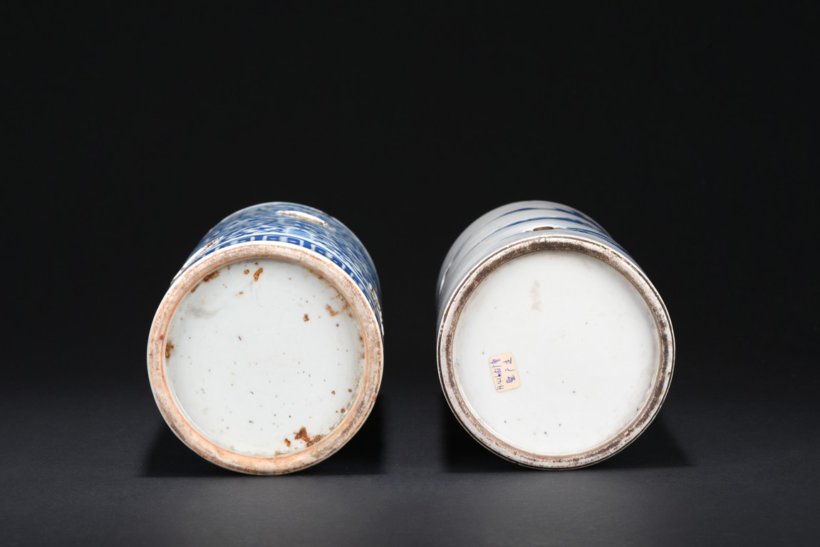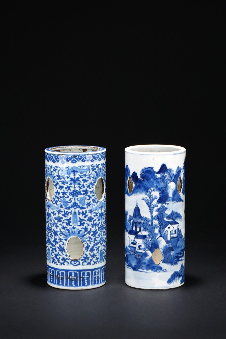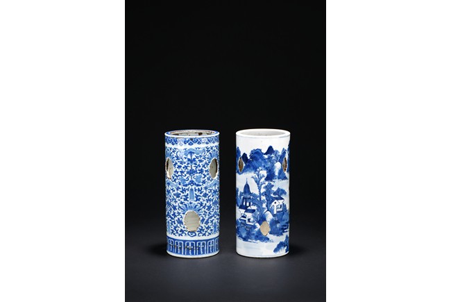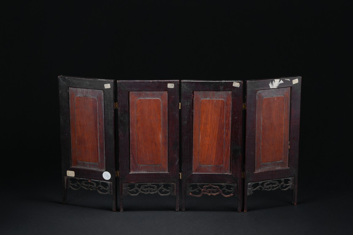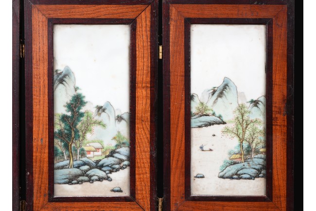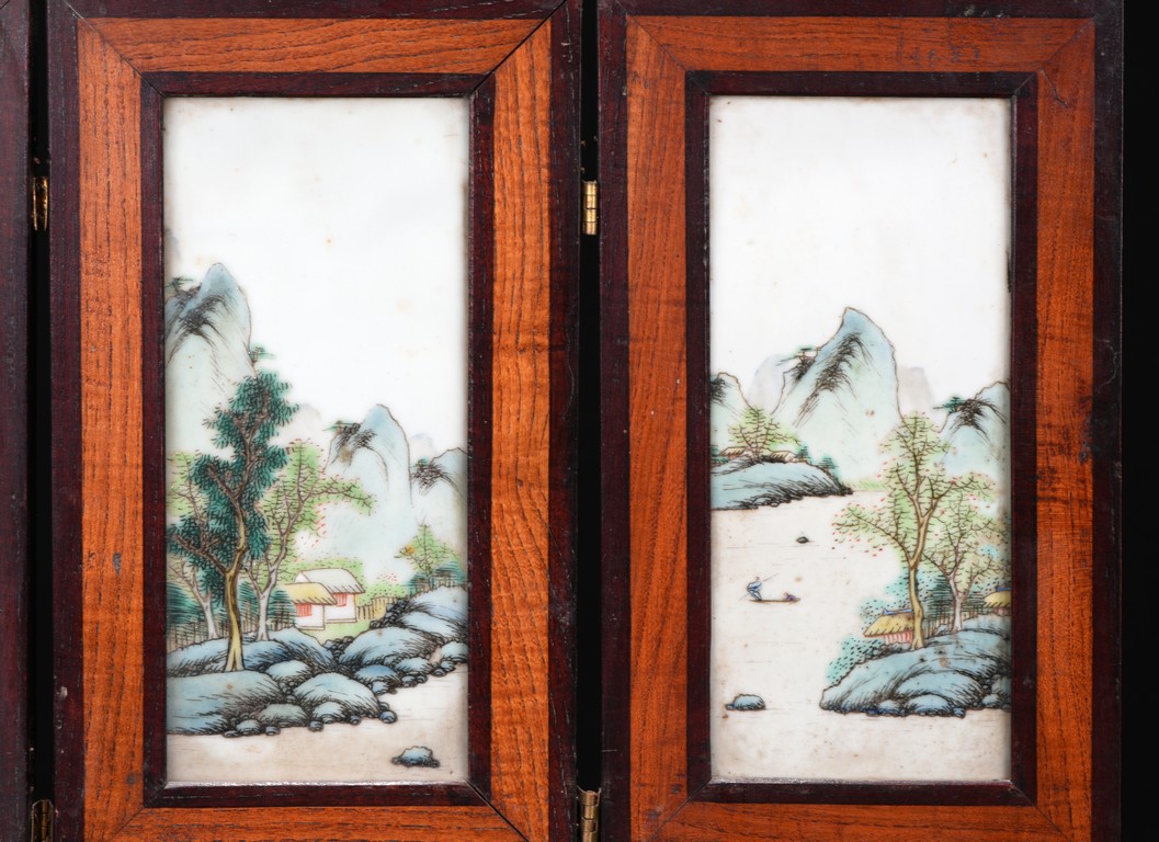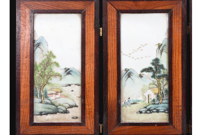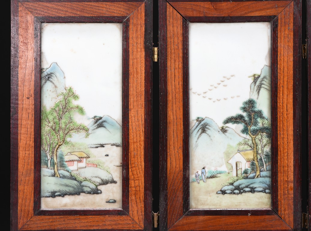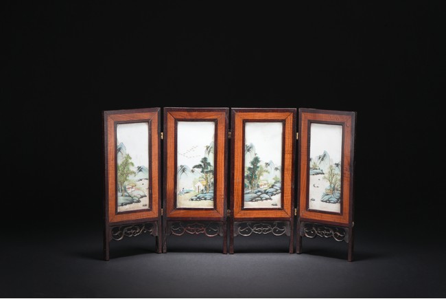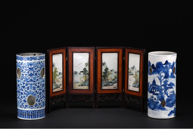 19th Century. The set including a famille rose four-panel screen and two white and blue porcelain vases. The wood screen bottom finely carved with hollowed scrolled pattern, each panel beautifully depicting mountains setting with figures and houses. One vase beautifully decorated with scrolled foilate and strands of Chinese knot in blue glaze between ruyi band and geometric pattern band. Another skillfully depicting three mountains in vertically order.