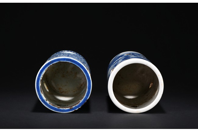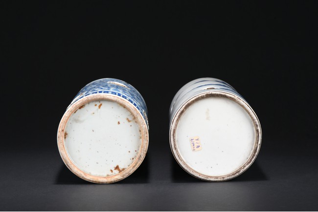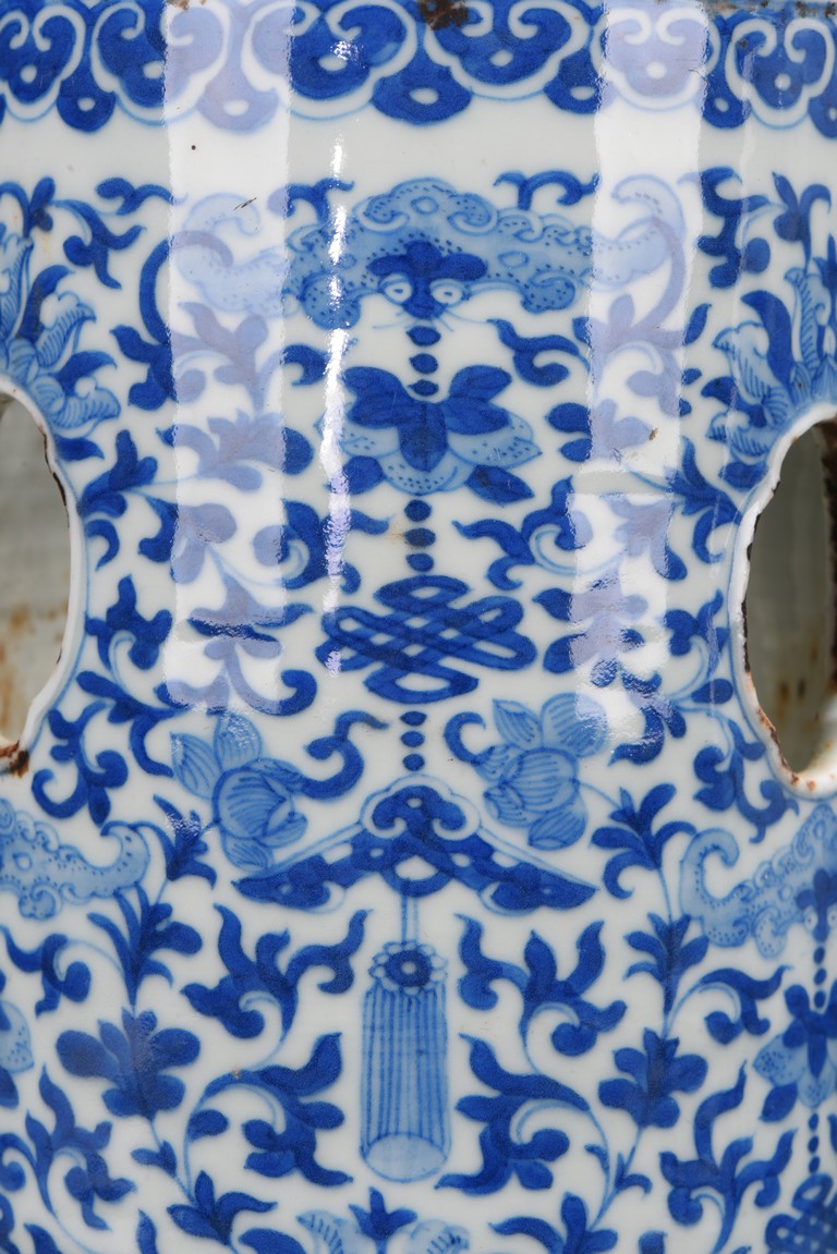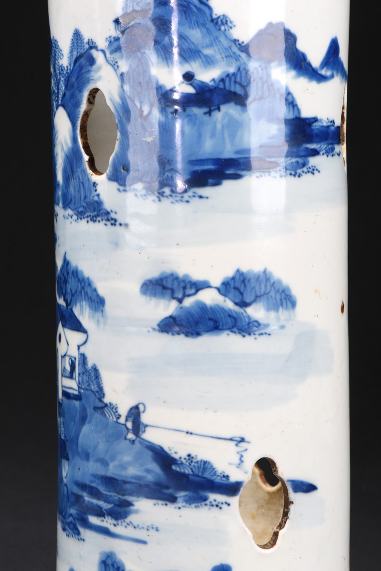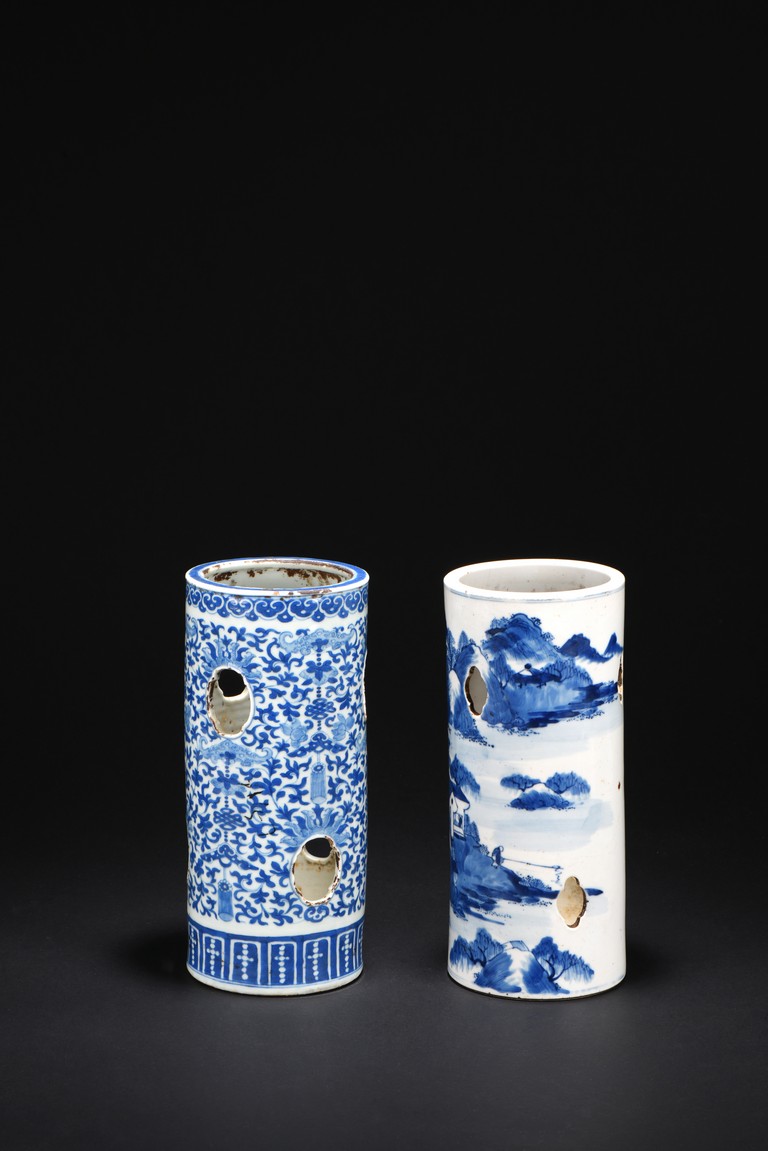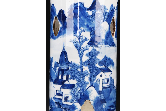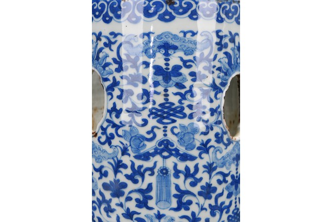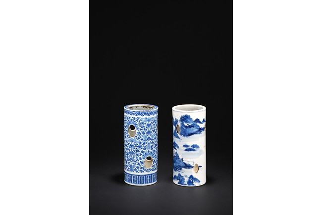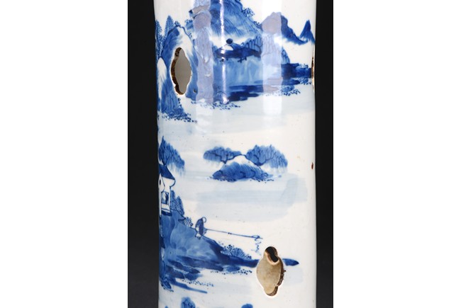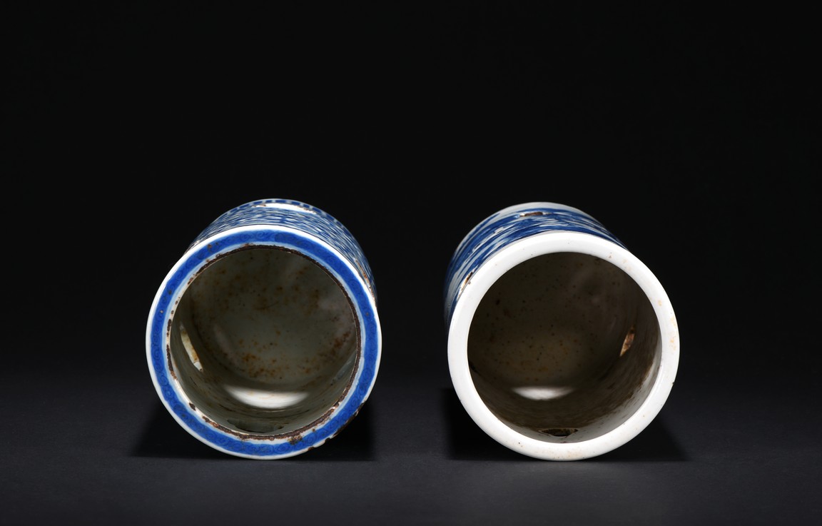 19th Century. The set including a famille rose four-panel screen and two white and blue porcelain vases. The wood screen bottom finely carved with hollowed scrolled pattern, each panel beautifully depicting mountains setting with figures and houses. One vase beautifully decorated with scrolled foilate and strands of Chinese knot in blue glaze between ruyi band and geometric pattern band. Another skillfully depicting three mountains in vertically order.