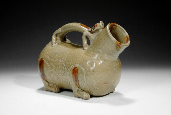 Possibly Western Jin Dynasty (266–420 A.D) well-modeled as a recumbent winged lion, and detailed with combed, impressed and applied decoration, forming a large aperture, and a chilong arched at the top to form a loop handle, all under a thin olive-green glaze.