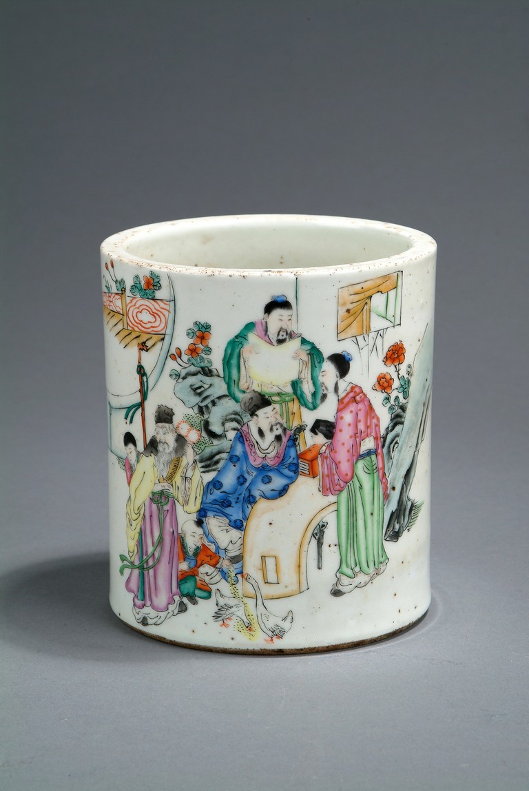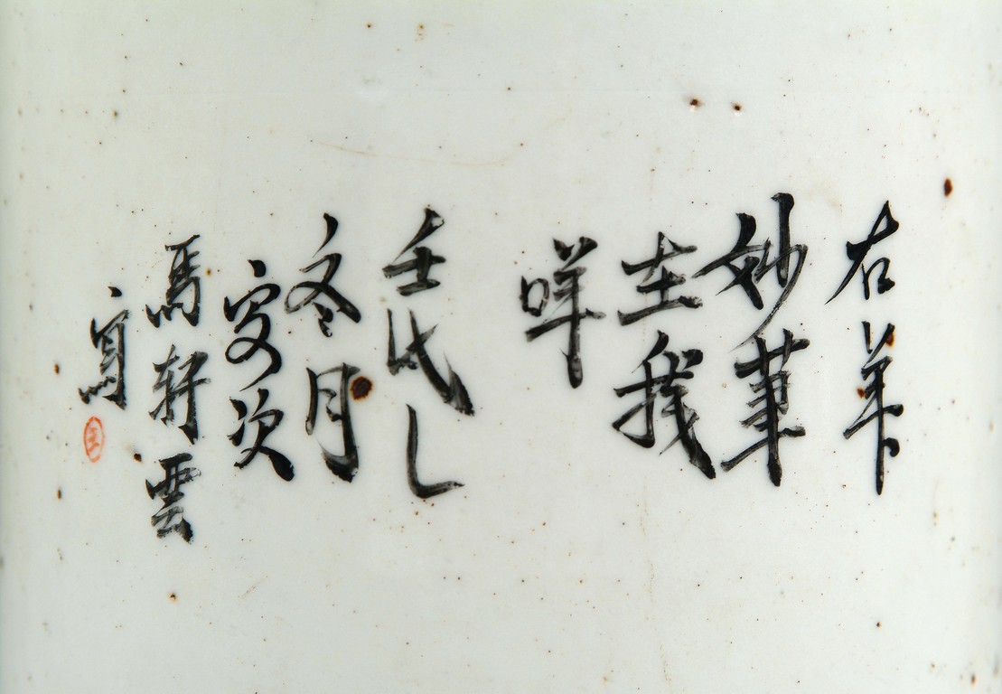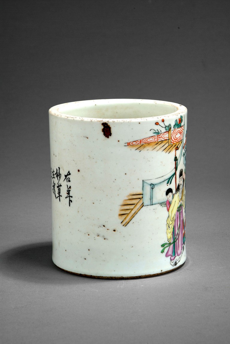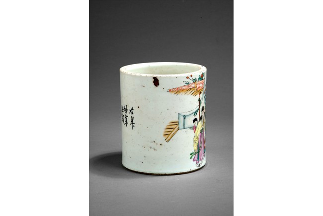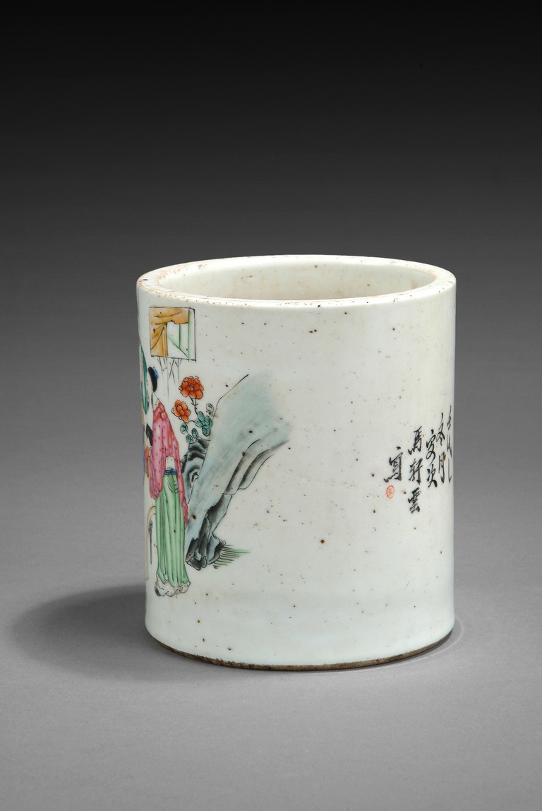 Early 20th C. Of cylindrical shape, enameled around the exterior with a scene that depicts a few scholars and a child gathered in a garden setting, a set of calligraphy and artist seal on the back, all reserved on an white ground with a four character 'MAYUNXUAN' mark on the bottom.
