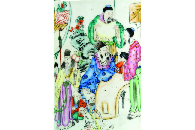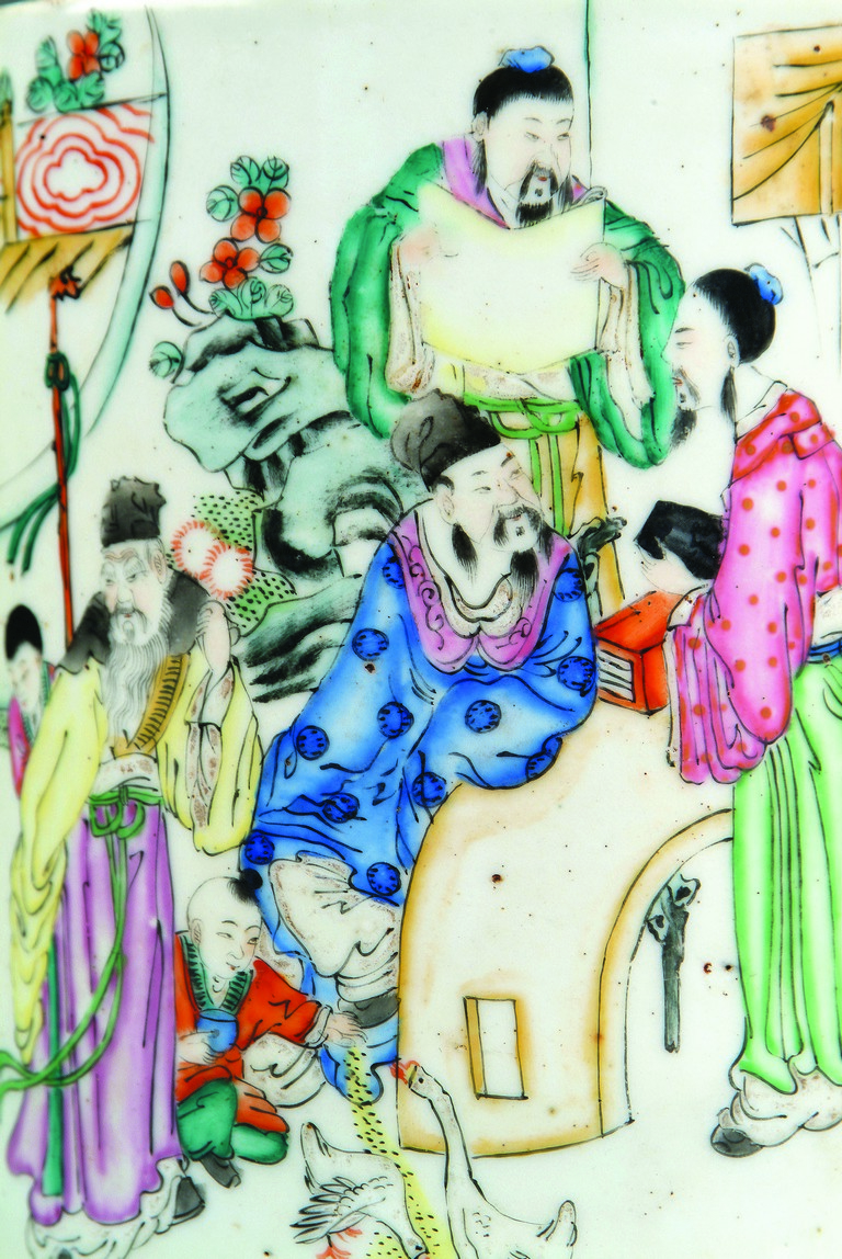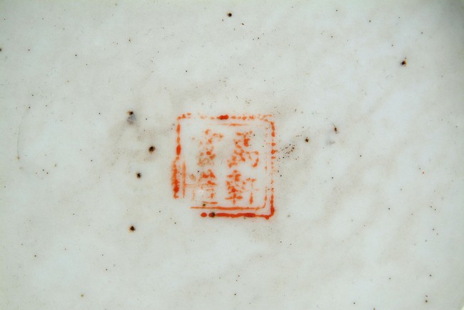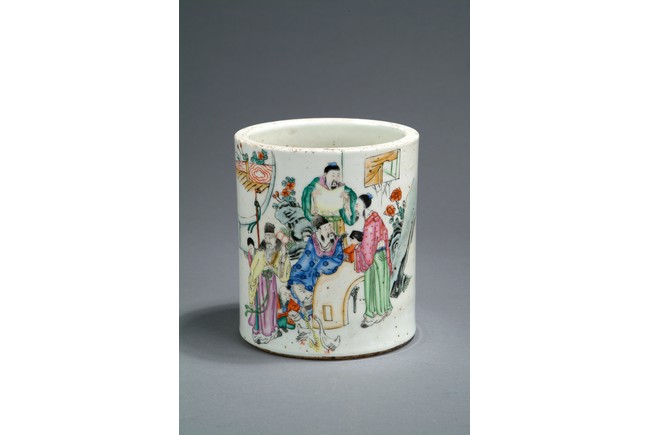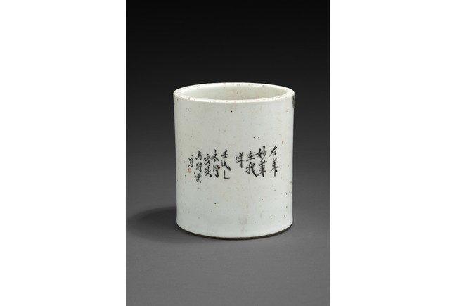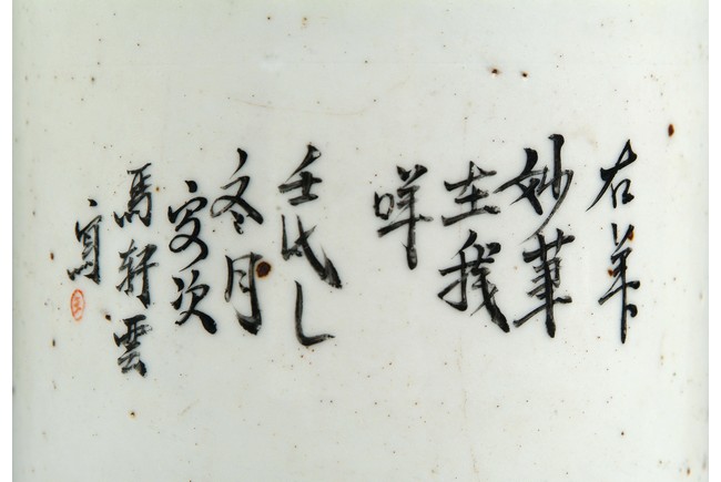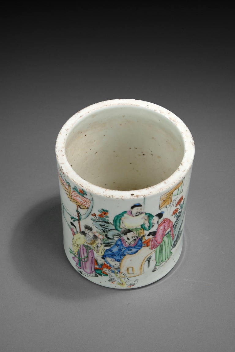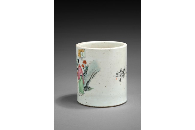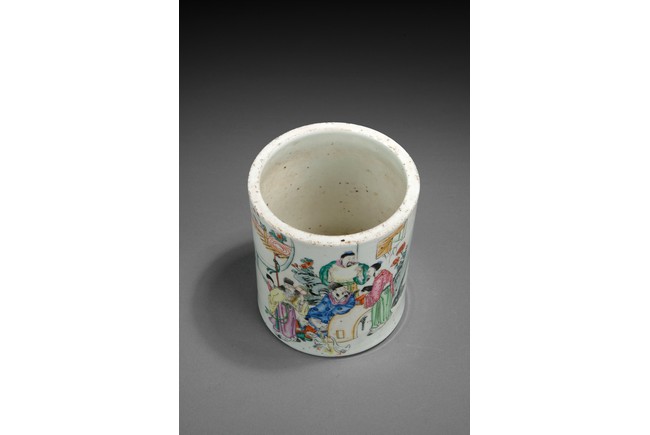 Early 20th C. Of cylindrical shape, enameled around the exterior with a scene that depicts a few scholars and a child gathered in a garden setting, a set of calligraphy and artist seal on the back, all reserved on an white ground with a four character 'MAYUNXUAN' mark on the bottom.